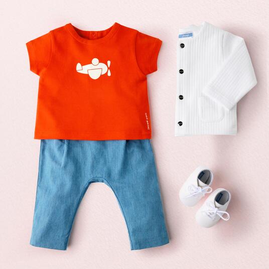 Ideata per essere indossata tutti i giorni e facile da abbinare a jeans o salopette, scegli questo modello in interlock morbido e confortevole per la prima maglietta del piccolo. Impreziosito da un aereo effetto laccato e facile da indossare grazie ai bottoni automatici sul retro, il suo colore contemporaneo ti conquisterà.