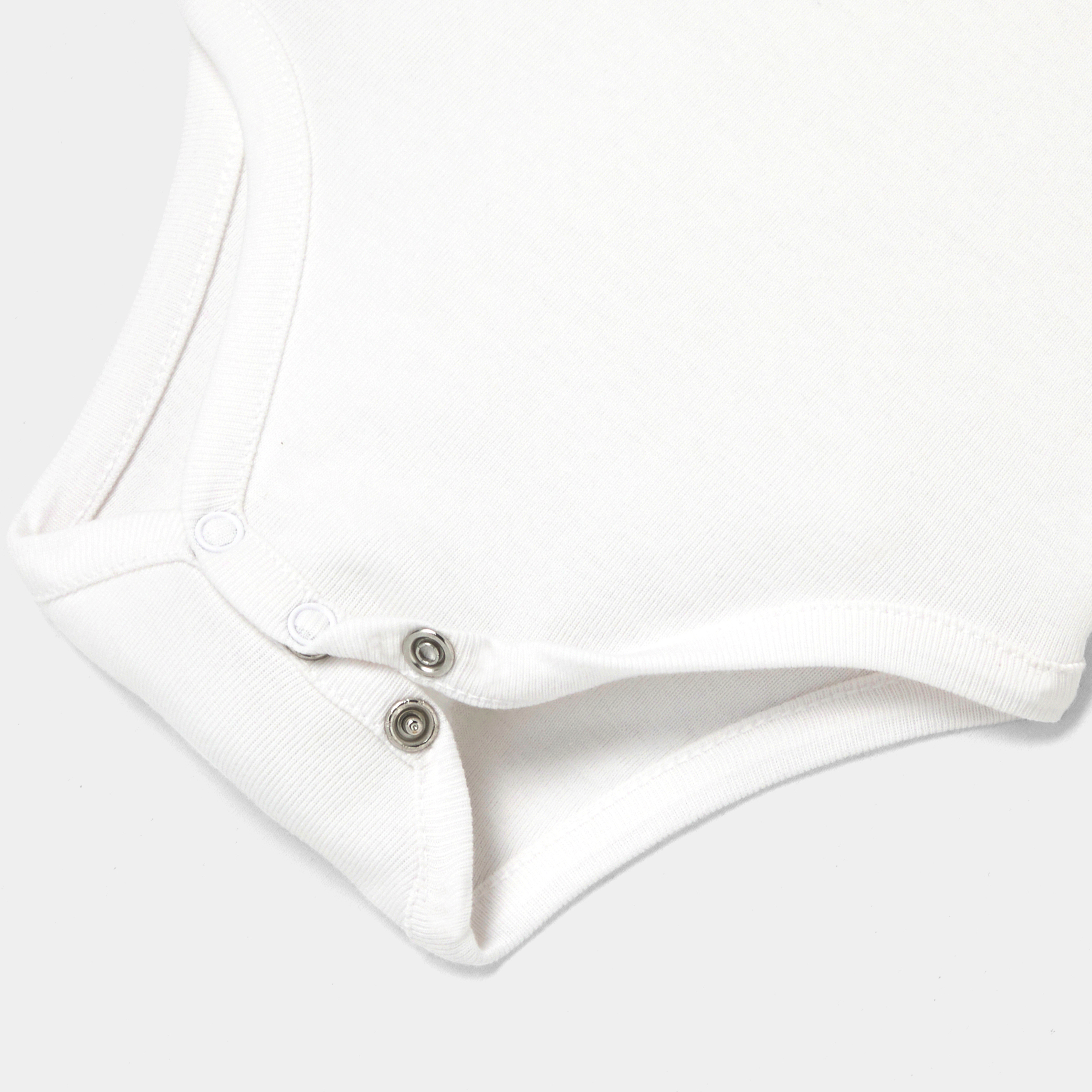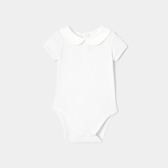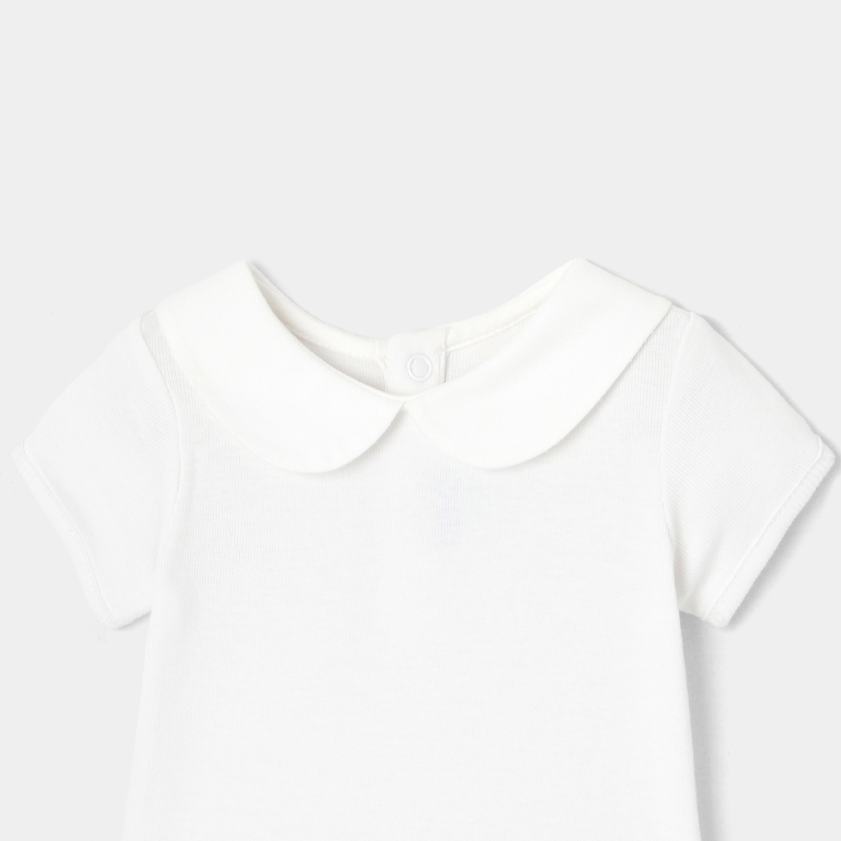 Un classico del guardaroba estivo, il body bimba di questa stagione è arricchito, per l'occasione, da un elegante colletto tondo in piqué di cotone. Semplice ed essenziale, sarà perfetto sotto un pagliaccetto o un abito in tessuto Liberty Fabrics.