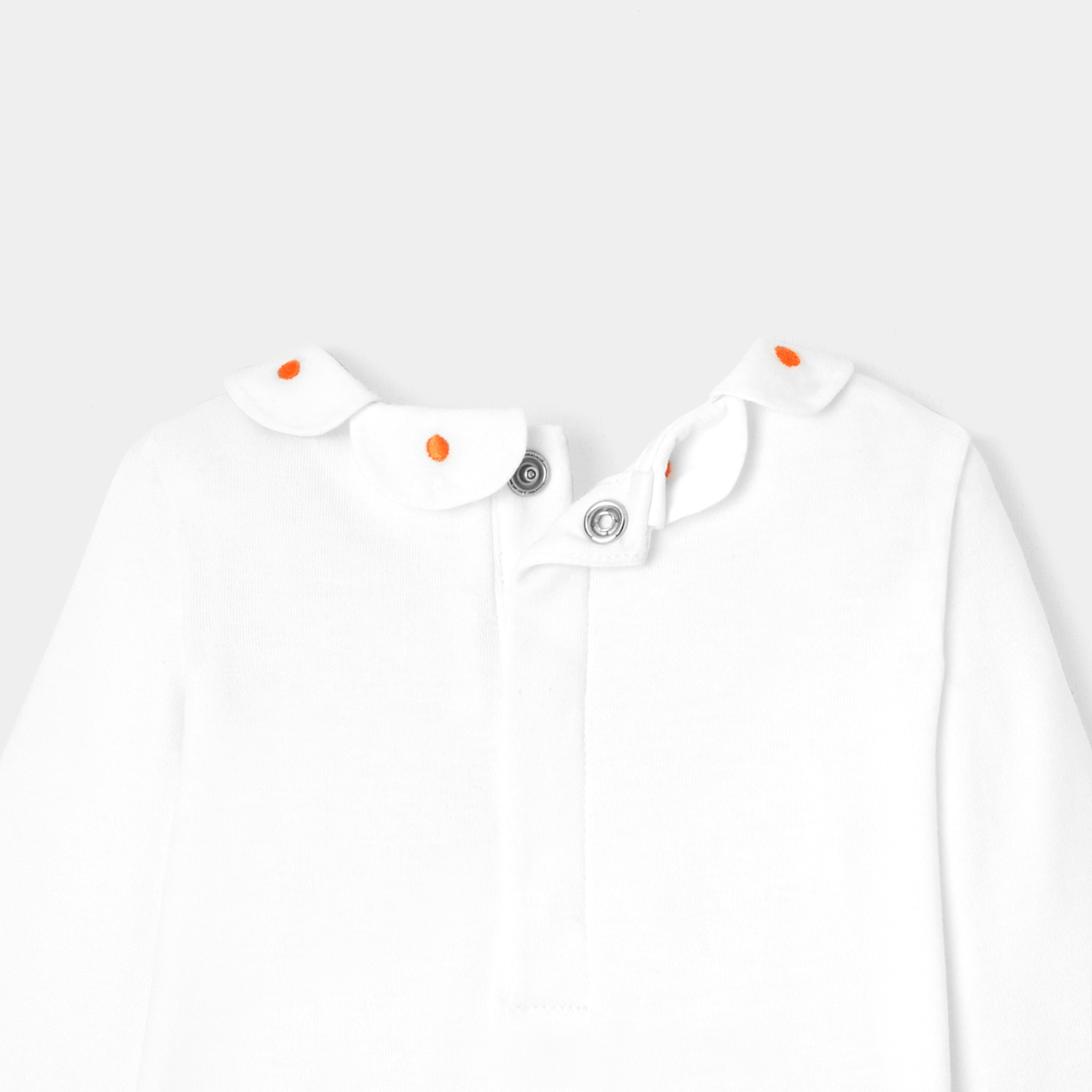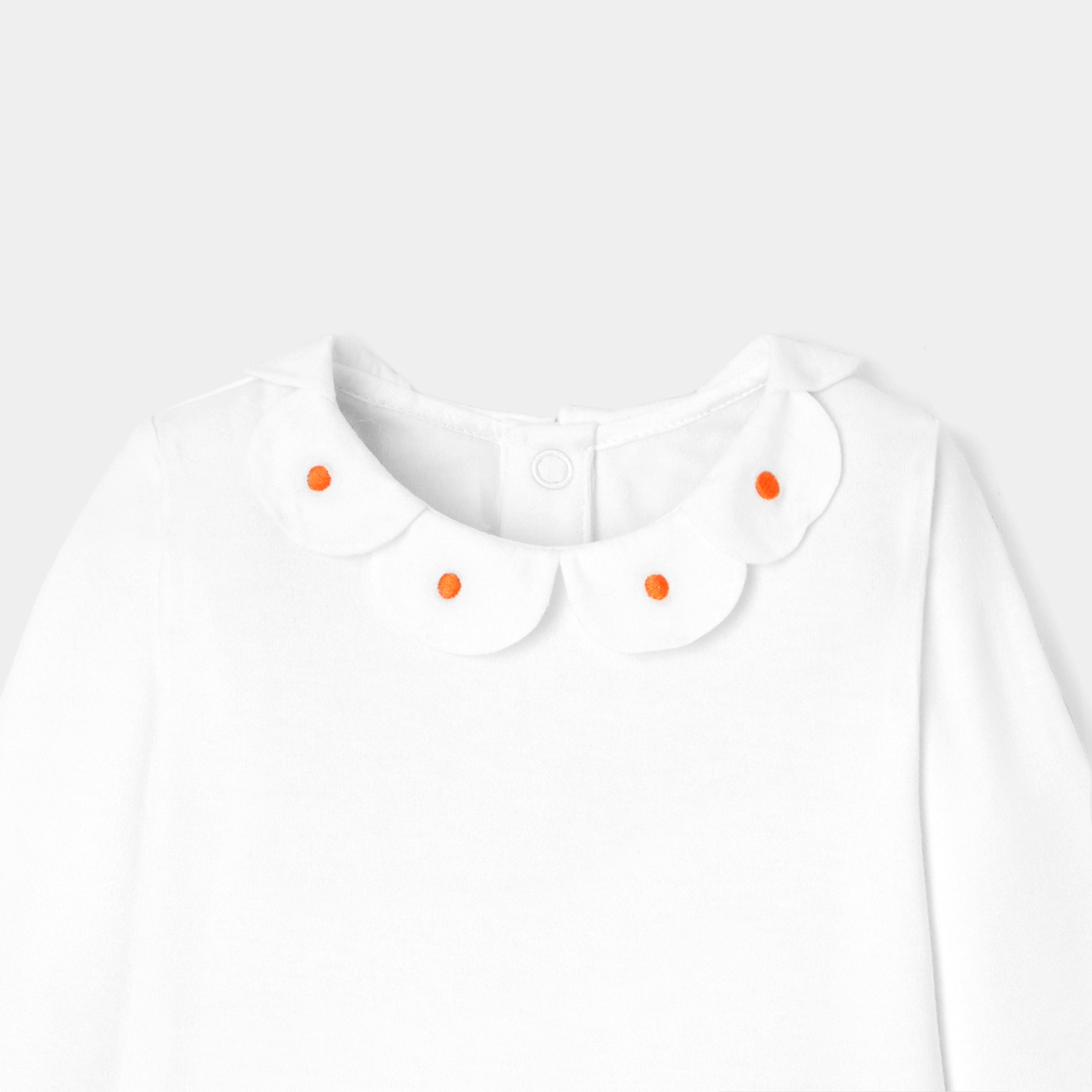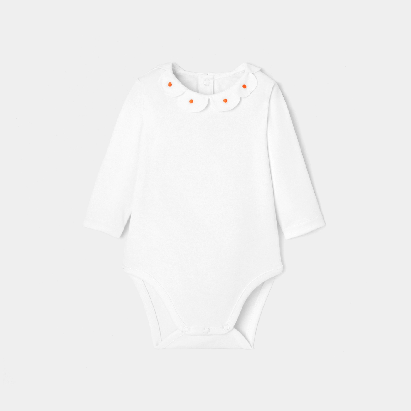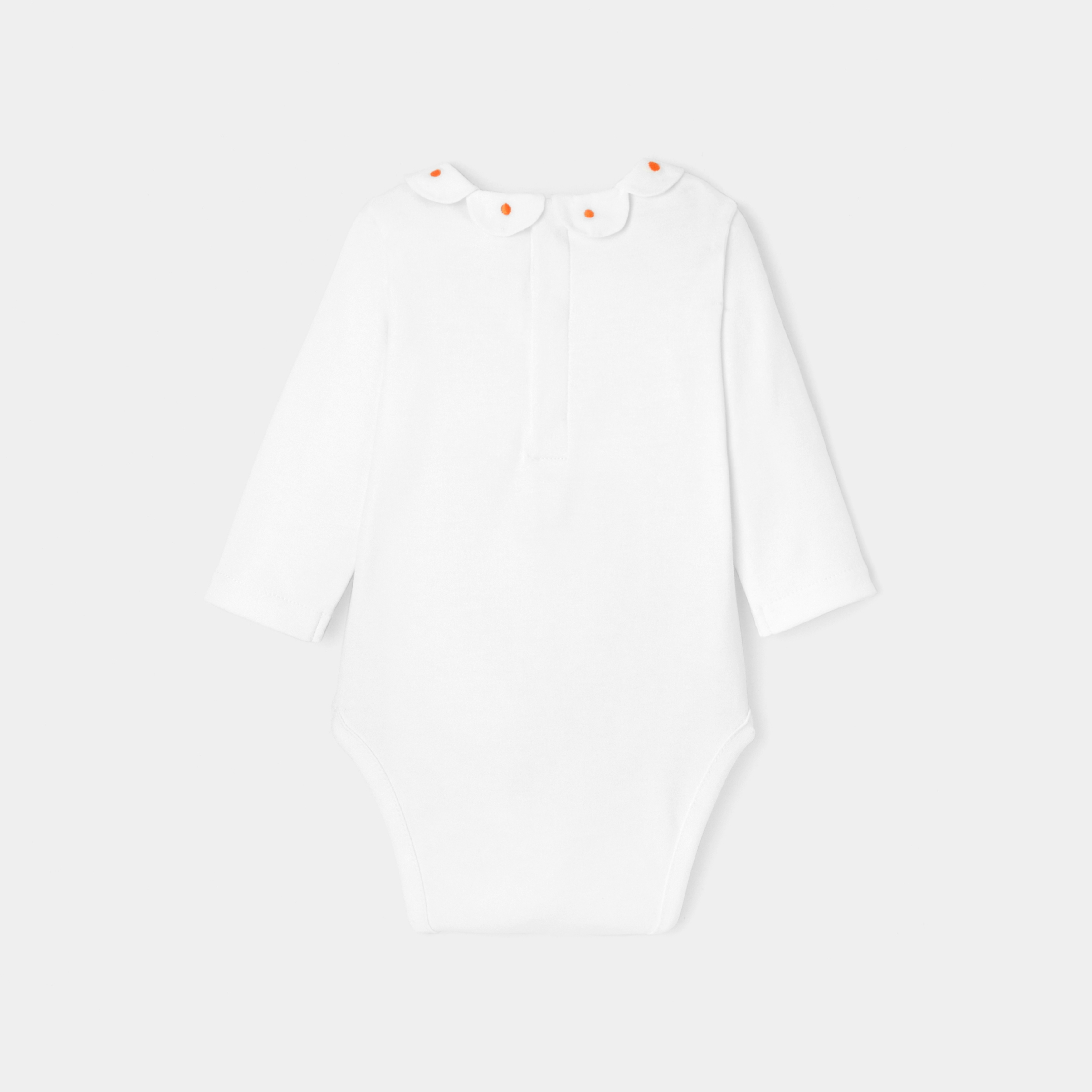 Per l'outfit quotidiano scegli l'eleganza essenziale di questo incantevole body bimba. In cotone biologico e arricchito da un colletto a petalo ricamato, abbinalo a una salopette in velluto per un look pieno di dolcezza.
