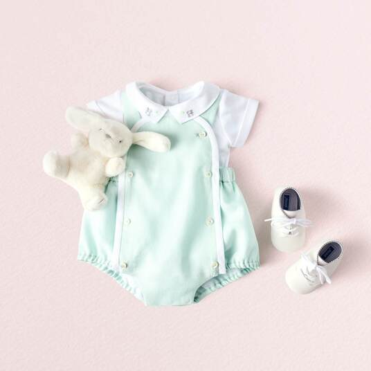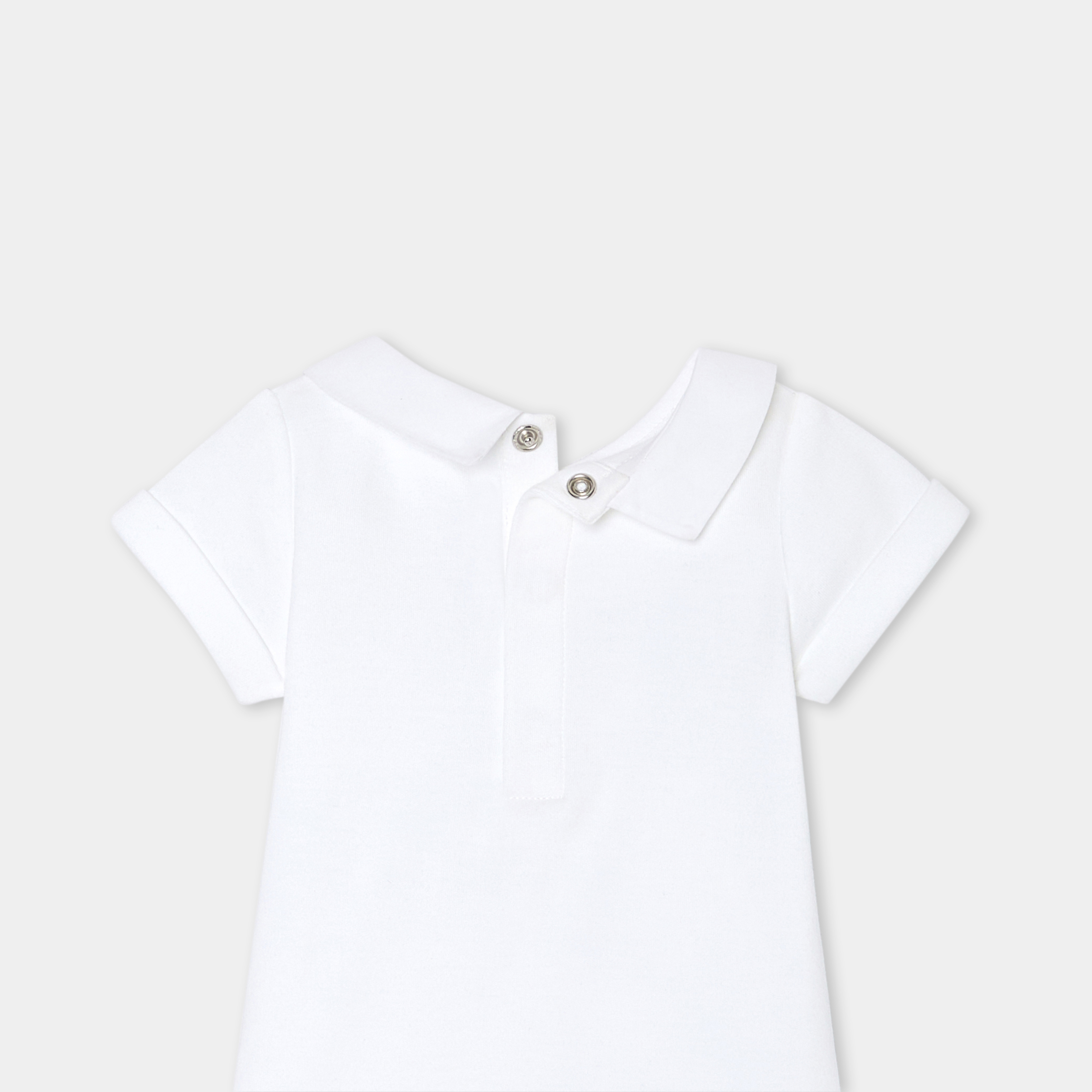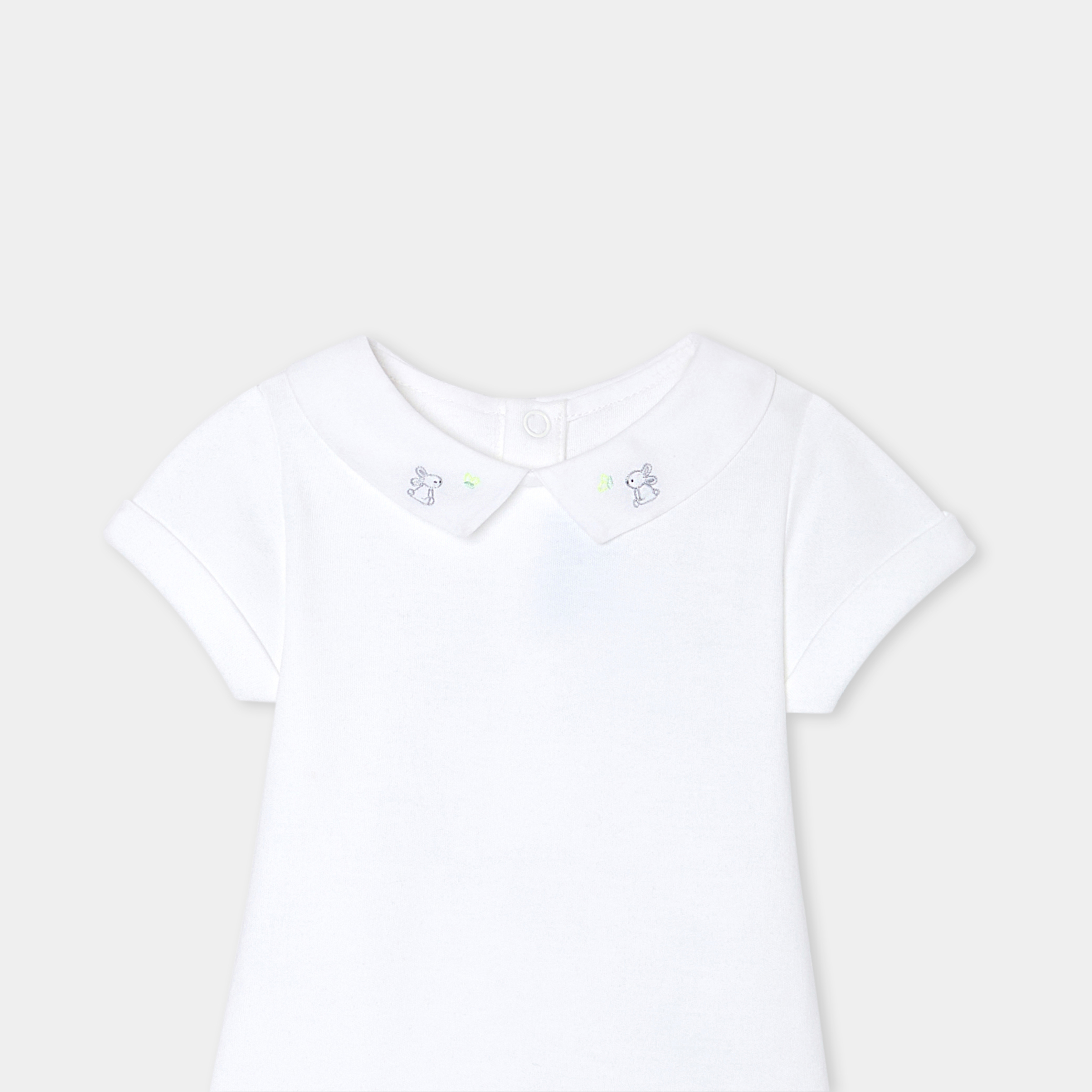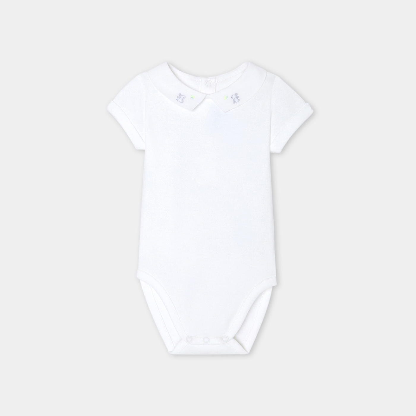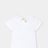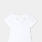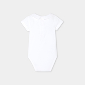Scegli l'eleganza pura di questo body a maniche corte per i suoi primi outfit primaverili. Realizzato in cotone biologico, con colletto in popeline ricamato a mano e chiusura con automatici sul retro, questo modello è perfetto per essere abbinato a salopette e cardigan.