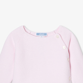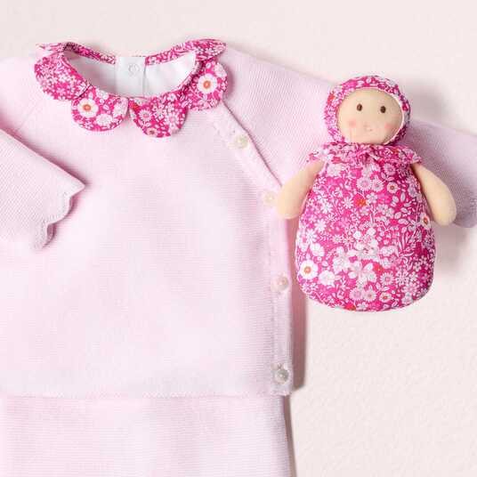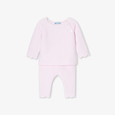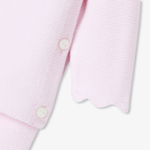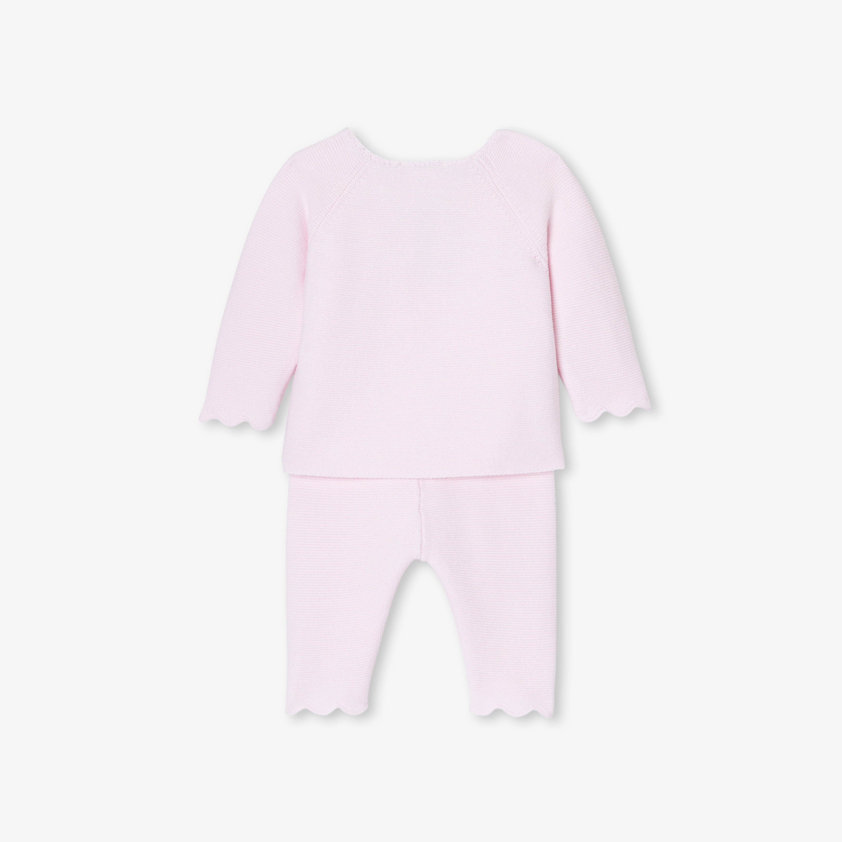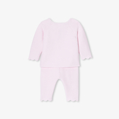 Raffinato e autentico, questo completino per neonata trova il giusto equilibrio tra eleganza e comfort. Realizzato in cotone biologico, la morbidissima maglia lavorata a punto legaccio offrirà un piacevole abbraccio protettivo alla neonata fin dai primi giorni di vita. Facile da indossare grazie alla chiusura davanti con bottoni e ai pantaloni con elastico in vita, questo completino dai graziosi dettagli smerlati è un'ottima idea per un primo outfit o un regalo nascita.