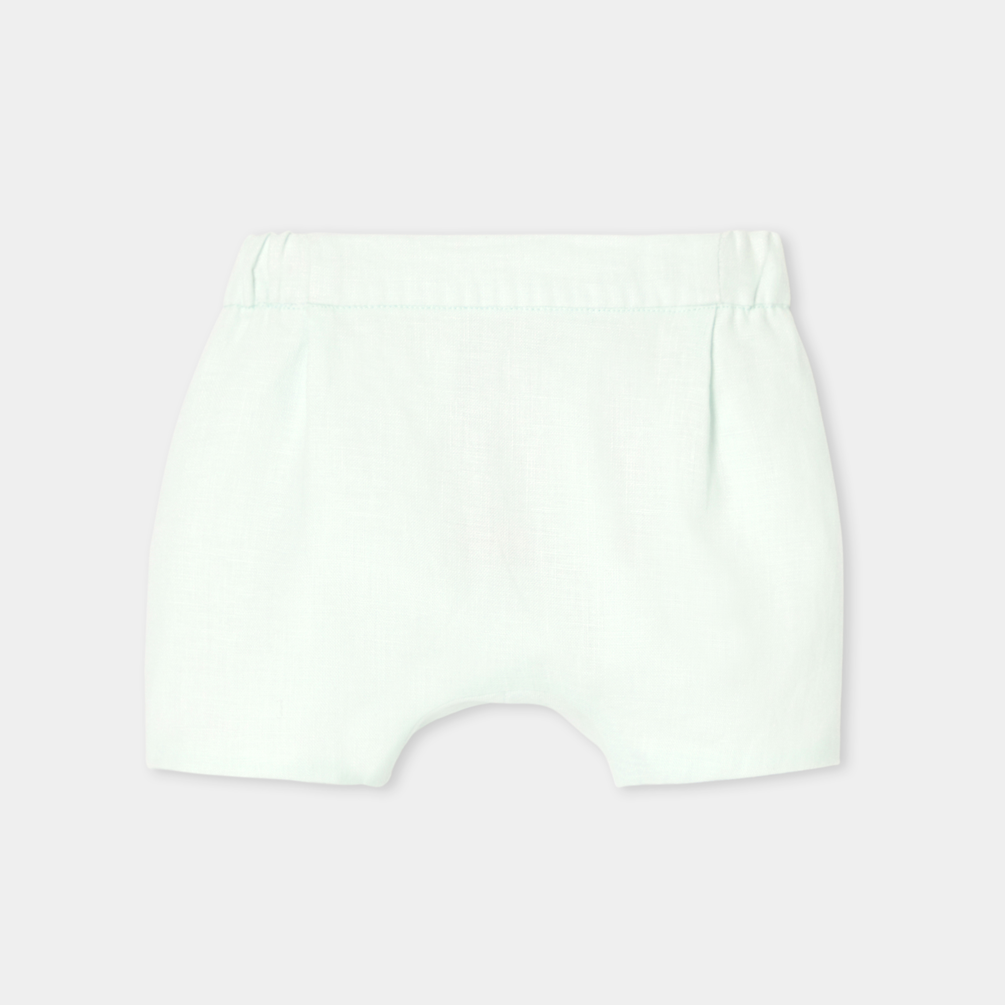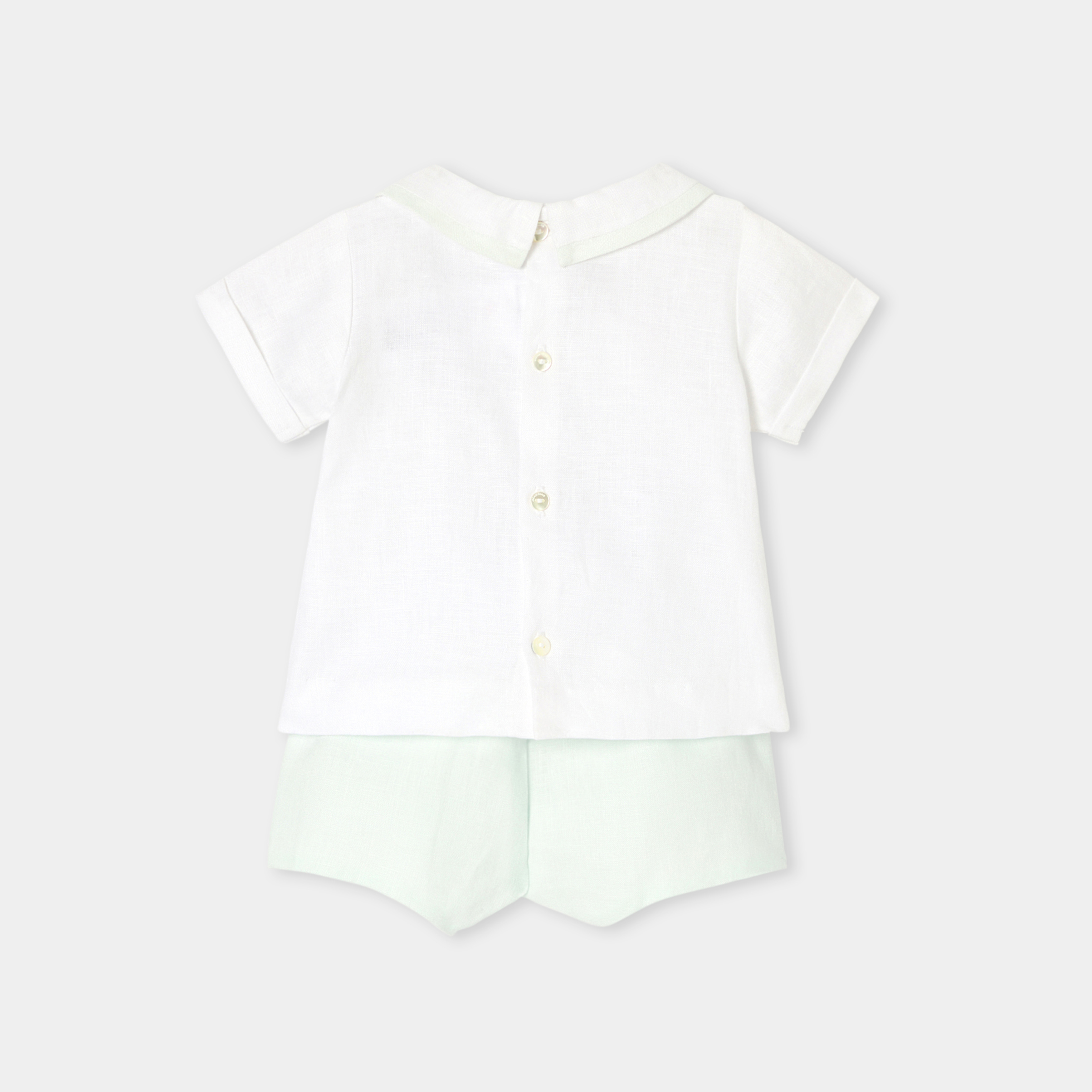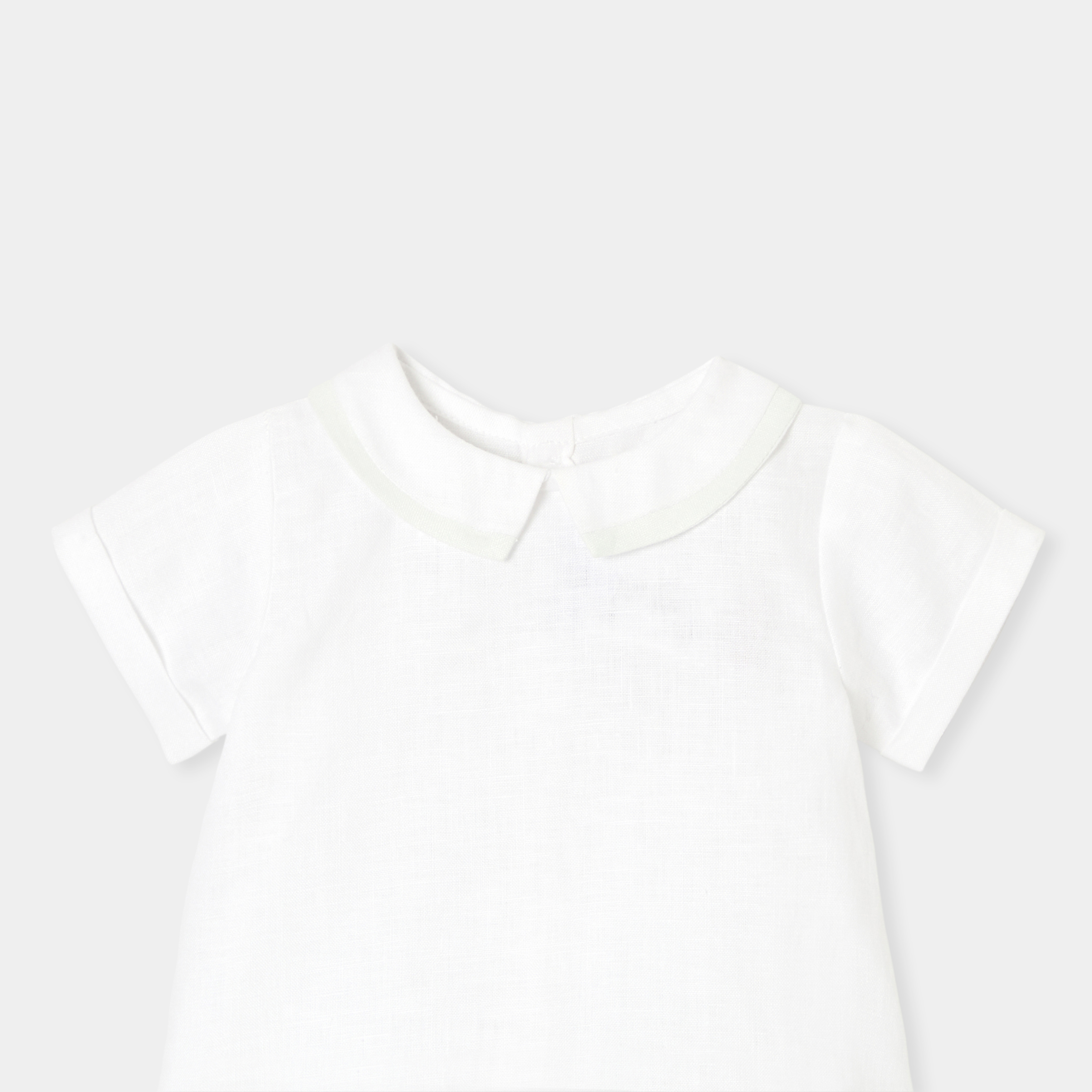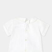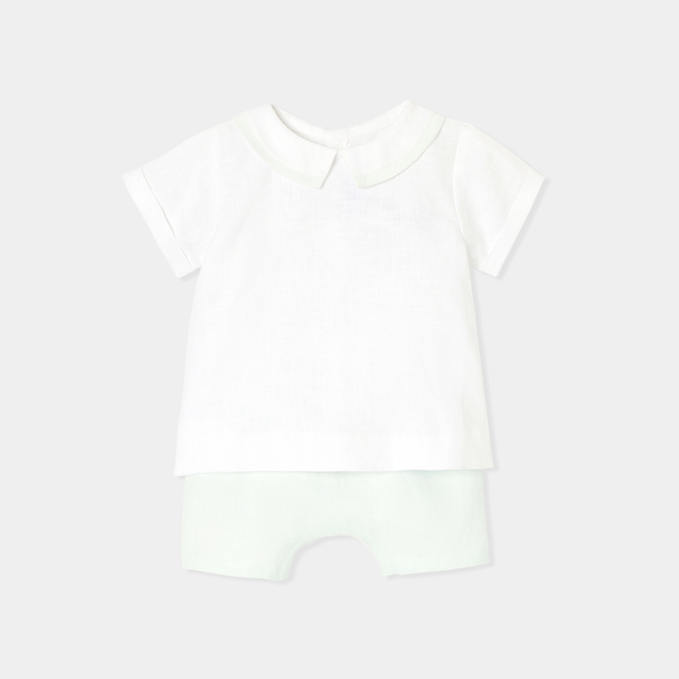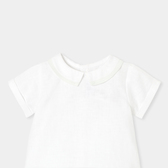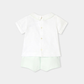 Gli stilisti hanno ideato un completino bimbo chic ed essenziale per la prima estate del neonato. Realizzato in morbido lino, è composto da una t-shirt con colletto con profili e da shorts foderati a pieghe. Indossato per una cerimonia con dei sandali, questo completino autentico accompagnerà il piccolo per tutta l'estate.