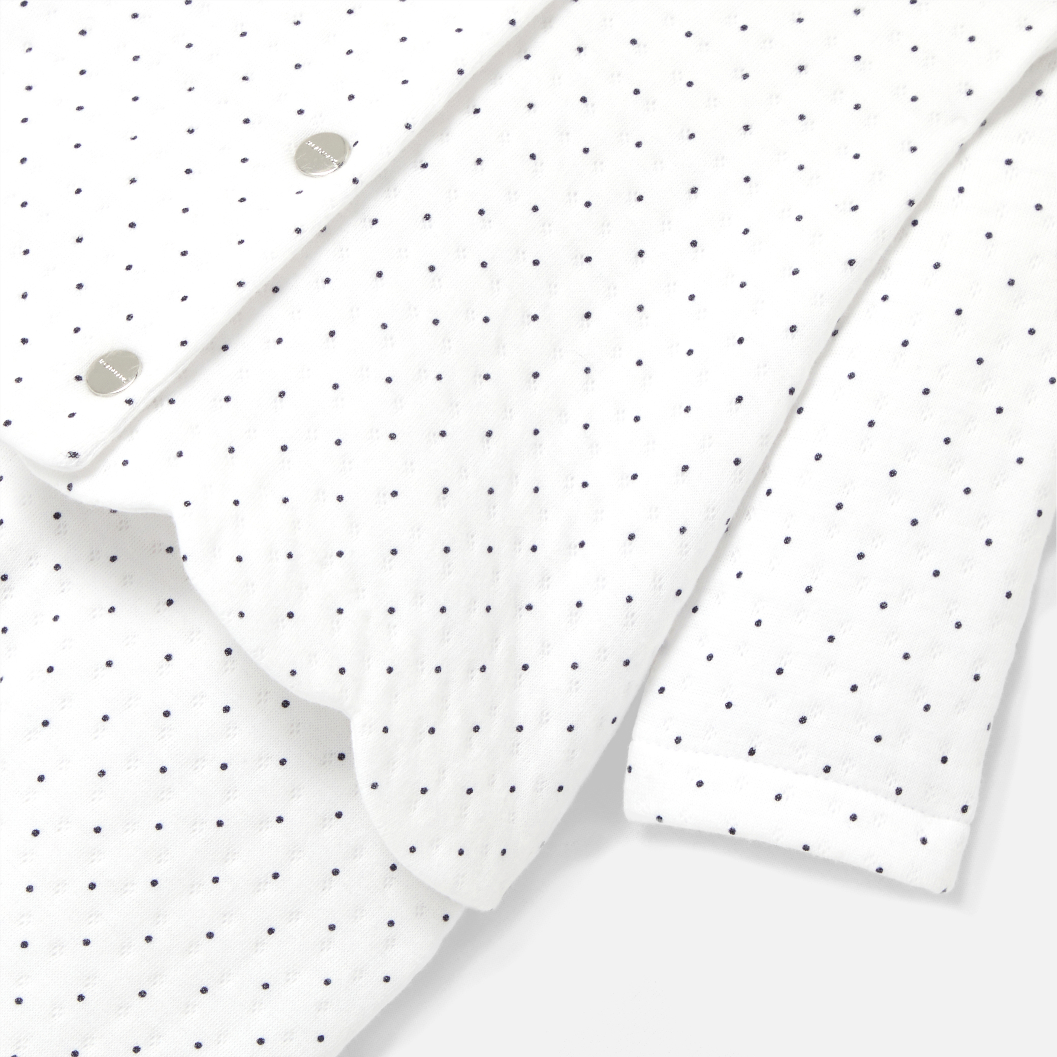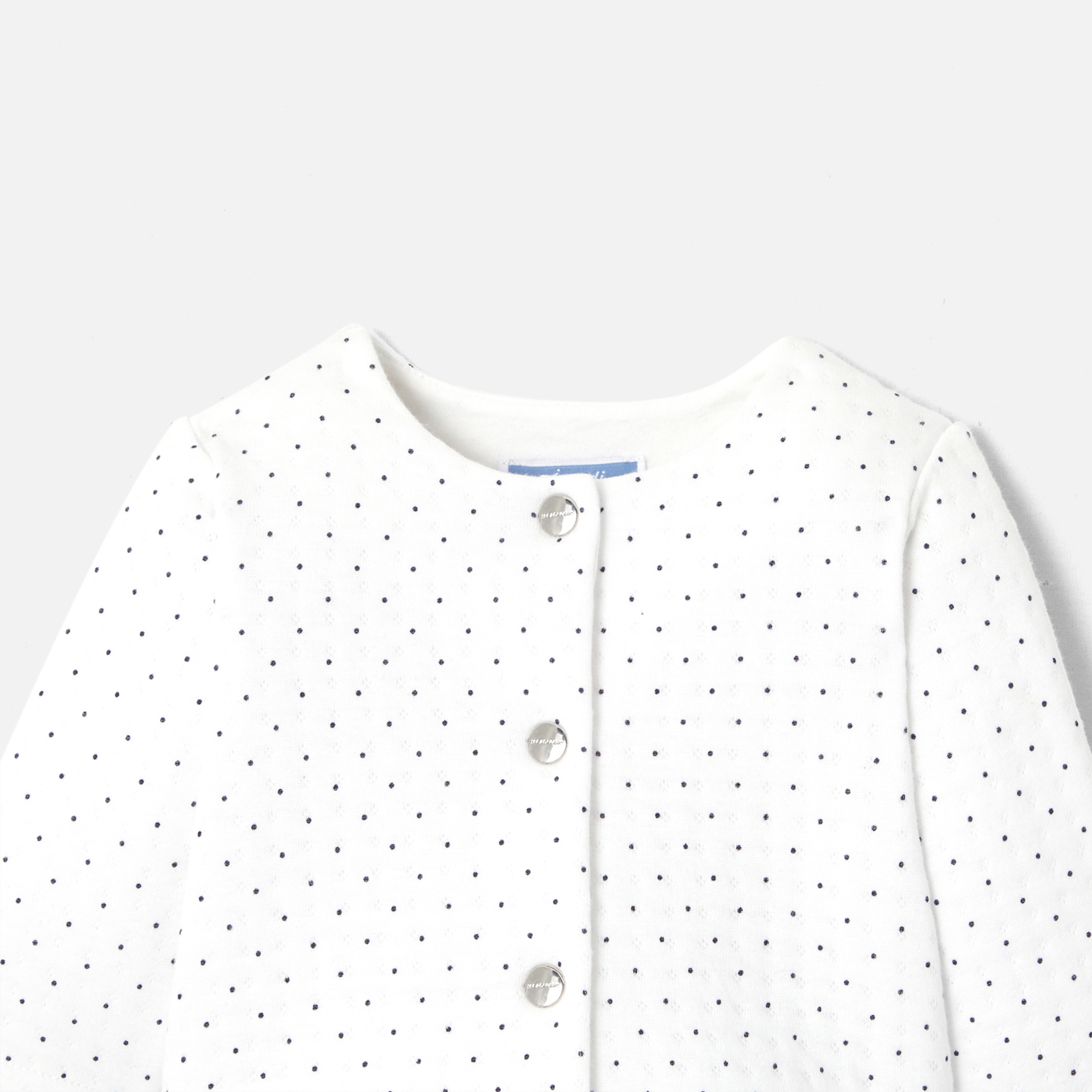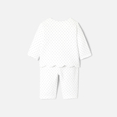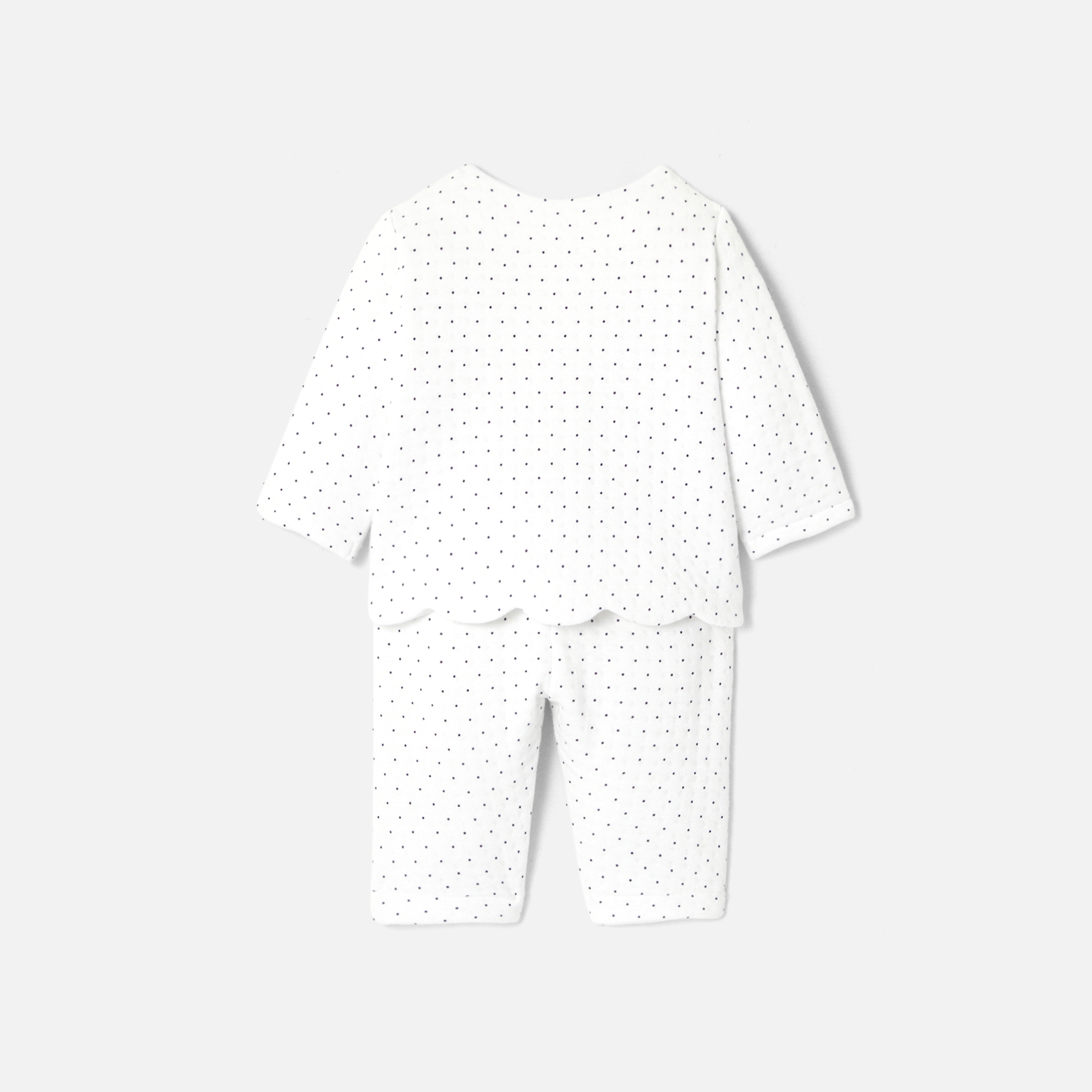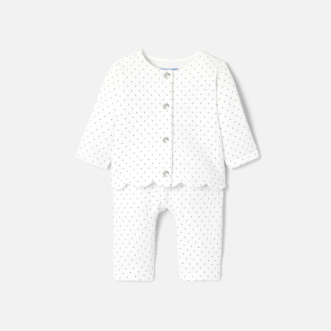 Un regalo di nascita ideale per tutti i neogenitori, questo completino bimba è caratterizzato da linee eleganti ed essenziali. In doppio jersey, è composto da un cardigan smerlato e da pantaloni senza piedini che potrai facilmente abbinare a un body o a una blusa in tessuto Liberty per l'inizio di stagione.
