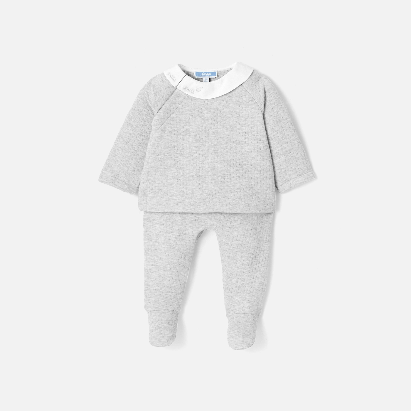 Un modello inedito firmato Jacadi, i bimbi apprezzeranno la morbidezza e il comfort di questo completino da indossare sin dai primi giorni. Composto da un pullover con colletto in popeline facile e sicuro da infilare grazie all'apertura sul davanti e da pantaloni con elastico in vita, questo delizioso outfit in jersey trapuntato sarà perfetto per il suo primo corredino.