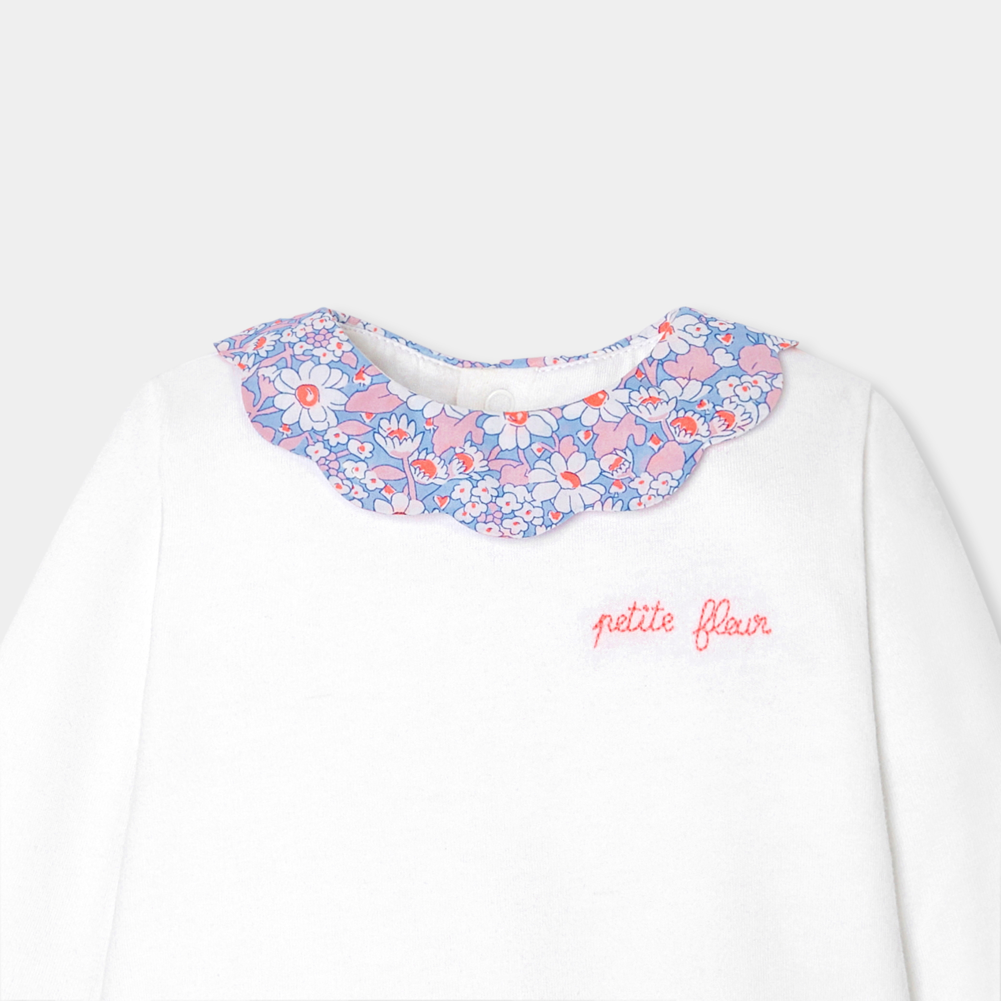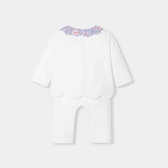 Jacadi ha progettato un completo per bambina comodo e chic perfetto per la tua piccola. Realizzato in jersey trapuntato e foderato, presenta una maglia con colletto in tessuto Liberty e graziosi ricami. Completo di pantaloni con elastico in vita per una vestizione facile e sicura, questo completo è stato progettato per essere un bozzolo rassicurante ed è perfetto come regalo per la nascita.