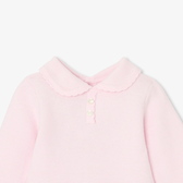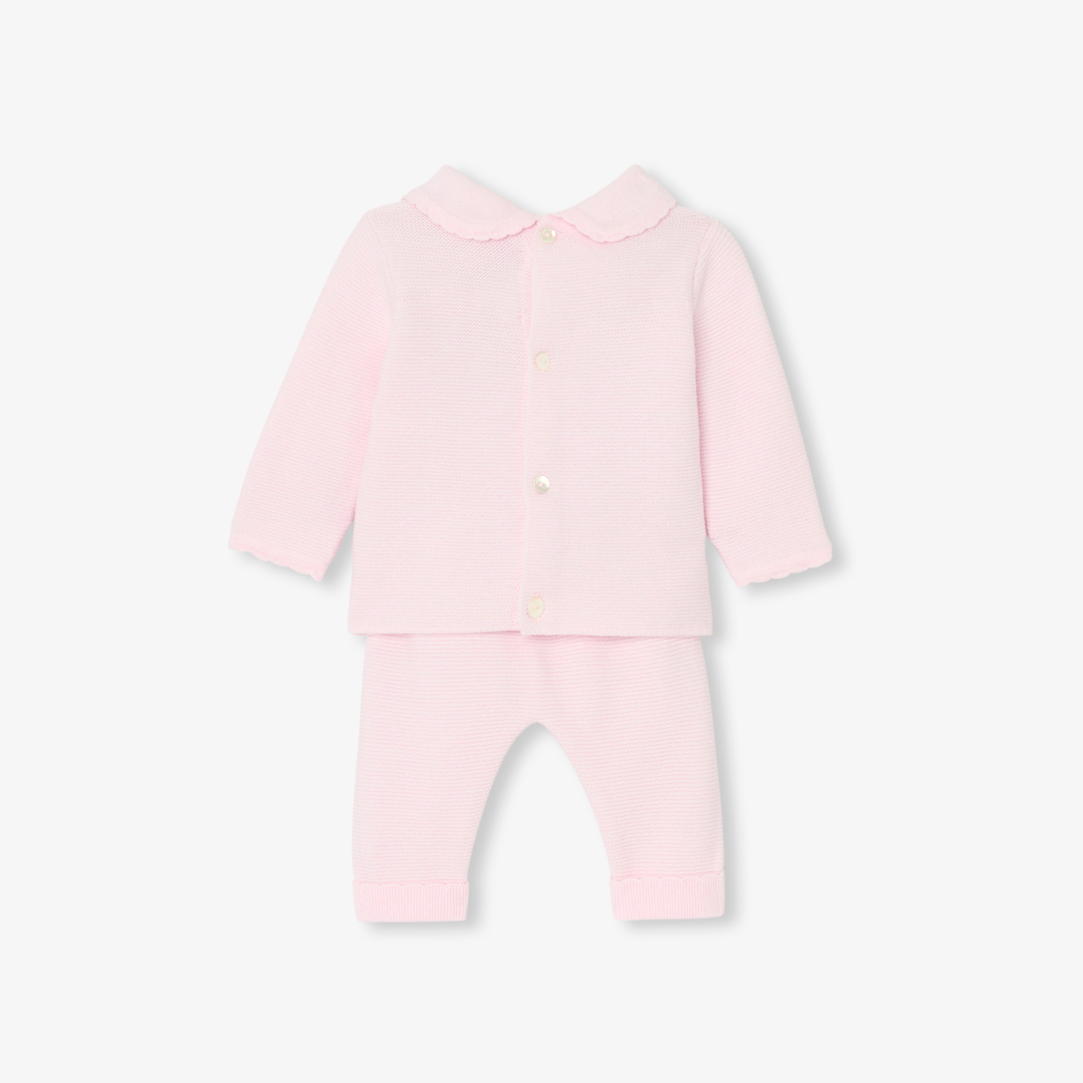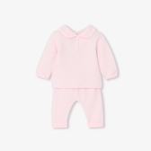 Realizzato in morbida maglia a punto muschio, questo completo da bambina è composto da un maglioncino con delizioso colletto smerlato alla Claudine e finta abbottonatura, apribile sulla schiena, e da pantaloni con elastico in vita per facilitare la vestizione. Realizzato in lana sostenibile e cotone biologico, questo completo senza tempo accompagnerà la tua piccolina in tutte le sue scoperte.
