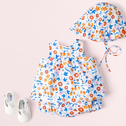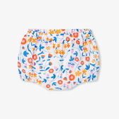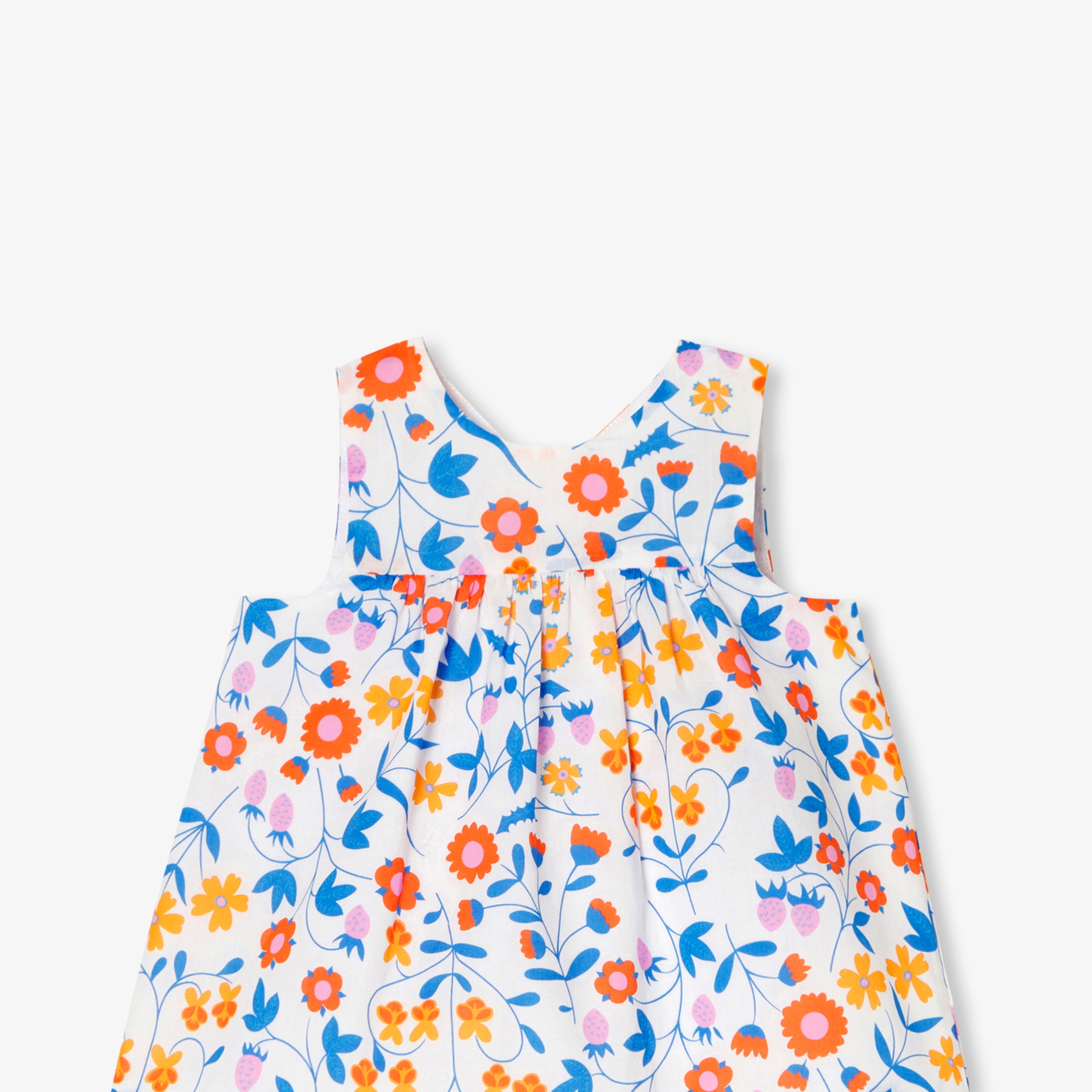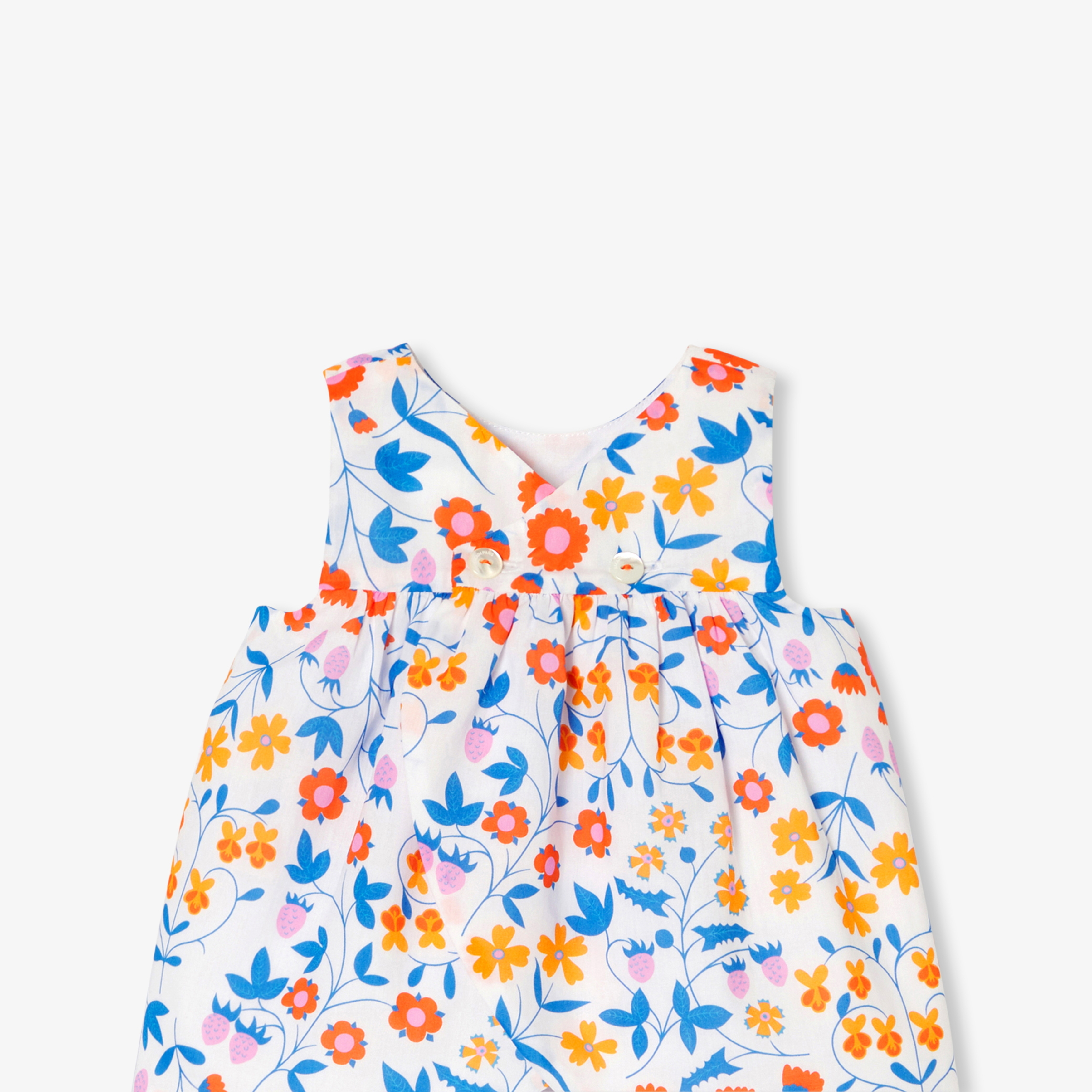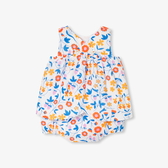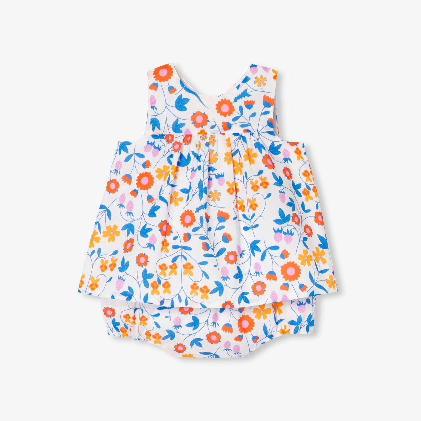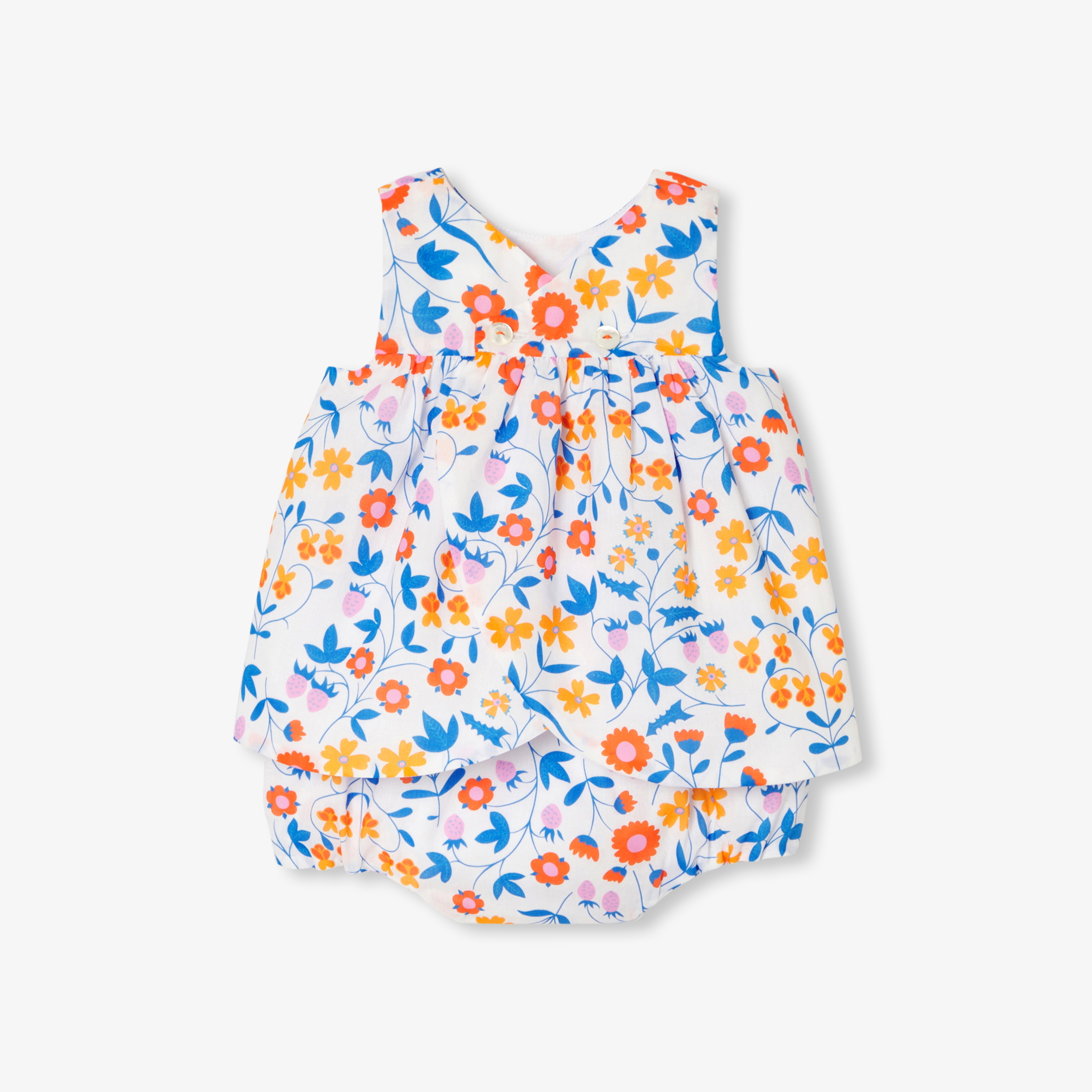 Questo completino estivo da bambina in tessuto Liberty le darà la nota di freschezza ed eleganza che cerchi. È composto da una maglia con apertura incrociata sulla schiena, un taglio arricciato e una base arrotondata sul retro per creare un bel volume. Completamente foderate in voile di cotone, le mutandine elasticizzate completano questo set floreale chic da indossare in città o al mare.