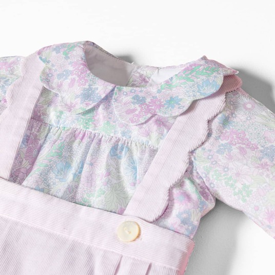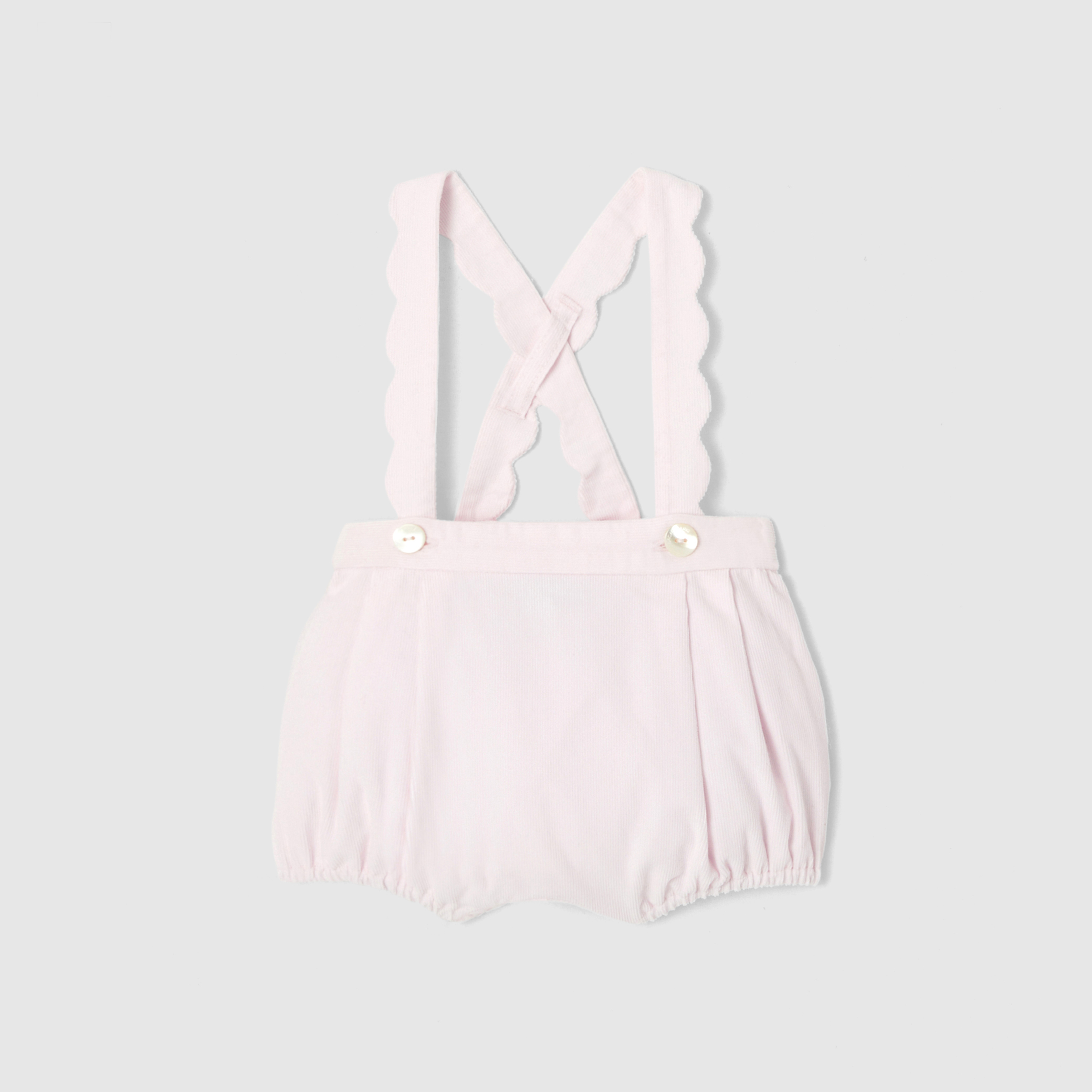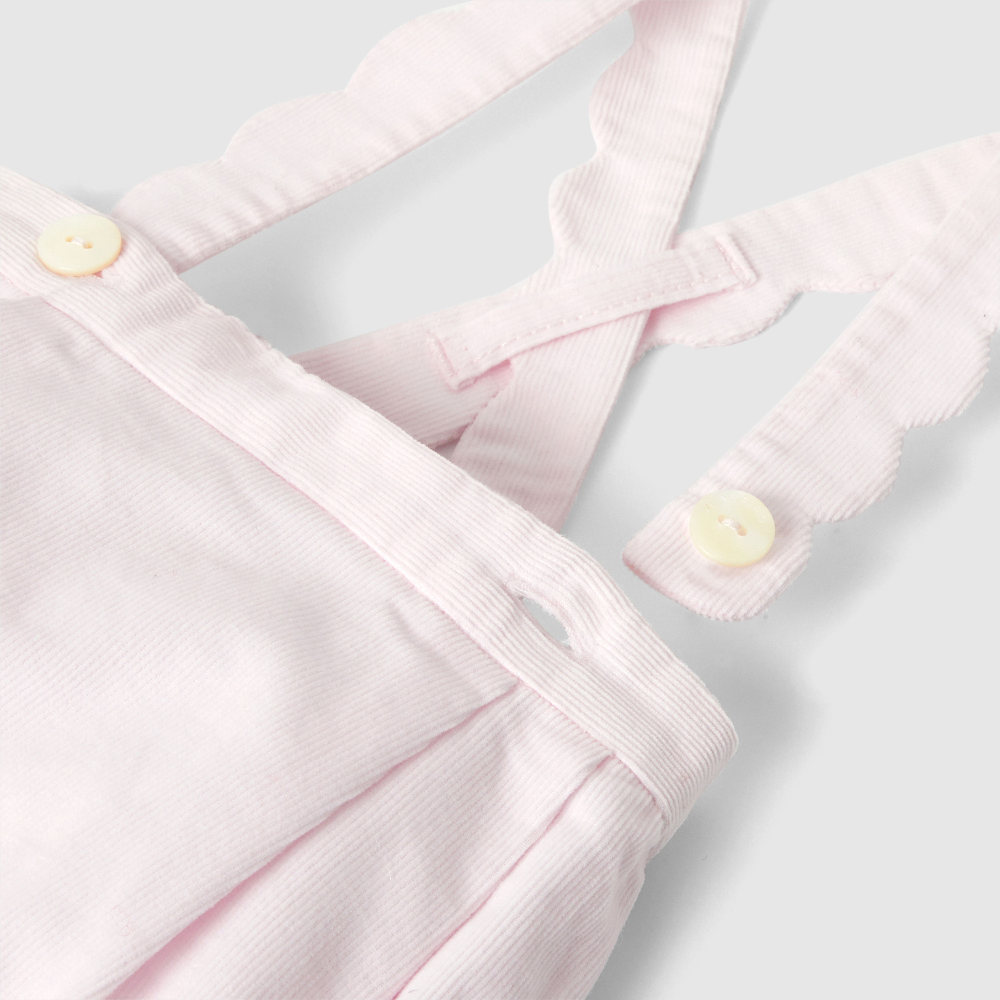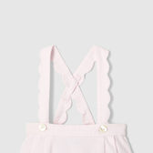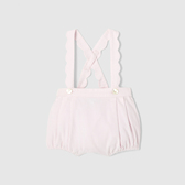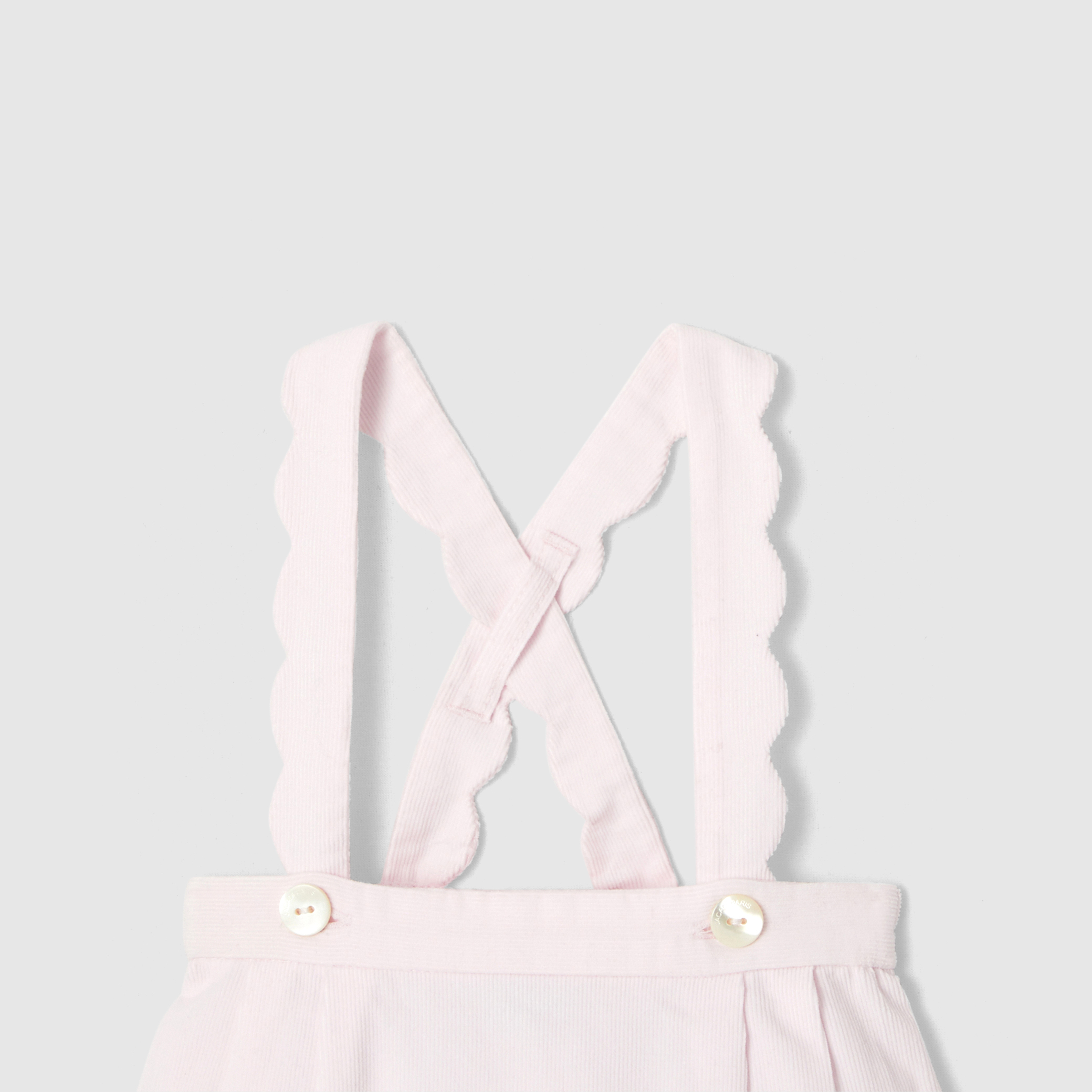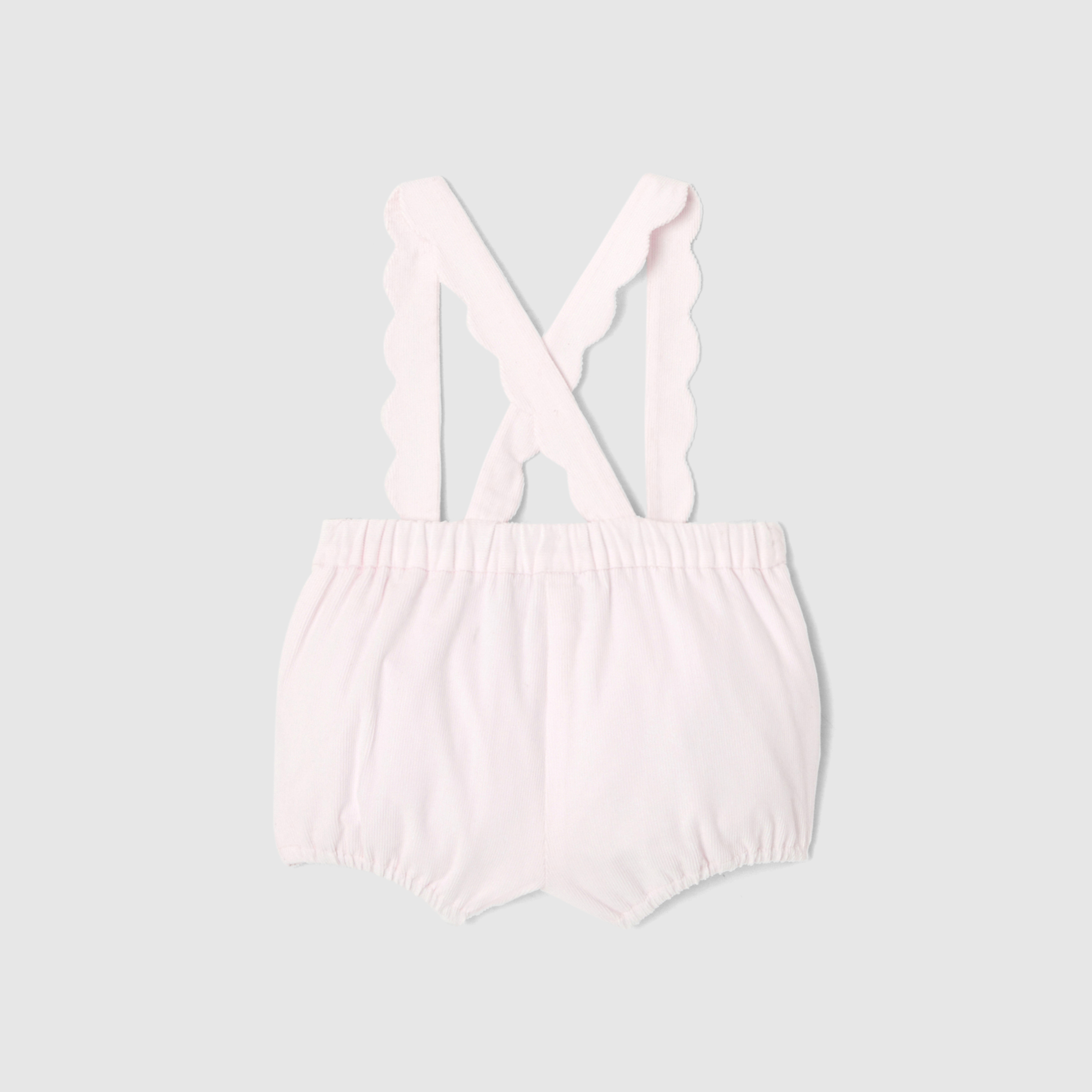 La delicatezza del rosa pallido e il comfort di un morbido velluto, il pagliaccetto bimba di quest'anno è arricchito da bretelle smerlate per l'inizio di stagione. Un ritorno a scuola grafico ed elegante con questo modello ispirato agli archivi della maison, perfetto da indossare sopra una blusa o un body.