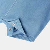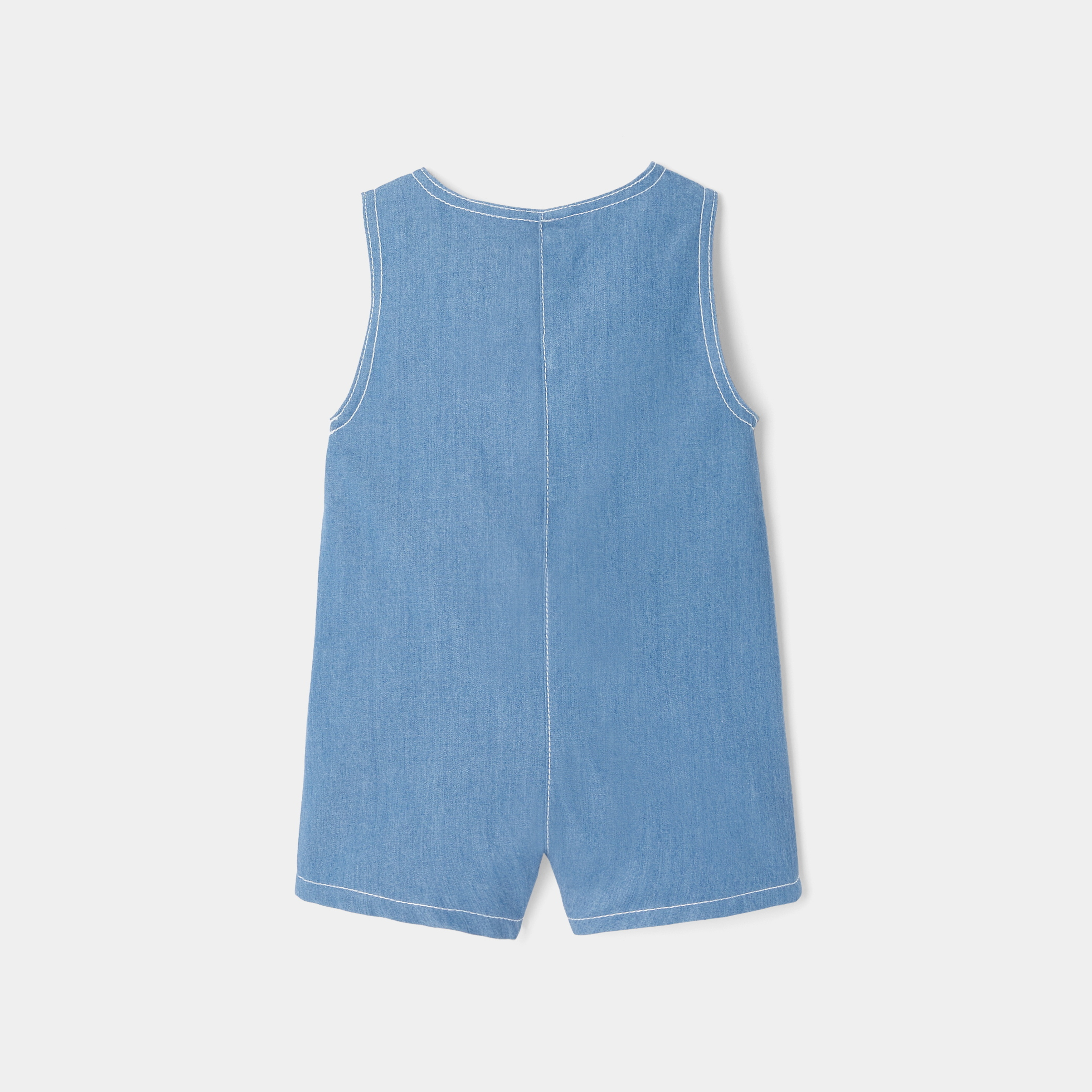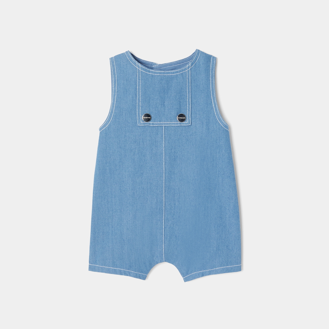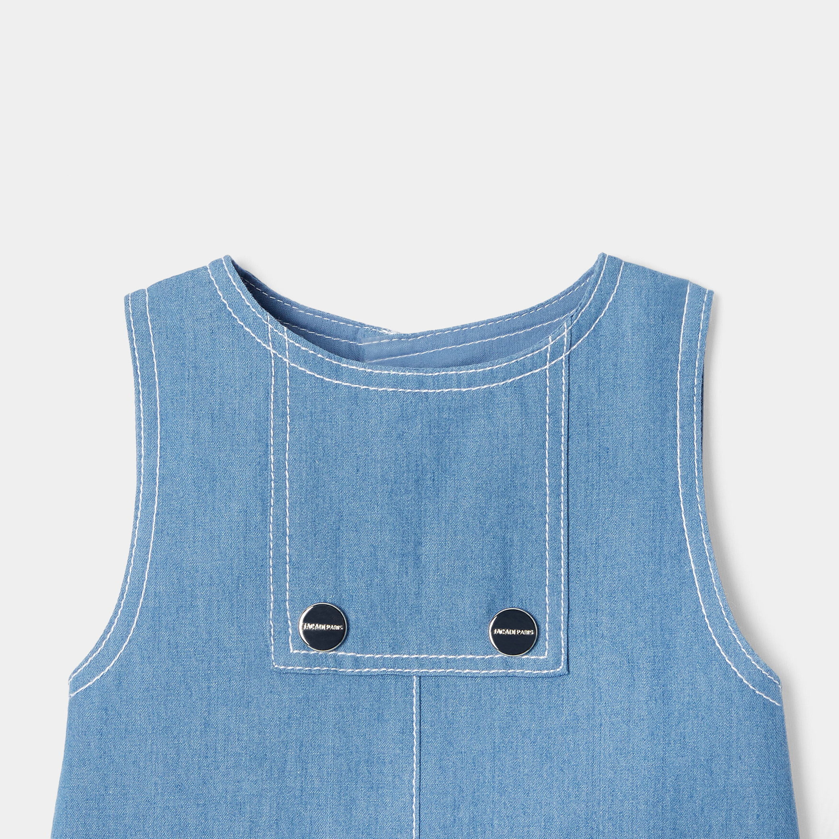 Immancabile per l'estate, un tessuto in denim dinamizza la salopette bimbo di questa stagione. In cotone biologico morbido e piacevole e ornato di uno scollo quadrato con automatici decorativi stile collo alla marinara, questo modello da indossare sopra un body a maniche corte è ideale per comporre il suo primo corredino estivo.