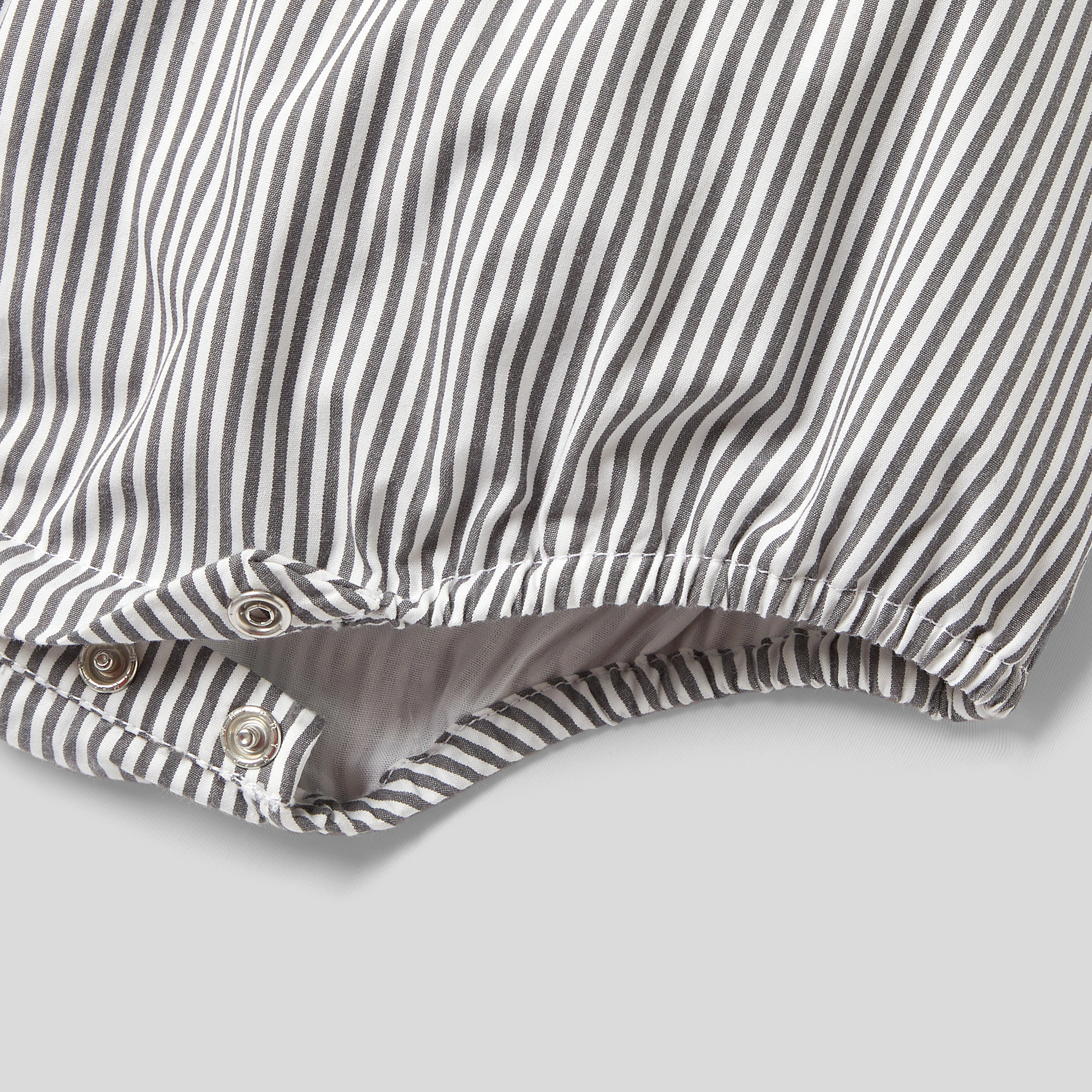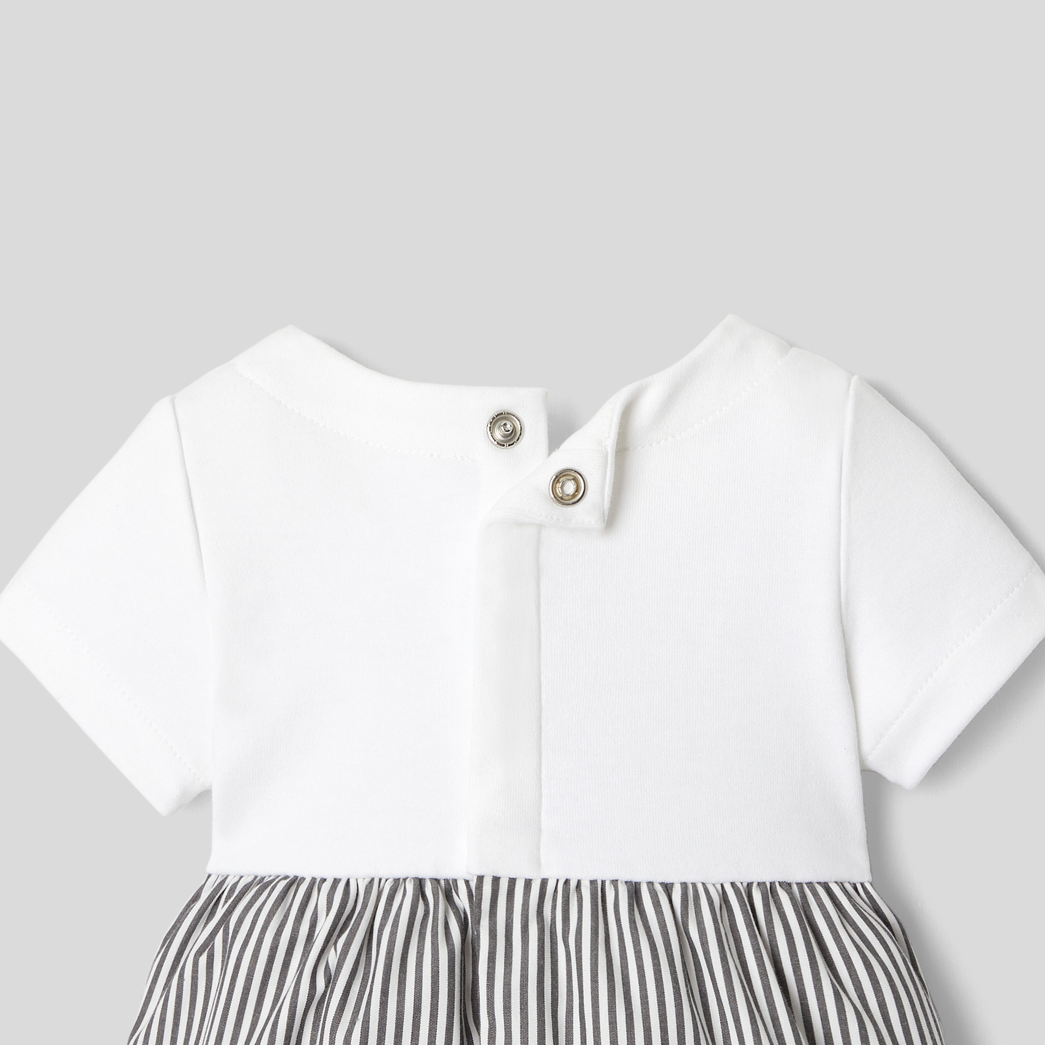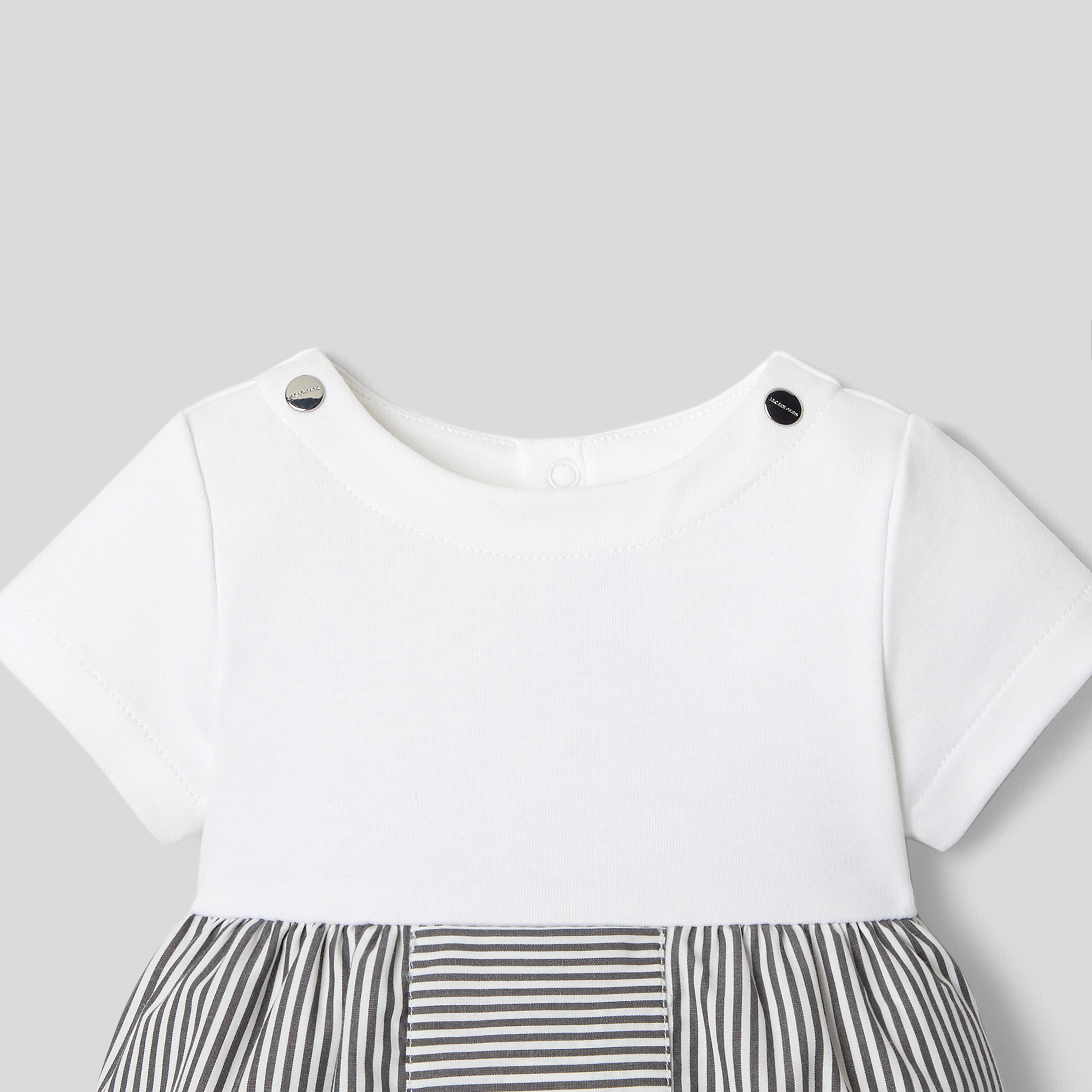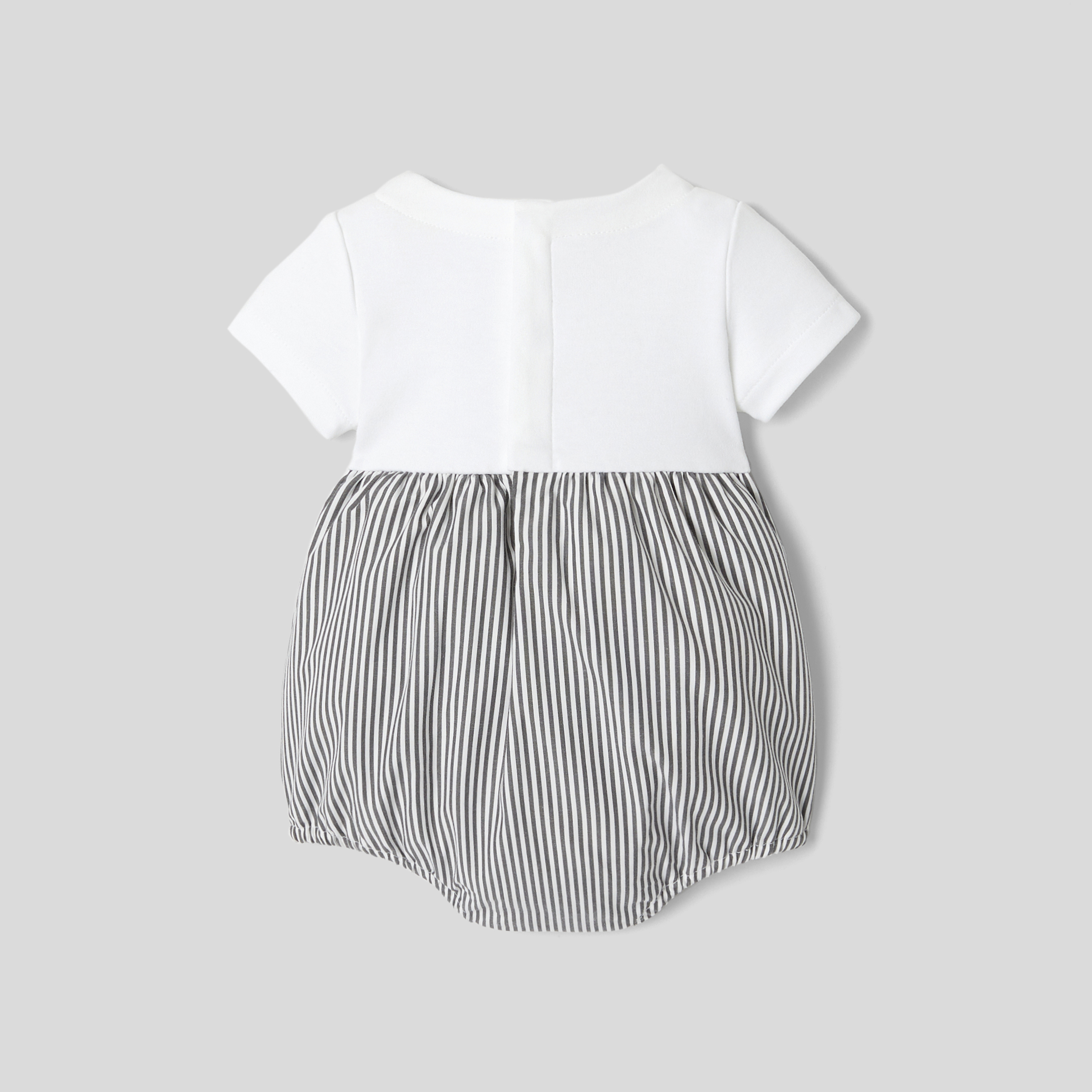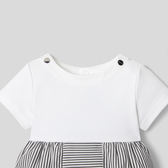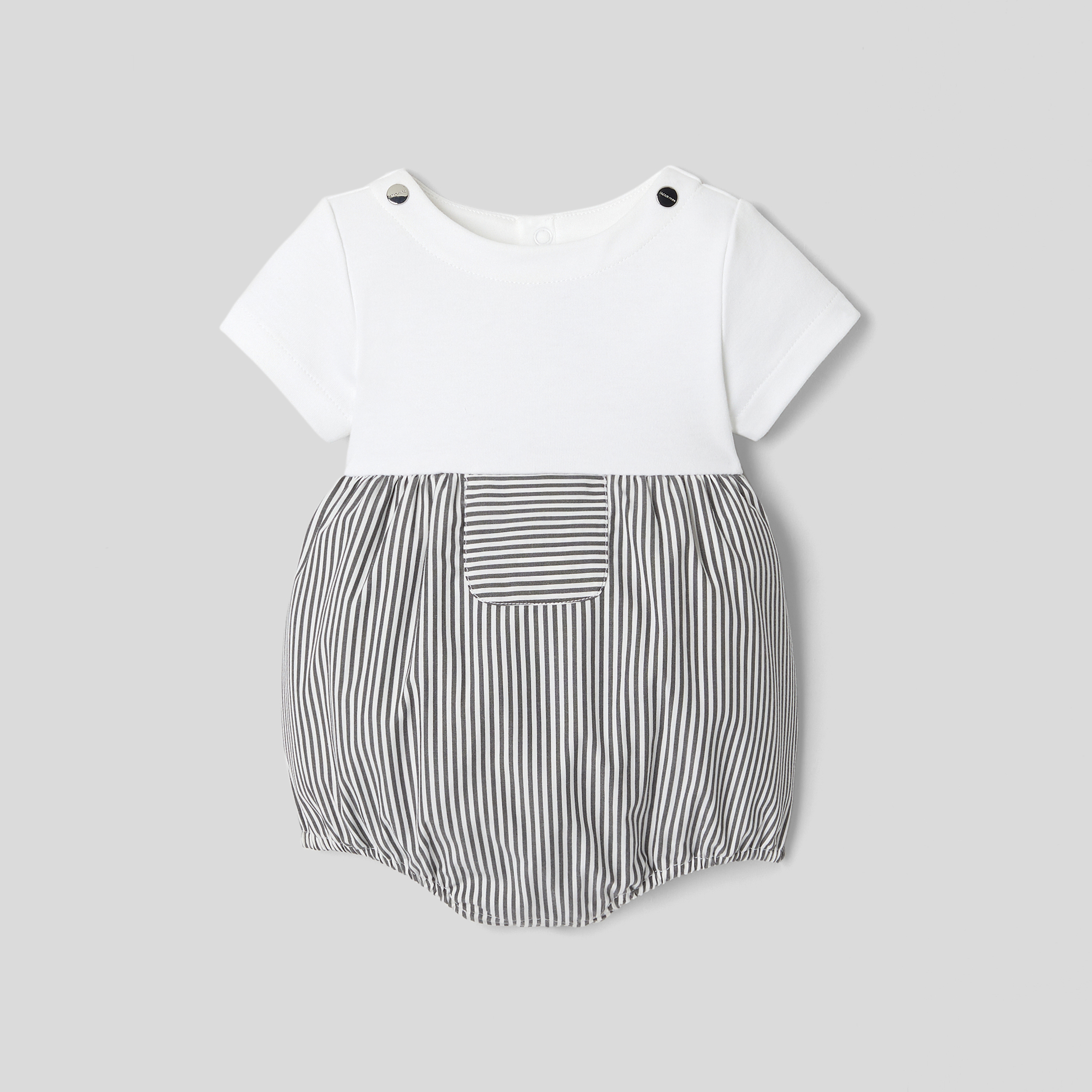 Composta da un top in cotone interlock e un fondo in popeline a righe, la tutina bimbo di questa stagione è in versione corta per l'estate. In cotone biologico, è facile da infilare grazie all'apertura con automatici sul retro e sul cavallo.