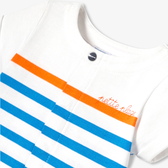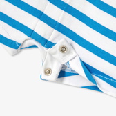 Lasciati conquistare dalla tendenza navy con questa tutina corta bimbo. Creata ispirandosi ai codici grafici dell'intramontabile marinière, pratica e facile da infilare grazie all'apertura frontale e sul cavallo, la sua prima estate sarà all'insegna del comfort grazie al suo jersey morbido e leggero. Indossata in città o in riva al mare, sarà la protagonista della valigia per le vacanze.