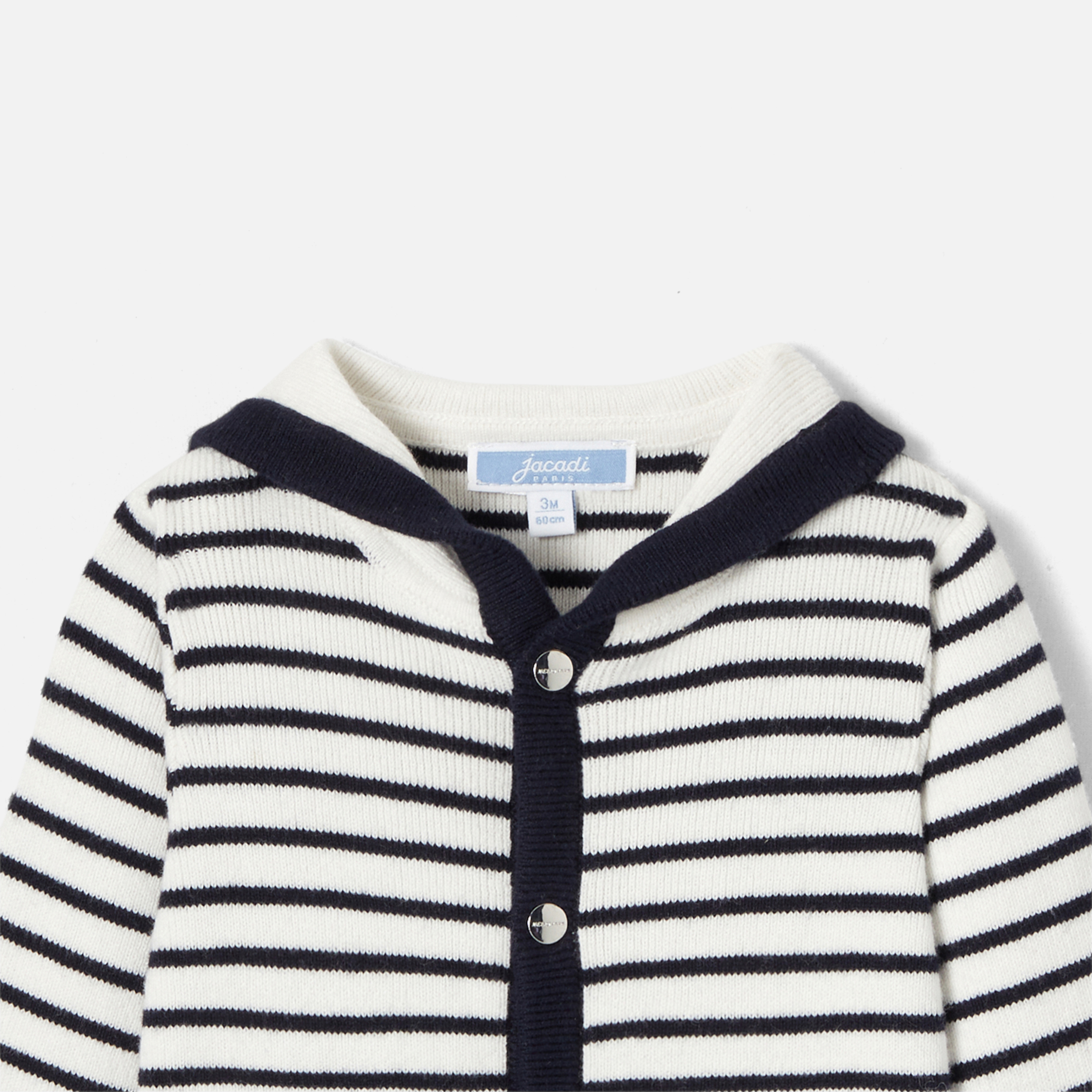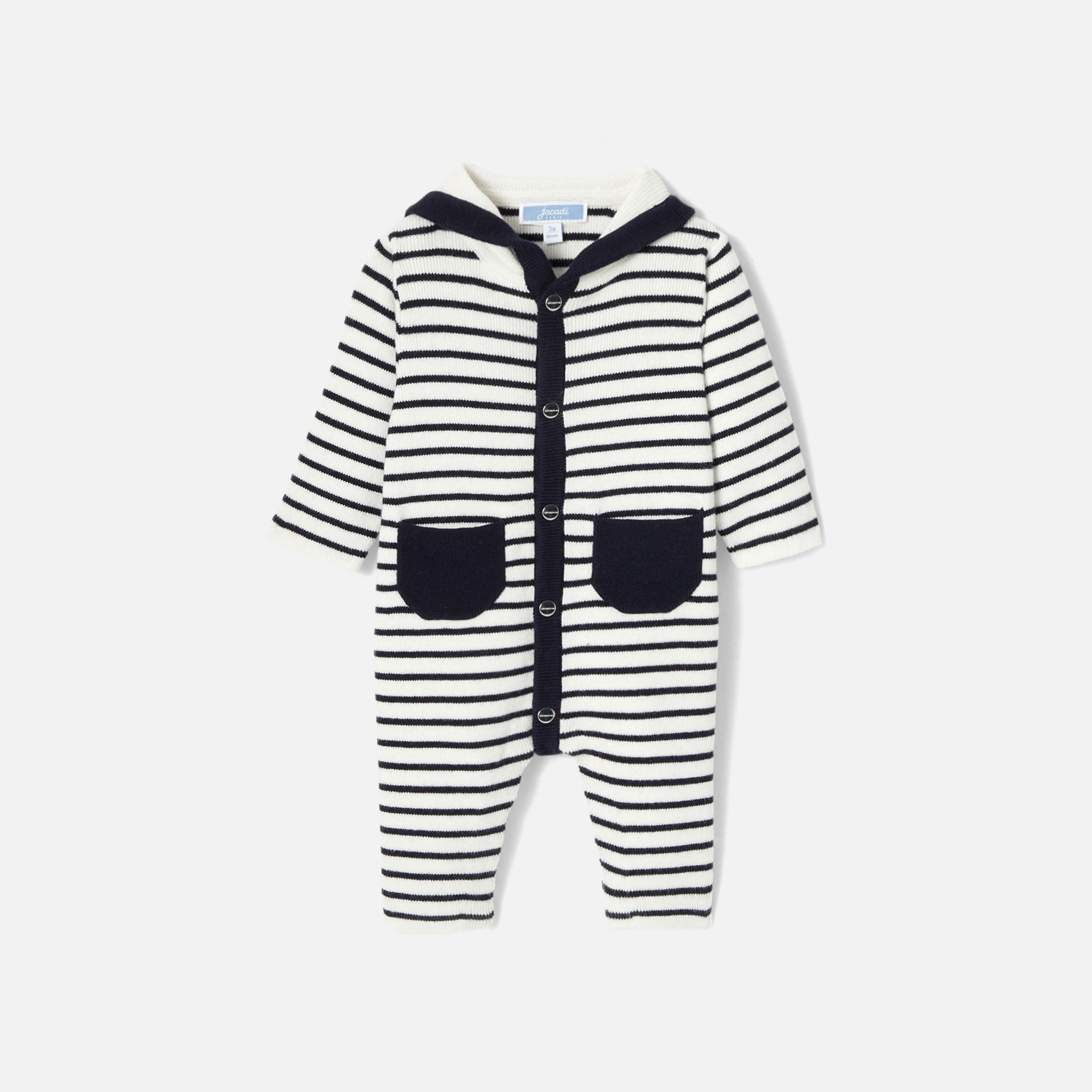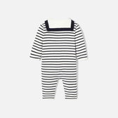 Questa incantevole tutina bimbo offre un'interpretazione contemporanea dell'iconica marinière. In stile navy-chic, questo comodo capo dal fascino autentico, arricchito da tasche applicate e da un collo alla marinara non passerà inosservato. Omaggio alla bella fattura, sarà una bella idea regalo da offrire ai neogenitori.