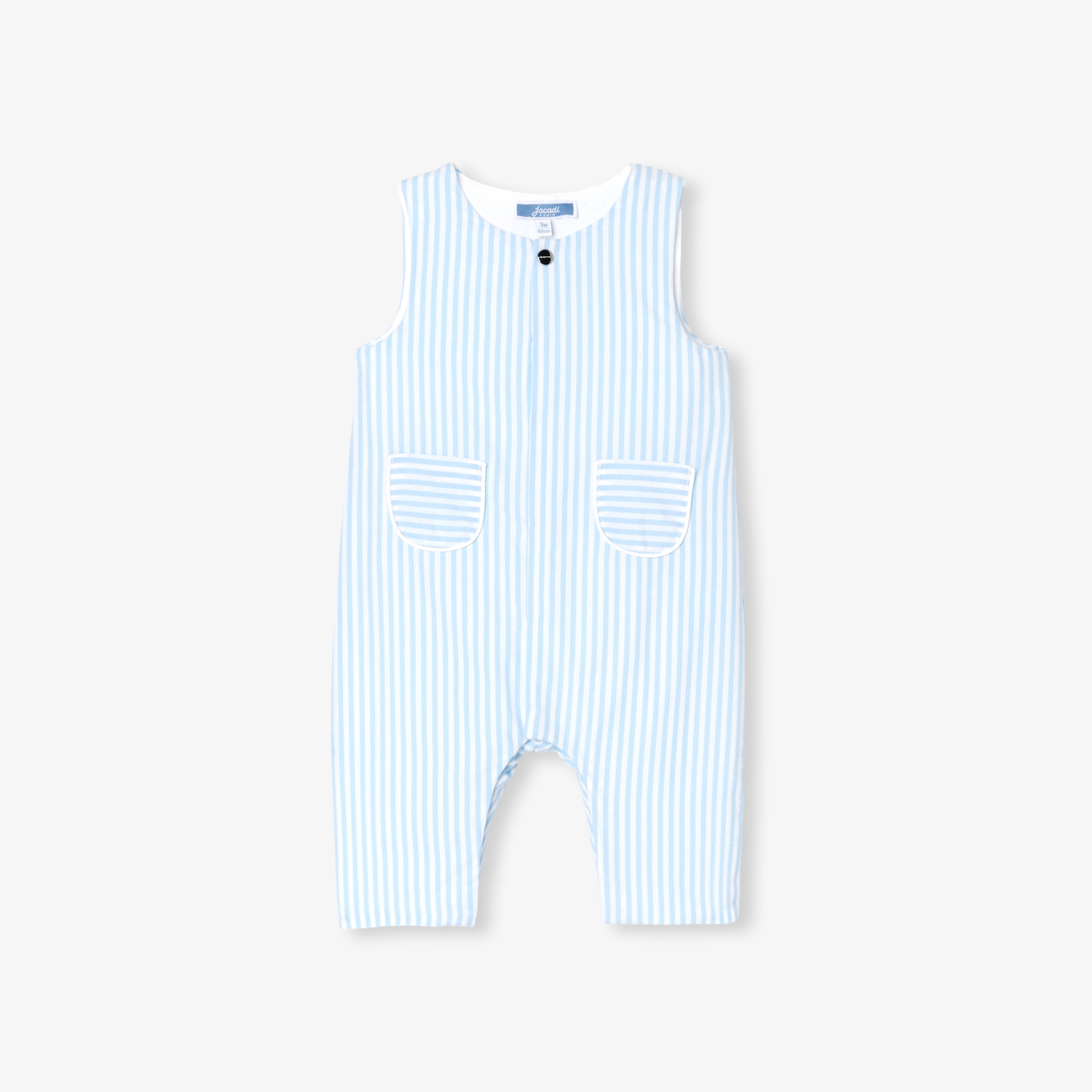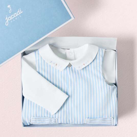 Jacadi ha disegnato una tutina per neonato che unisce l'eleganza del popeline di cotone al comfort della fodera in interlock e di una leggera imbottitura. Capo distintivo di un guardaroba pensato per i più piccoli, è facile da indossare grazie all'apertura con automatici sul davanti e sull'interno gamba. Un motivo a righe e tasche a filetto completano questo modello perfetto per l'abbigliamento quotidiano.