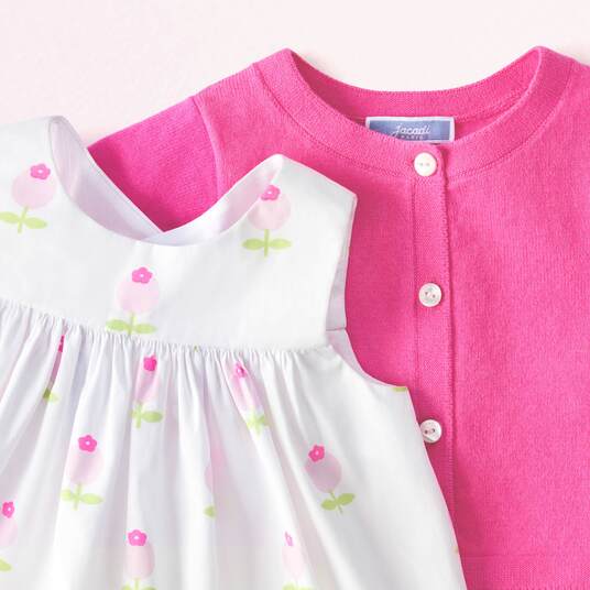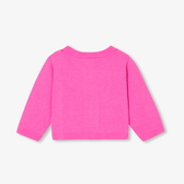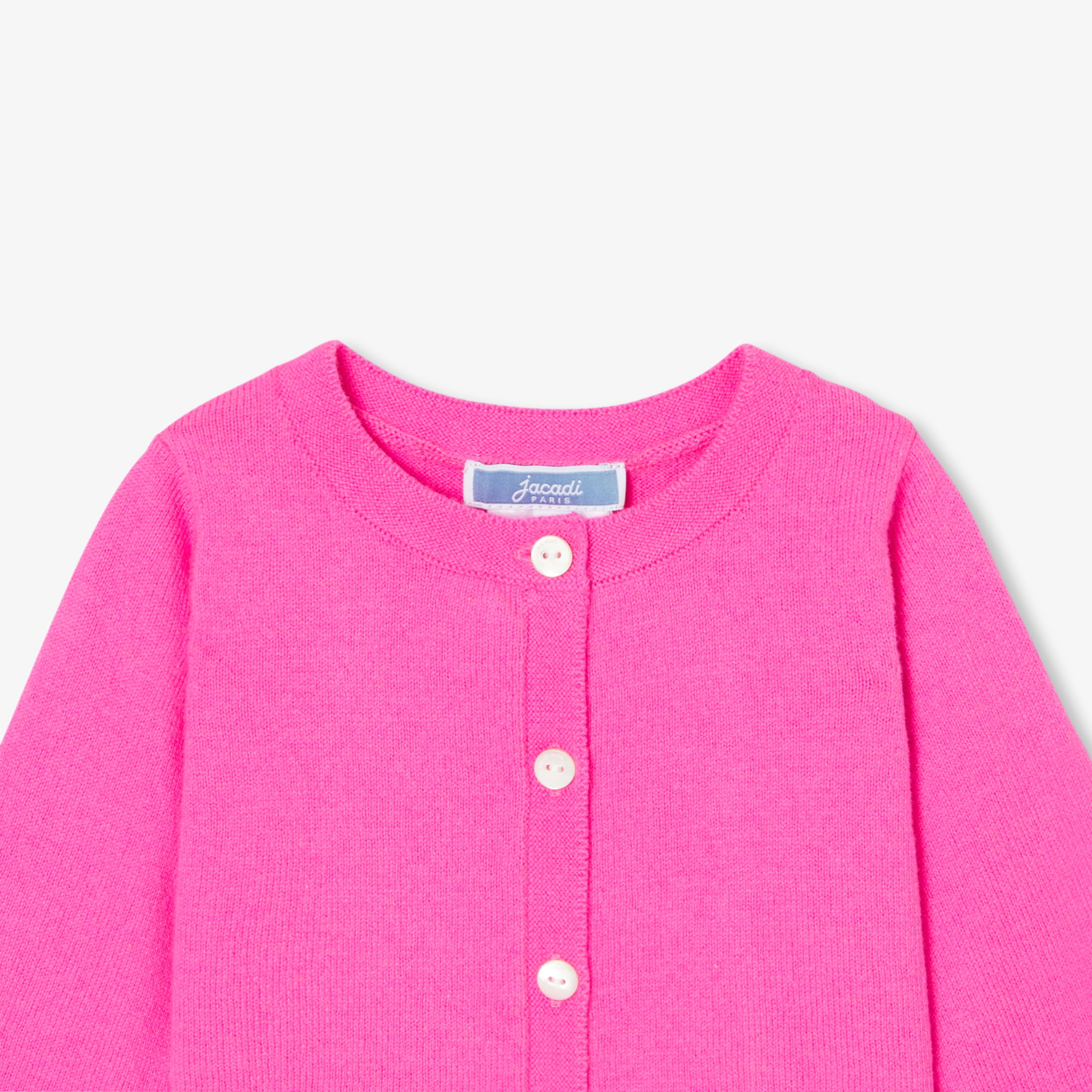 Un cardigan da bambina comodo da indossare dalla primavera all'autunno. Realizzato in comodissimo jersey di cotone biologico, il suo rosa acceso si abbina perfettamente a un abito Liberty o a un pagliaccetto per completare un outfit formale.