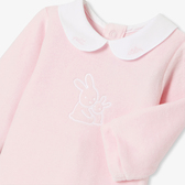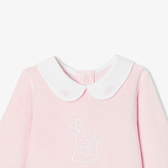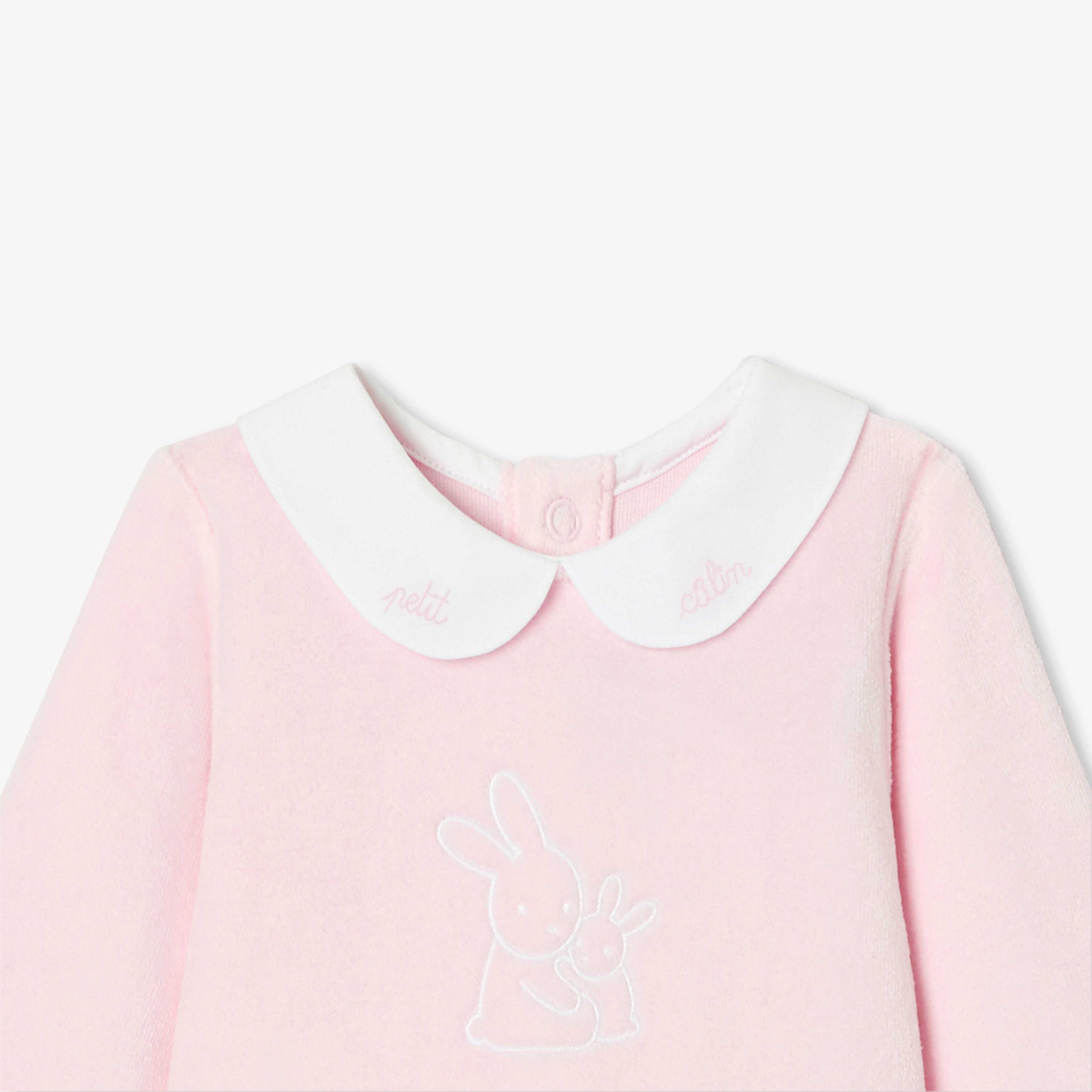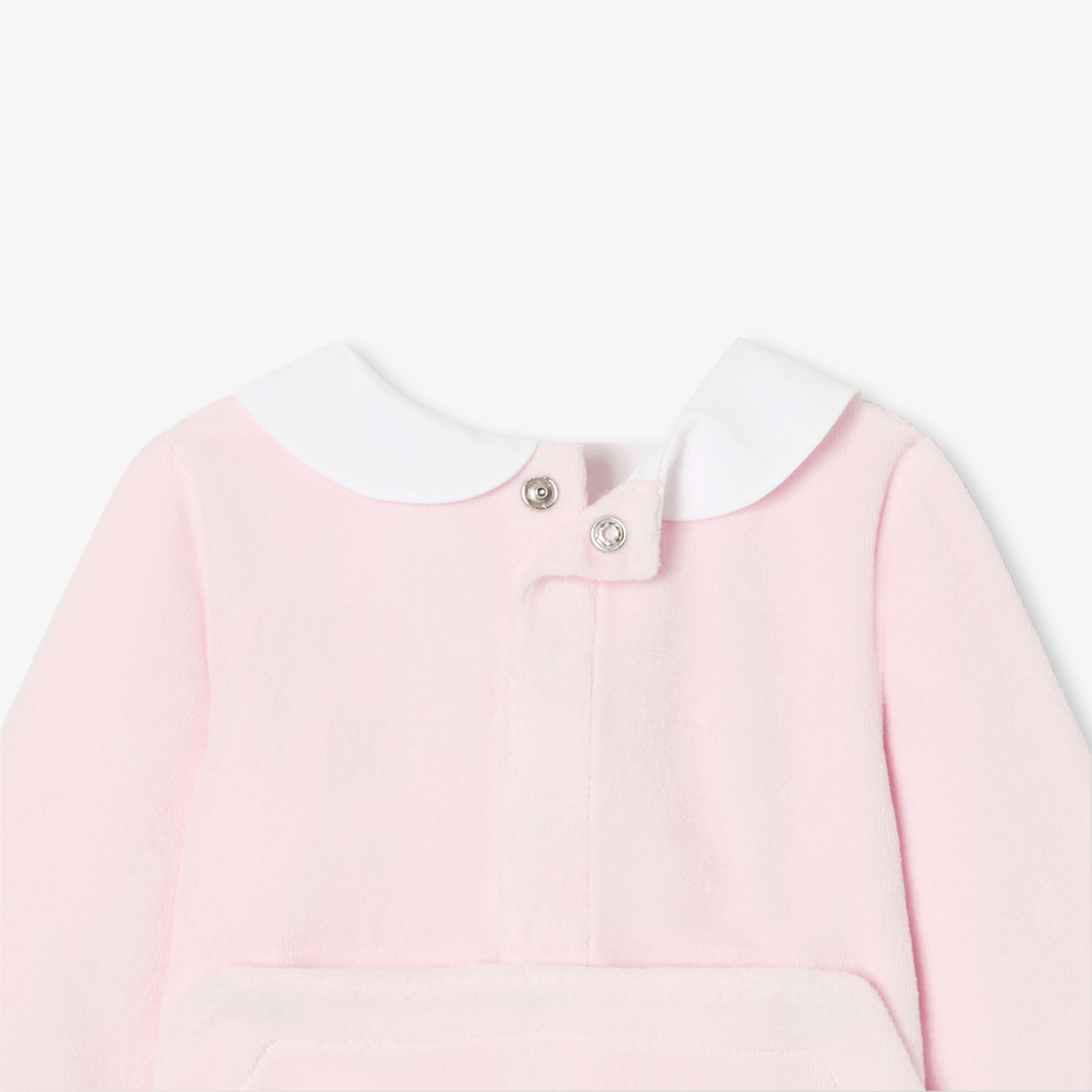 Ideale da mettere nel corredino nascita, il pigiama bimba di questa stagione è elegantissimo. Realizzato in velluto bouclette e sormontato da un colletto tondo in popeline ricamato, questo capo essenziale per tutti i giorni si apre sul retro con bottoni a pressione e può essere coordinato con un sacco nanna Jacadi per accompagnare le sue prime notti.