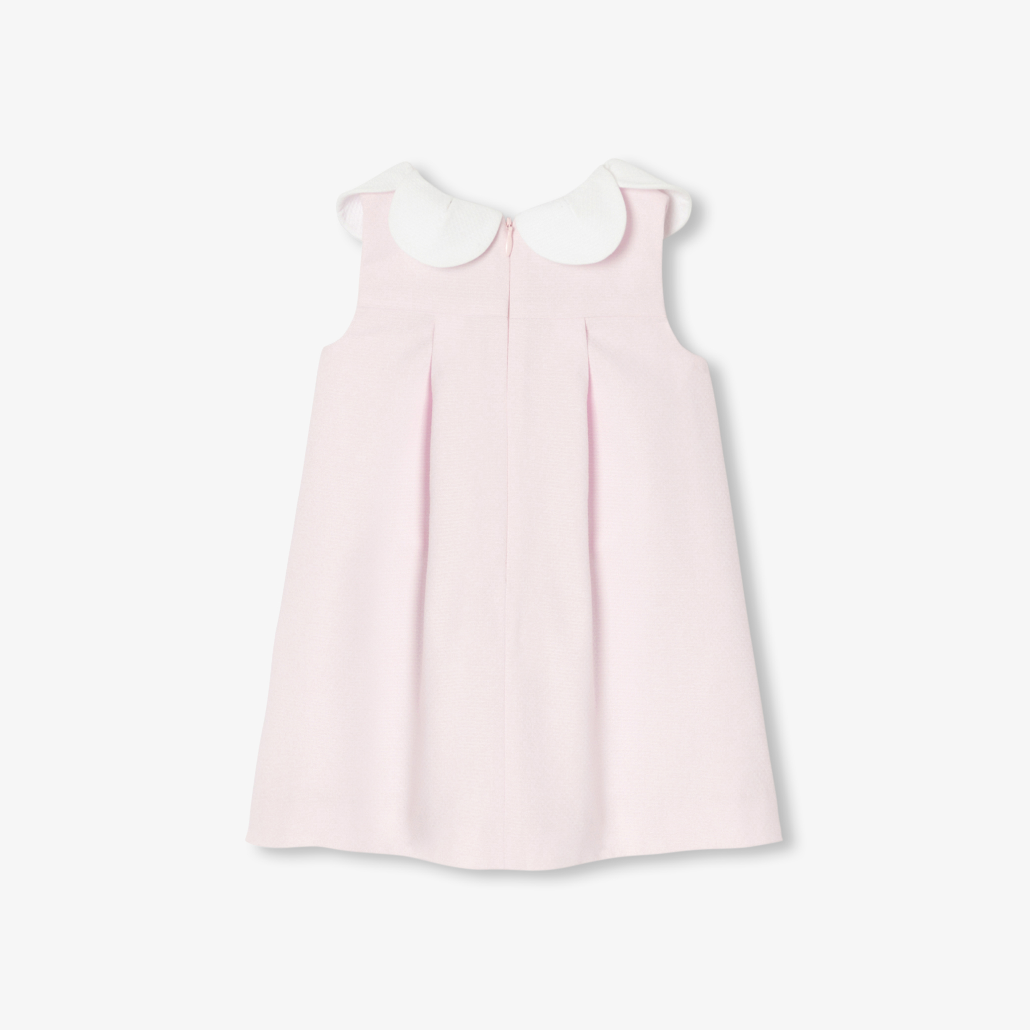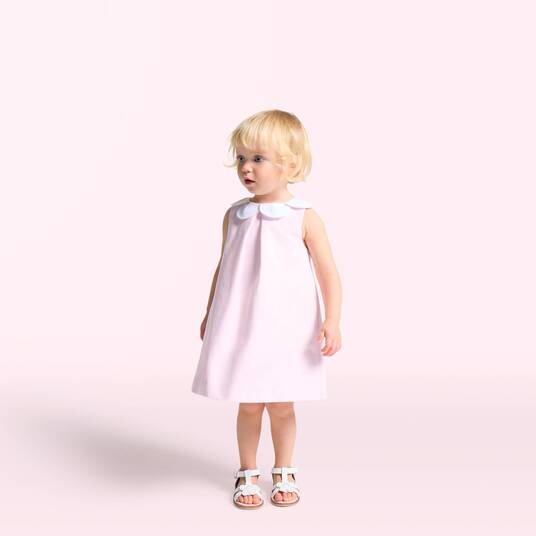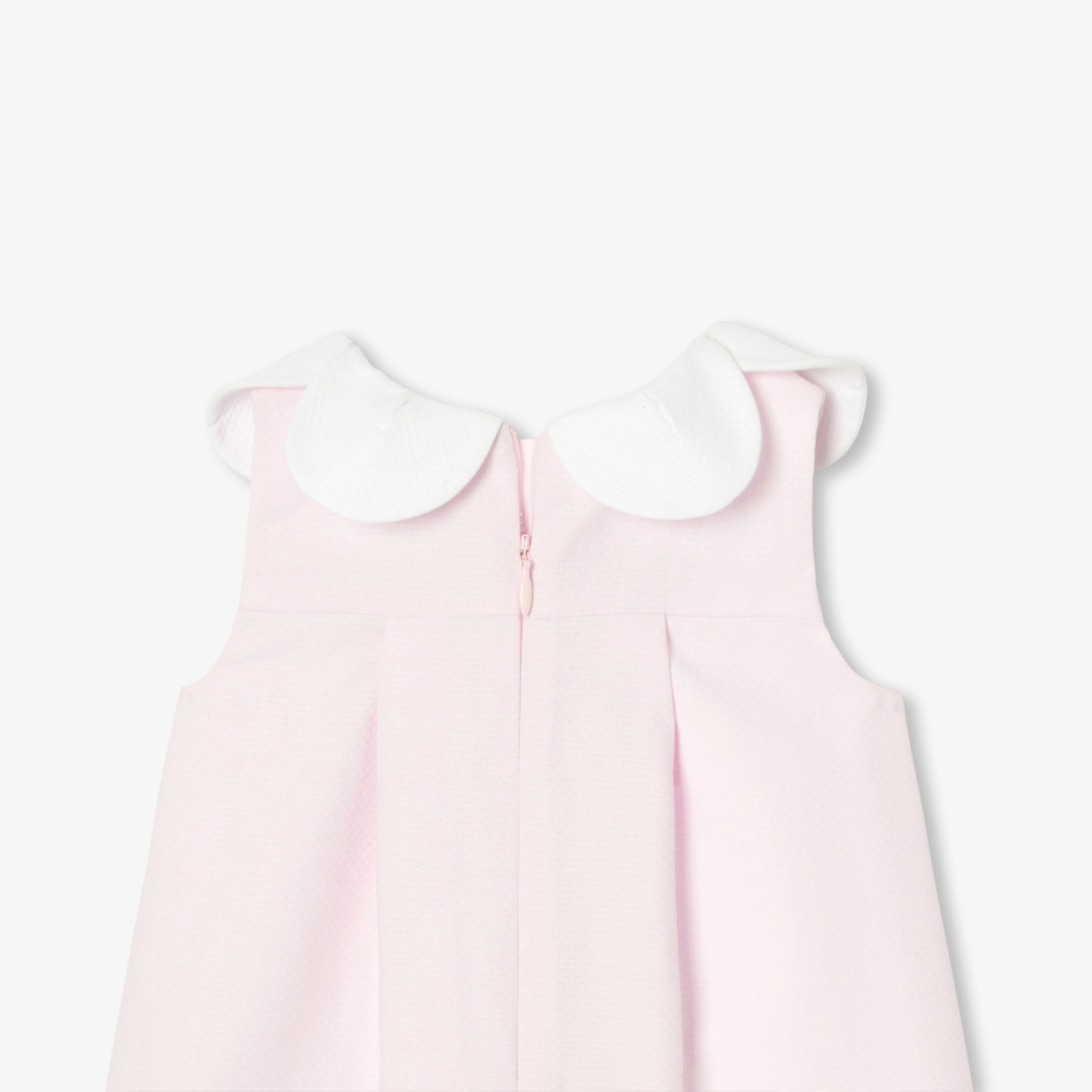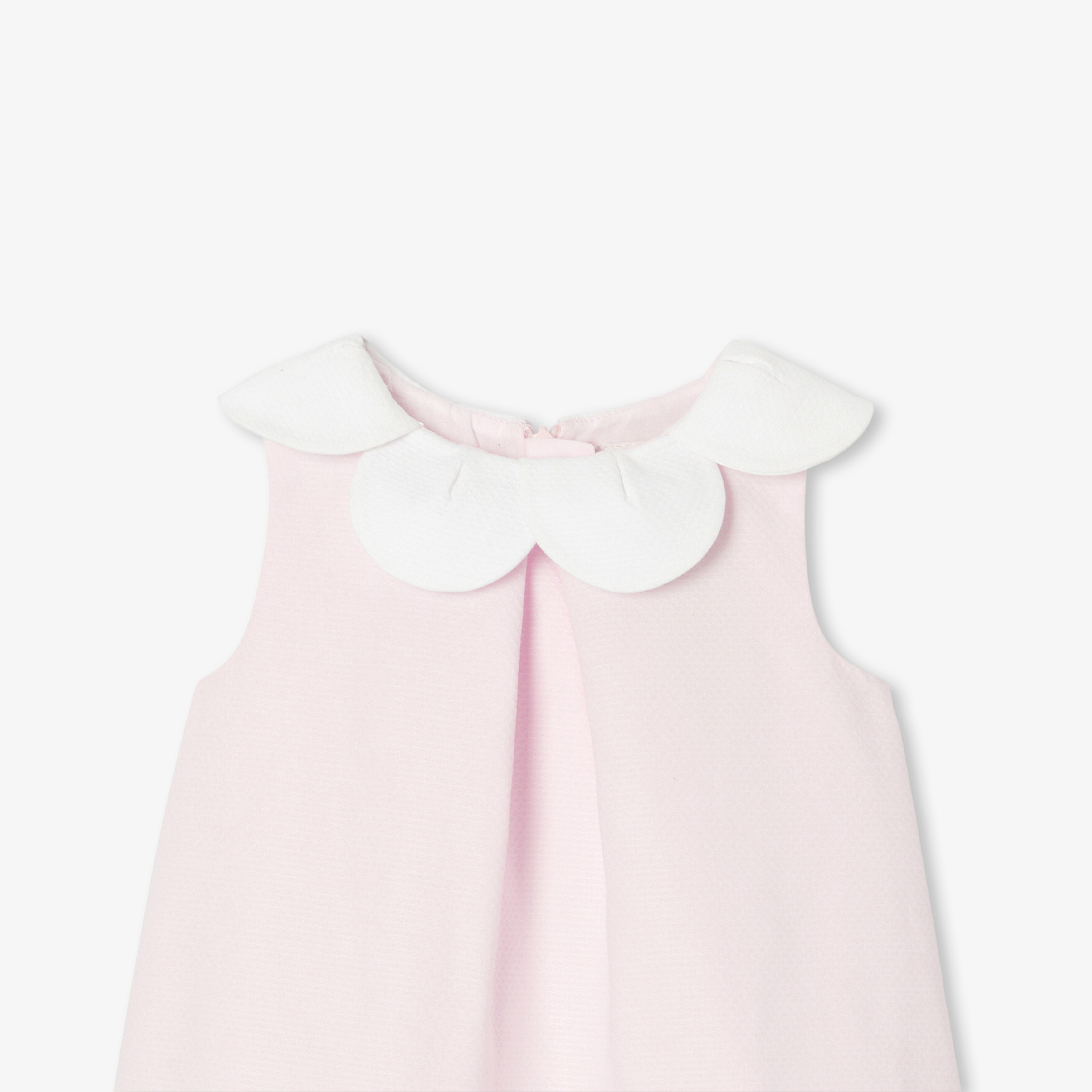 Con il suo taglio a trapezio minimalista e lo spirito anni '60, questo abito da cerimonia bimba è una dichiarazione di stile. Realizzato in cotone a nido d'ape, il colletto a petalo a contrasto impreziosisce questo capo, da abbinare a un cappellino e a delle graziose décolleté per il grande giorno.