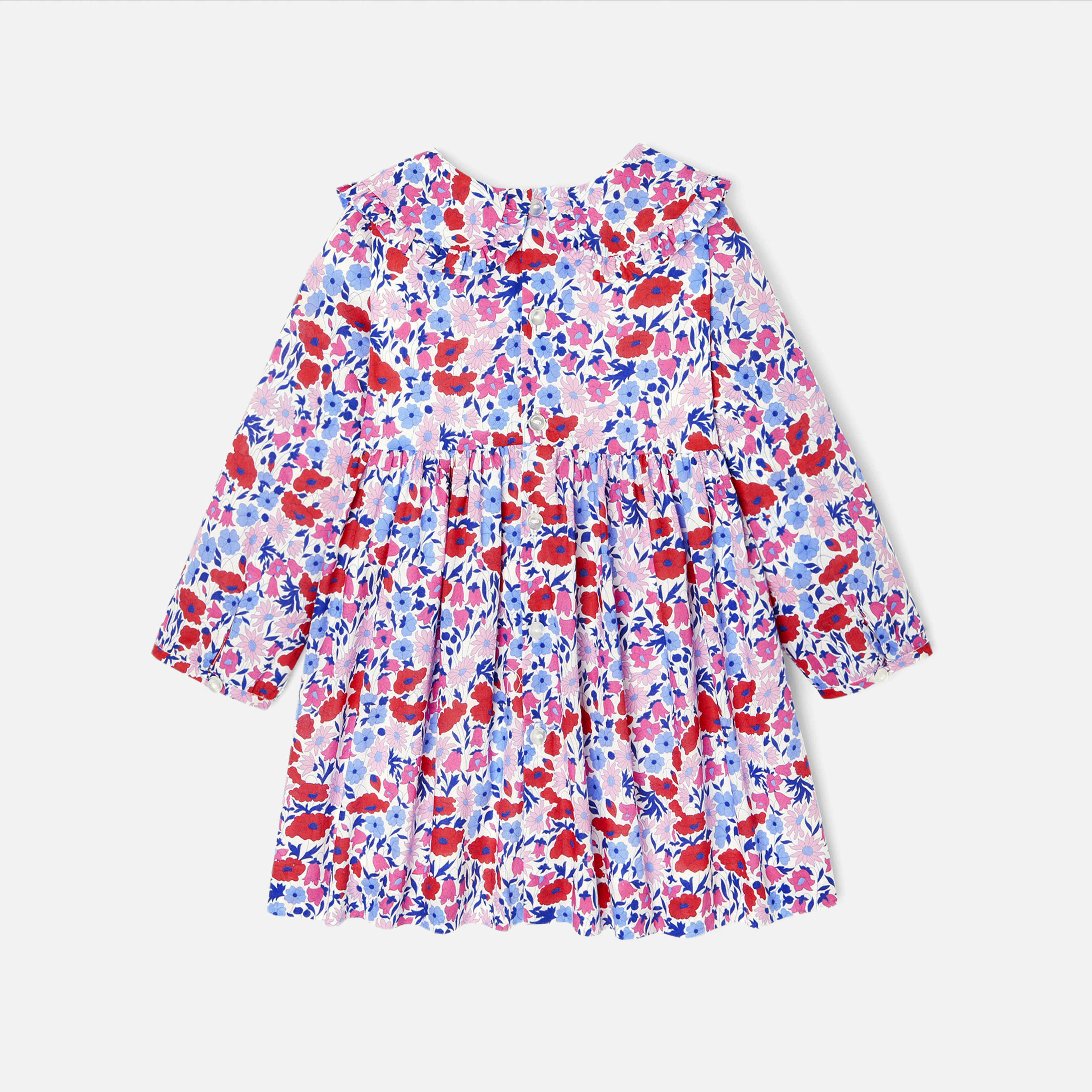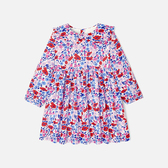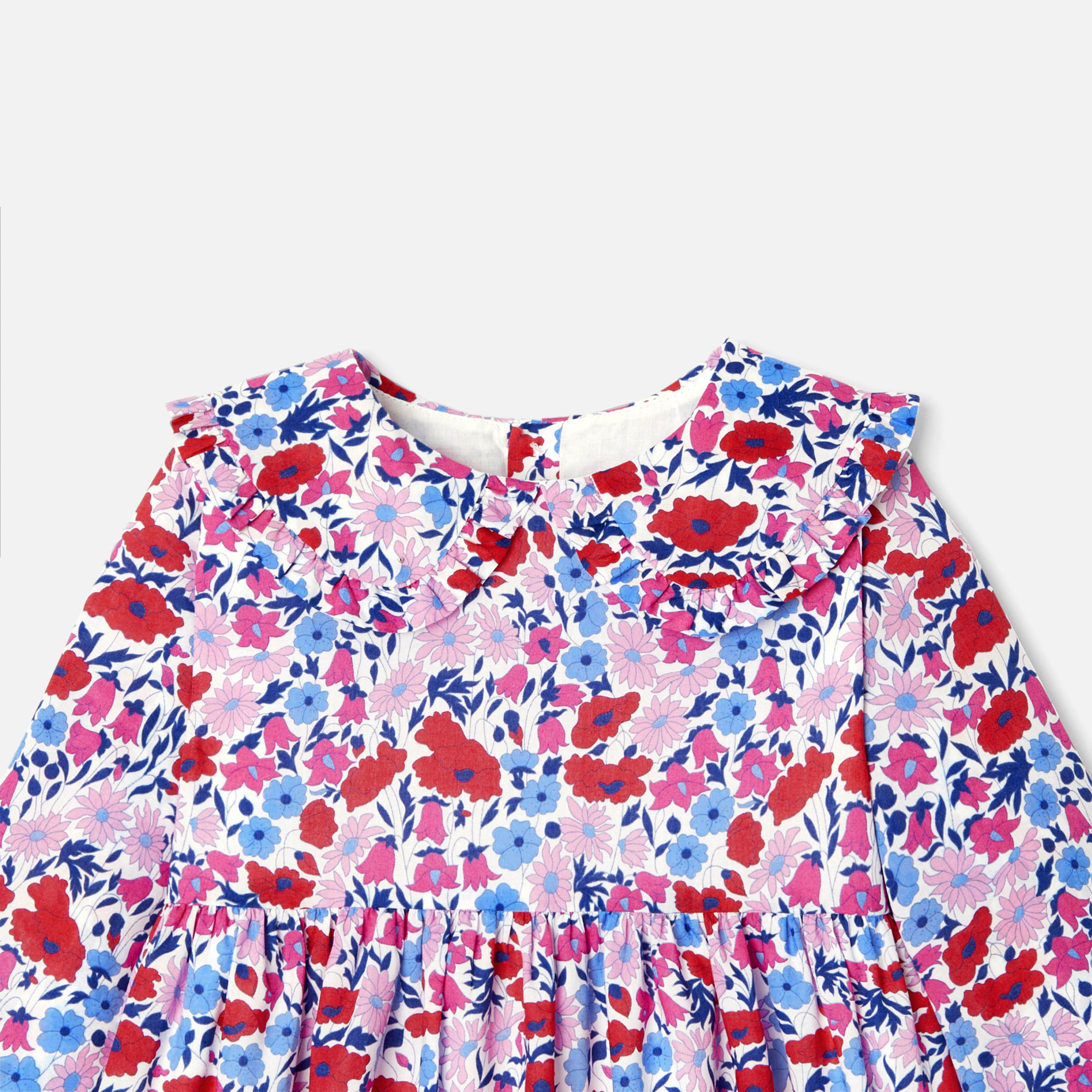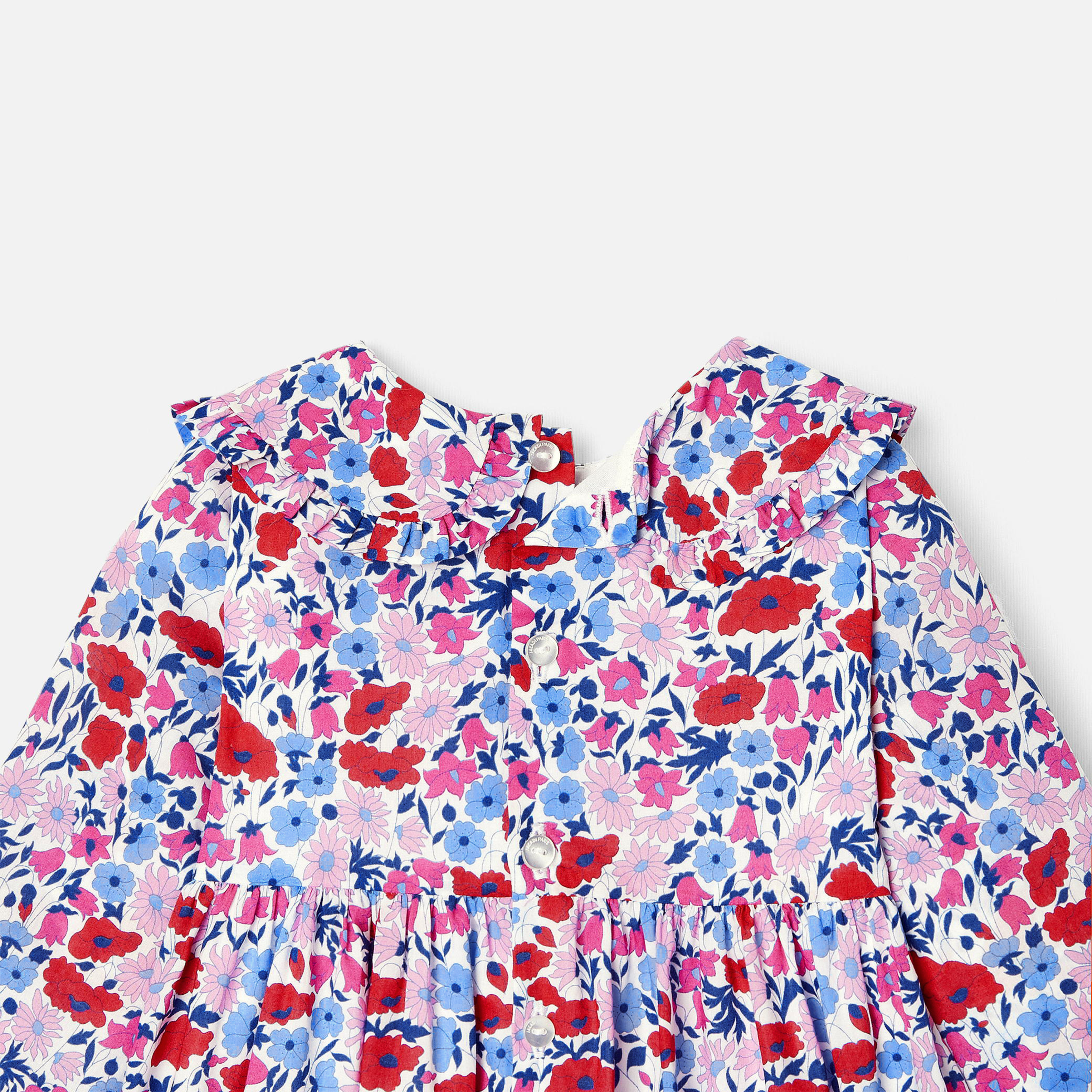 Quest'abito bimba associa il fascino di un allegro tessuto Liberty alla morbidezza del cotone. Ornato di un colletto tondo lavorato, vita arricciata e fondo manica più stretto abbelliscono questo capo dall'eleganza francese, ideale per la fine dell'estate.