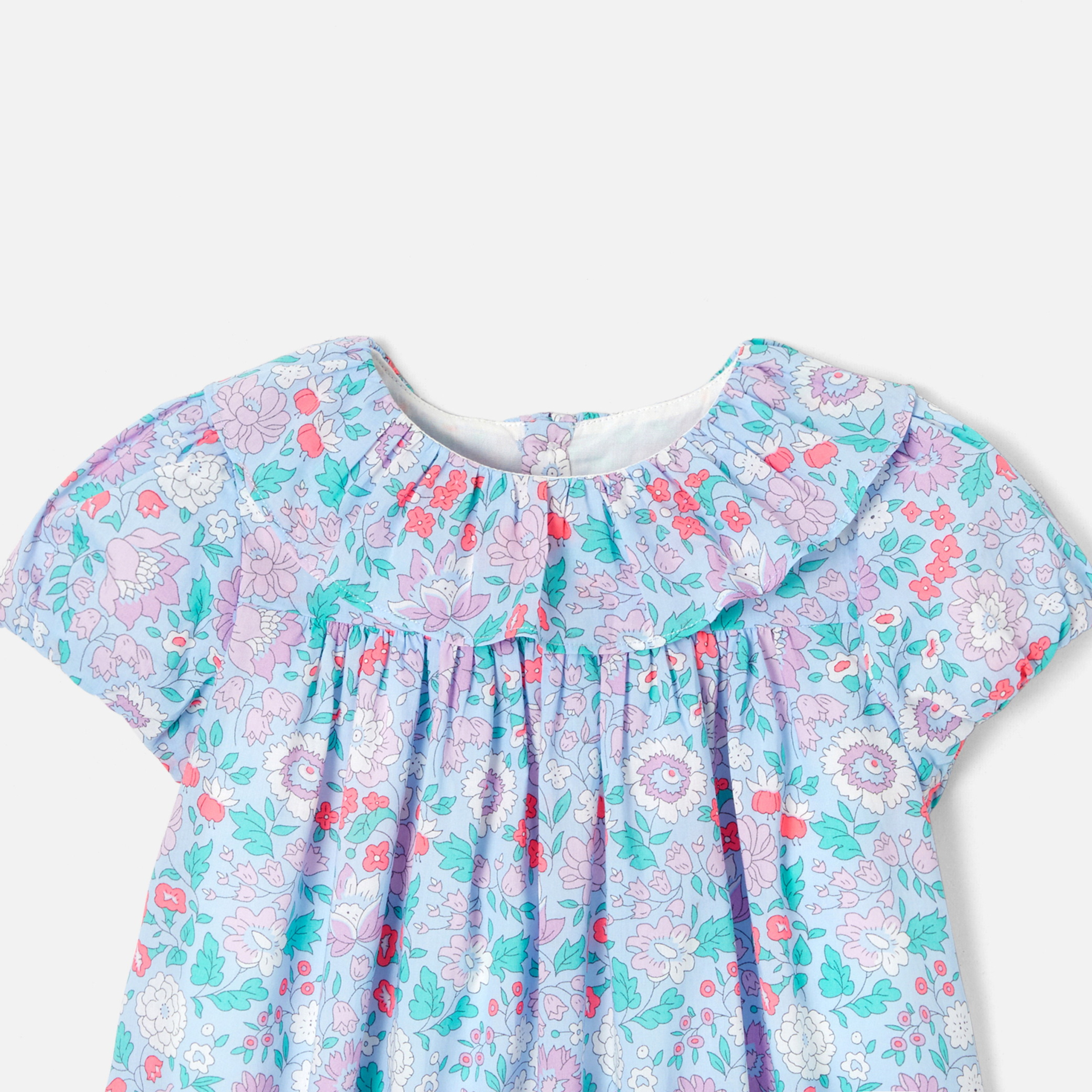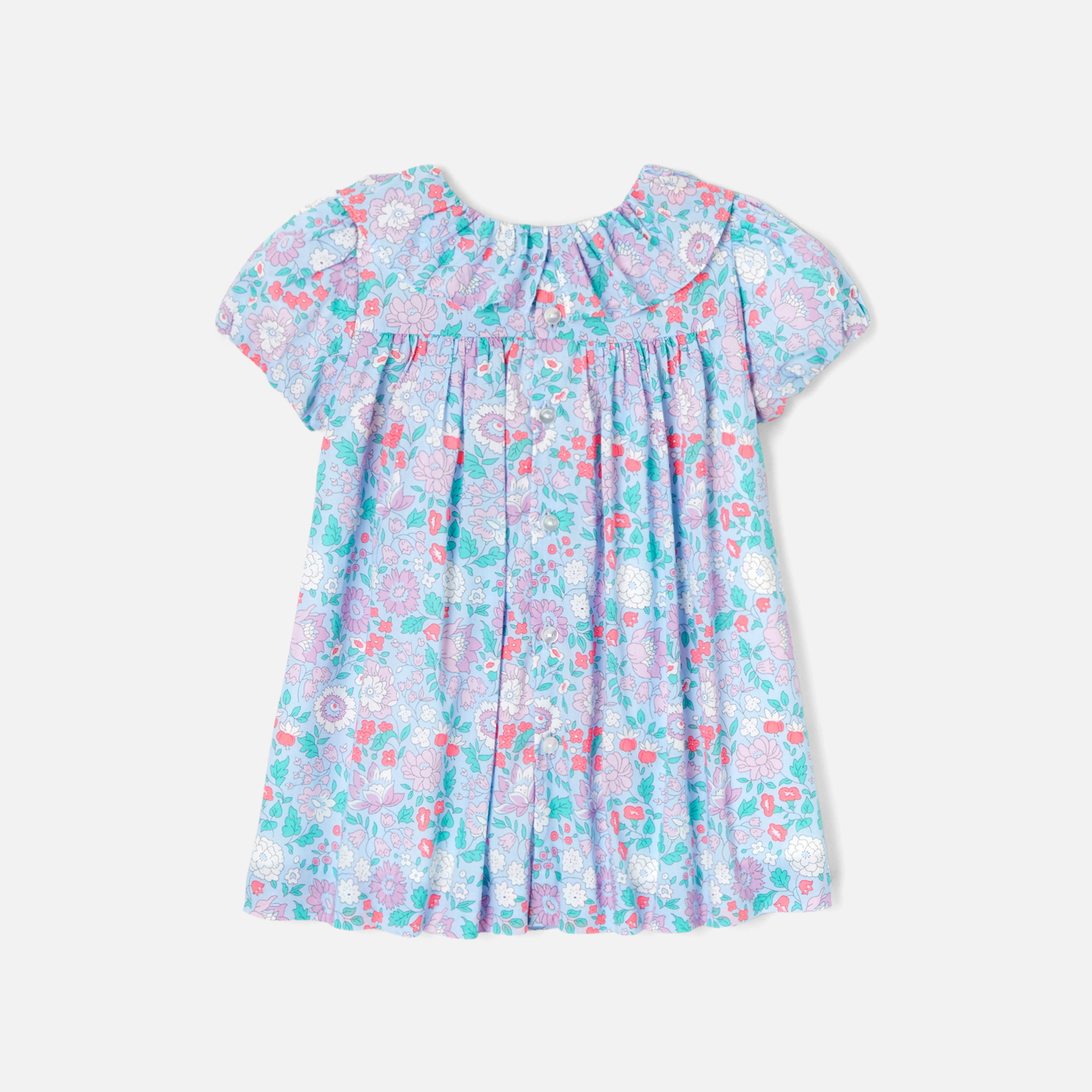 Colorato e cangiante, il guardaroba di fine estate offre capi di un'eleganza equilibrata come questo incantevole abito bimba. In tessuto Liberty, maniche a palloncino, colletto con volant, vita alta a pieghe per un bel volume abbelliscono questo modello fresco e autentico. Indossato sopra un cardigan, sarà perfetto per festeggiare un compleanno.