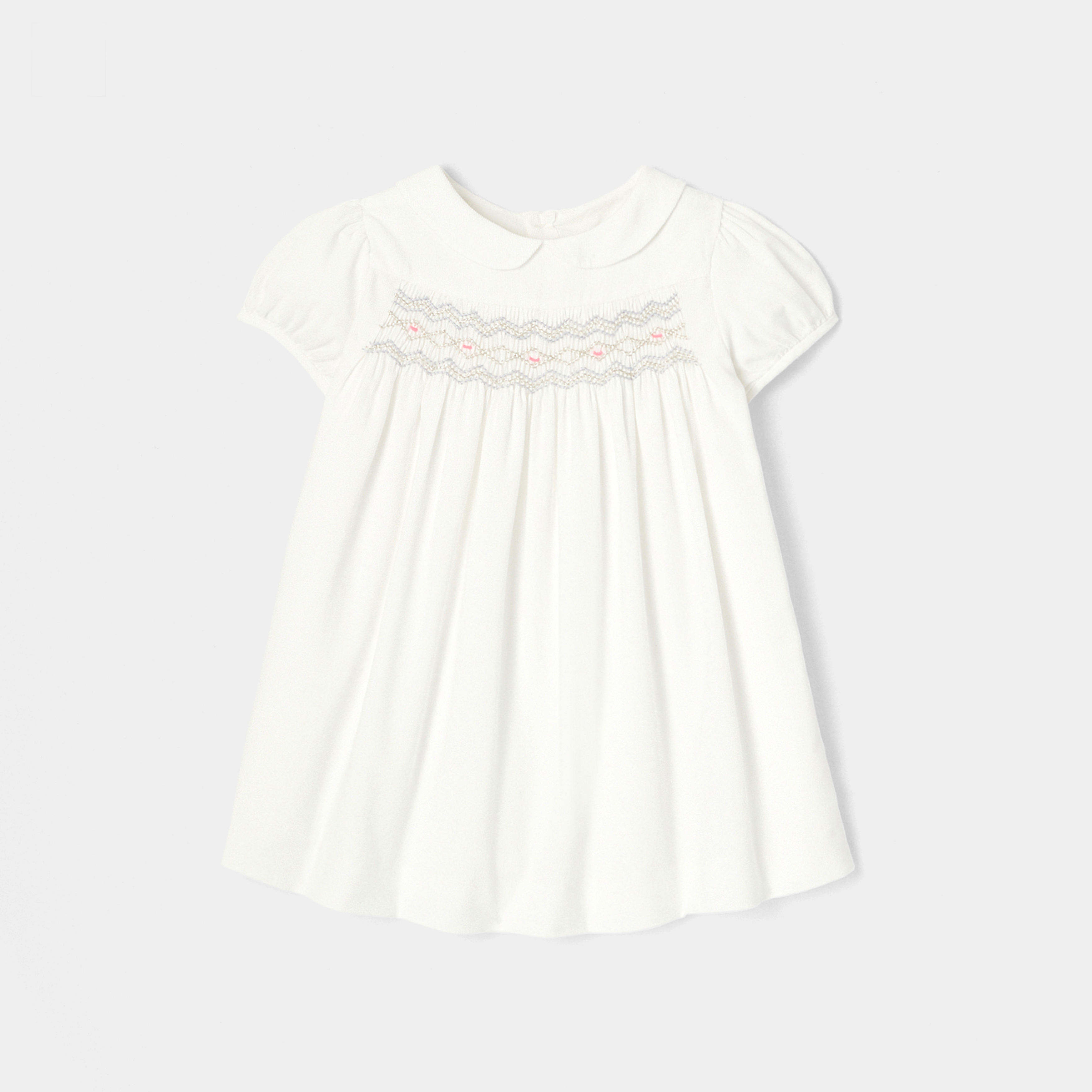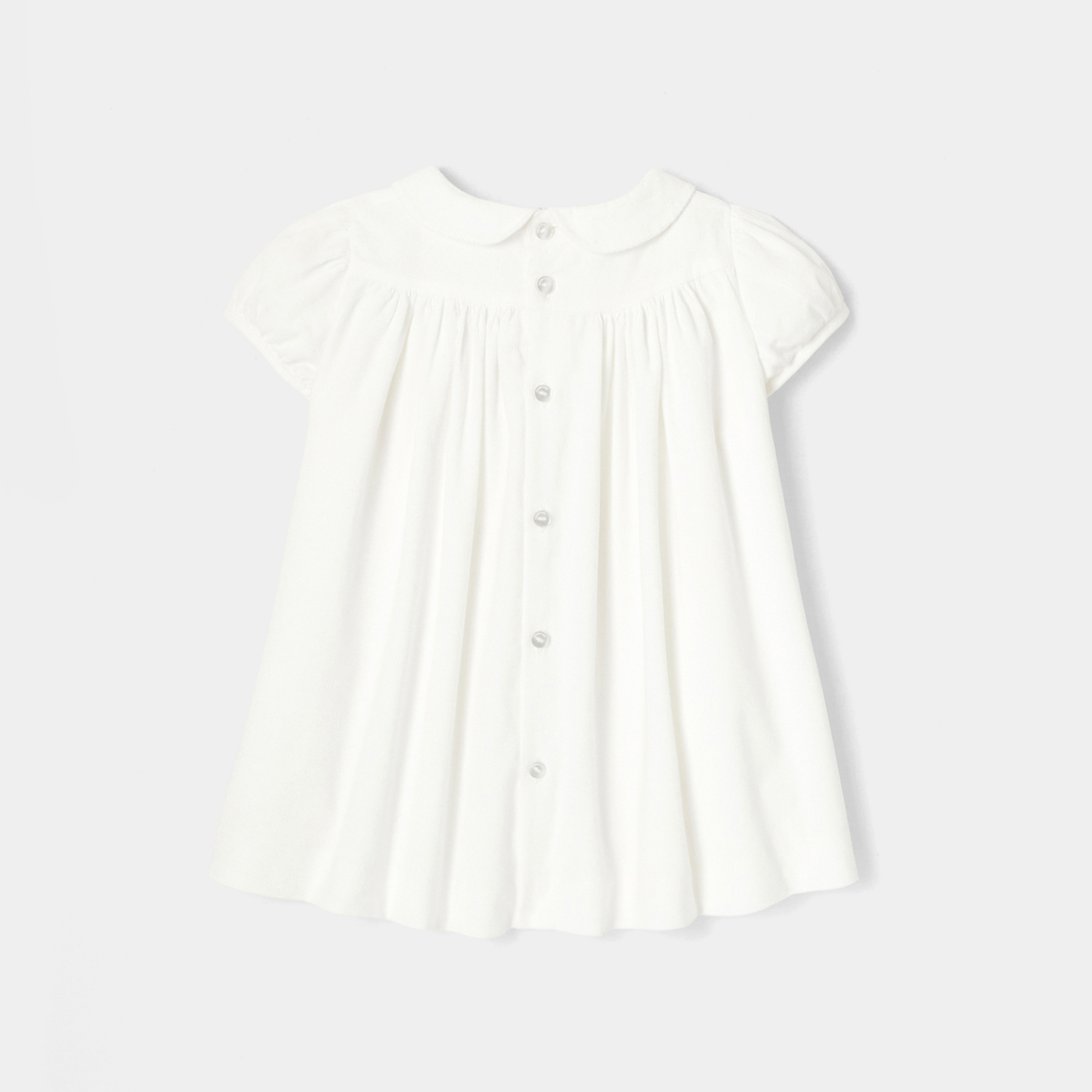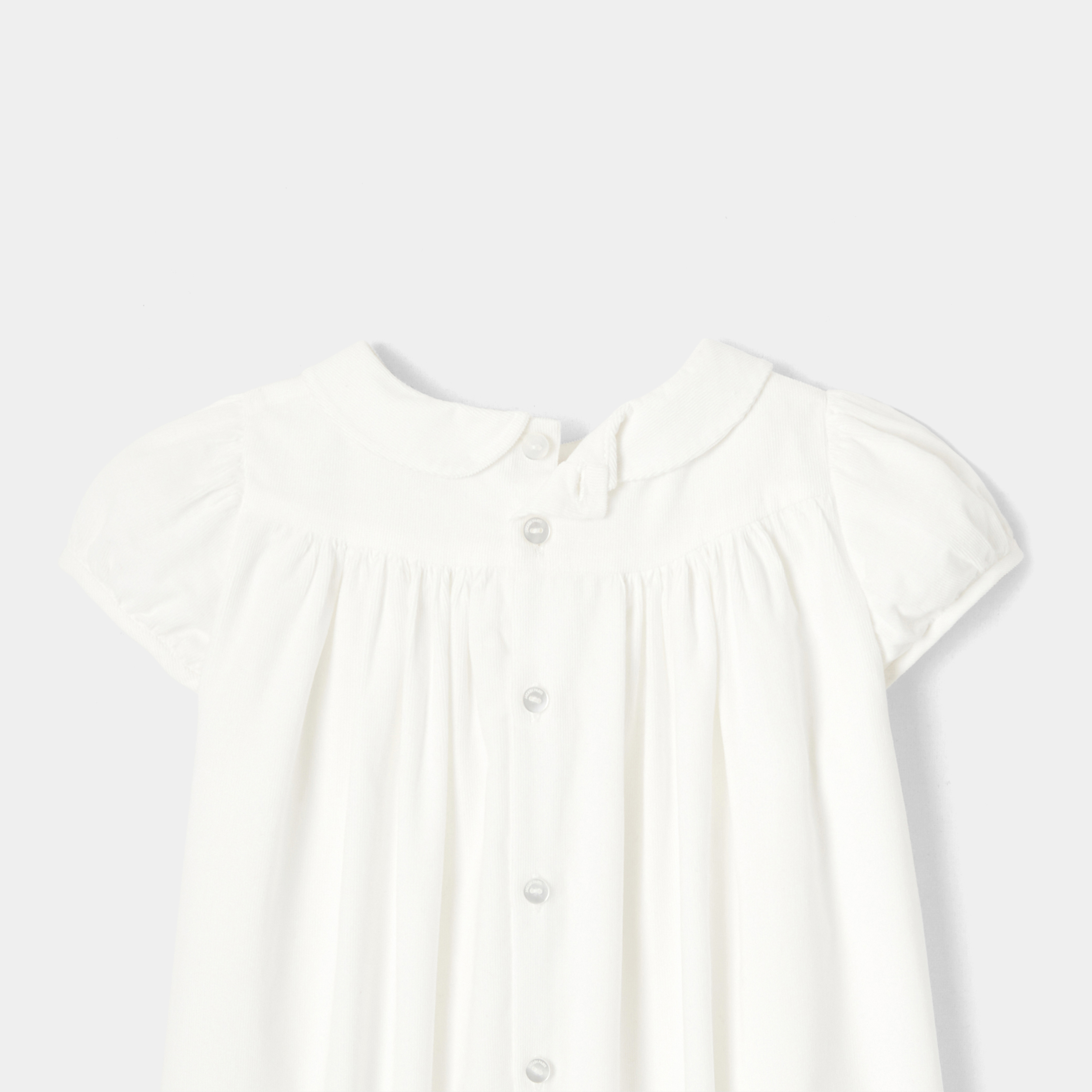 In velluto babycord morbido e piacevole, colletto tondo, giochi di ricami a punto smock sulla pettorina e maniche a palloncino abbelliscono quest'abito bimba dal fascino autentico. Le più piccole potranno indossarlo con collant caldi e un piumino per un inverno all'insegna del comfort e dell'eleganza.