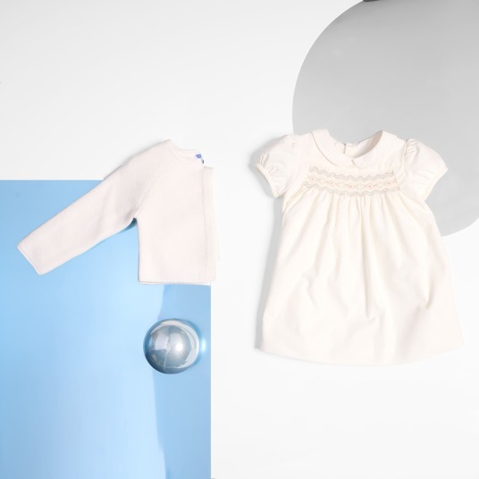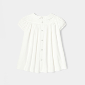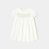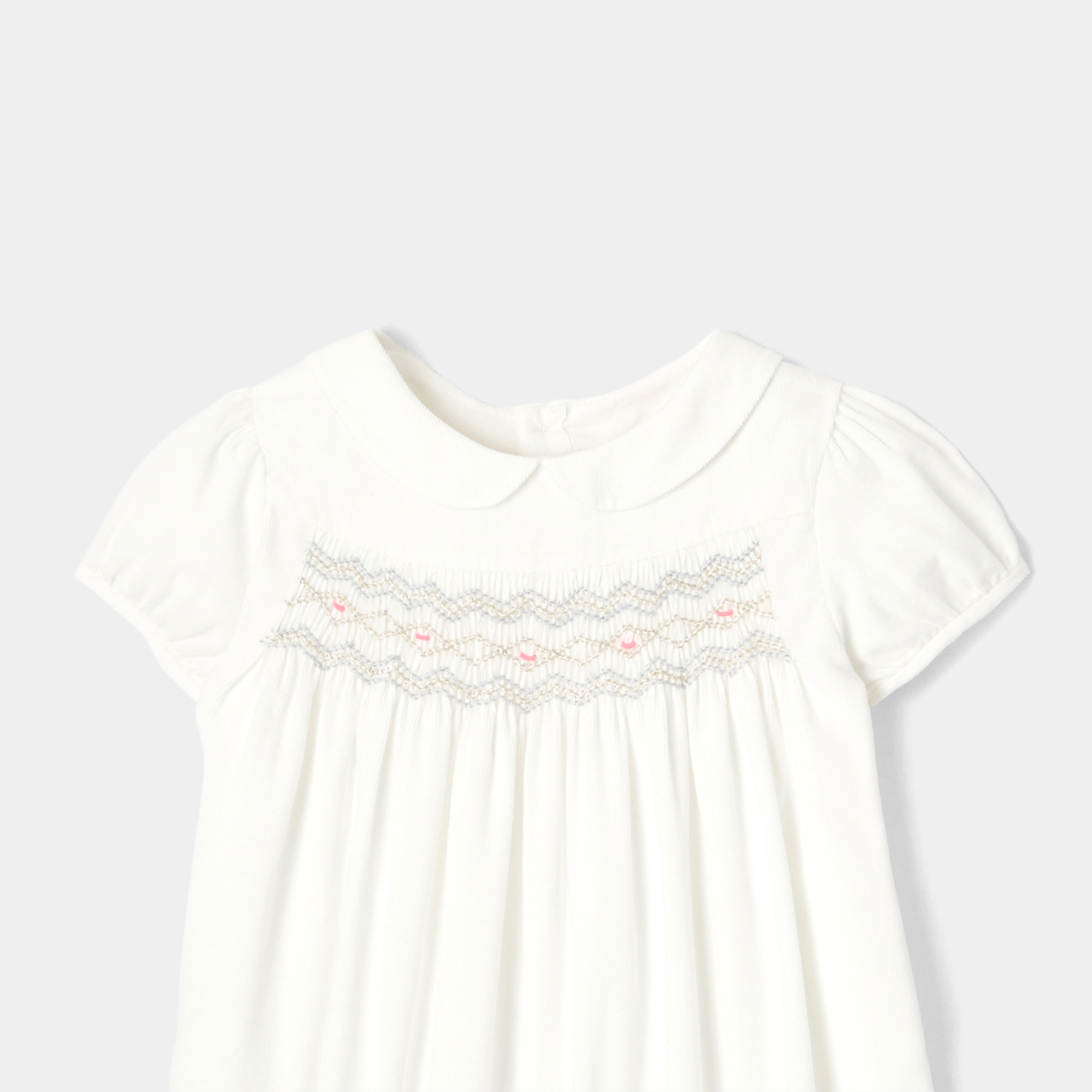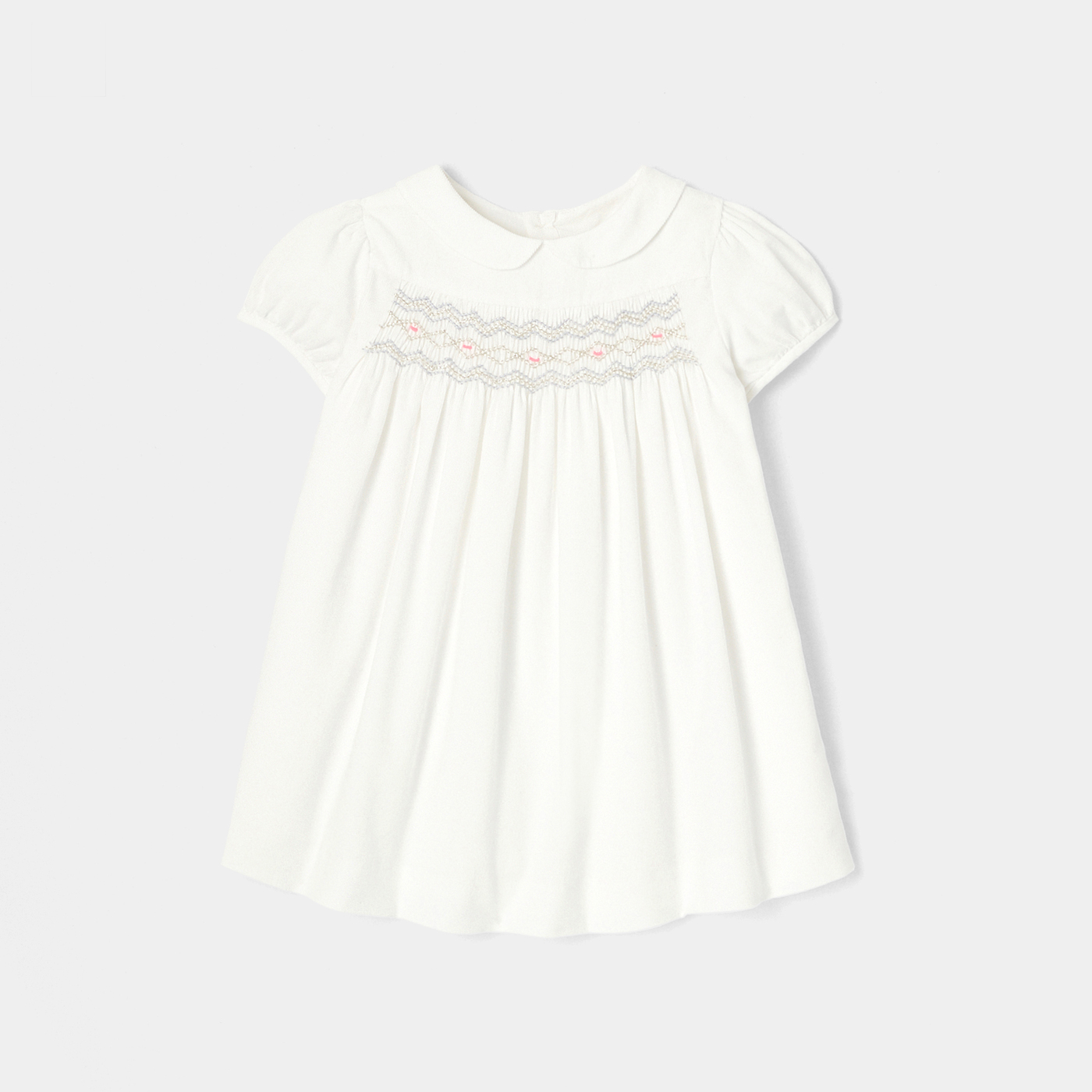 In velluto babycord morbido e piacevole, colletto tondo, giochi di ricami a punto smock sulla pettorina e maniche a palloncino abbelliscono quest'abito bimba dal fascino autentico. Le più piccole potranno indossarlo con collant caldi e un piumino per un inverno all'insegna del comfort e dell'eleganza.