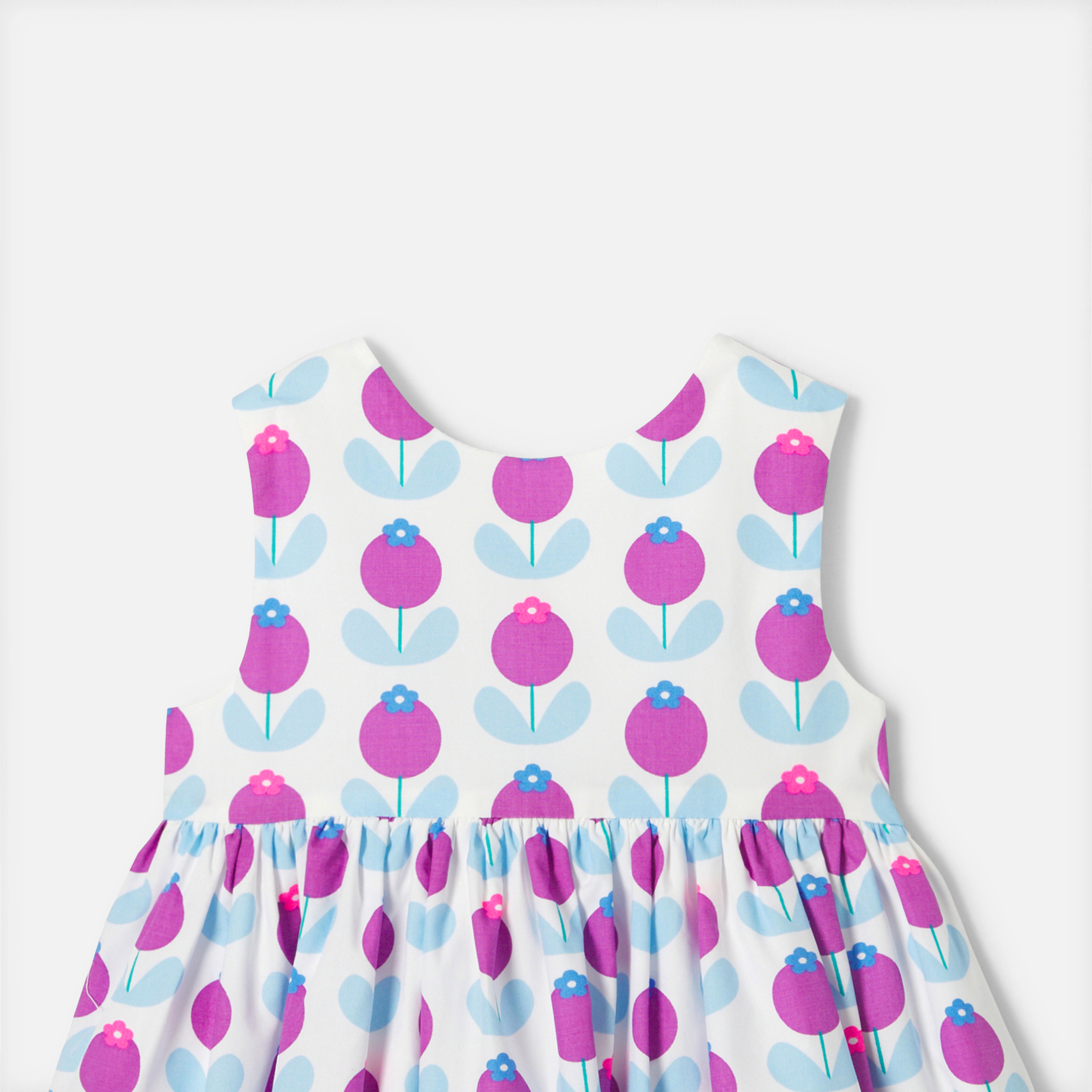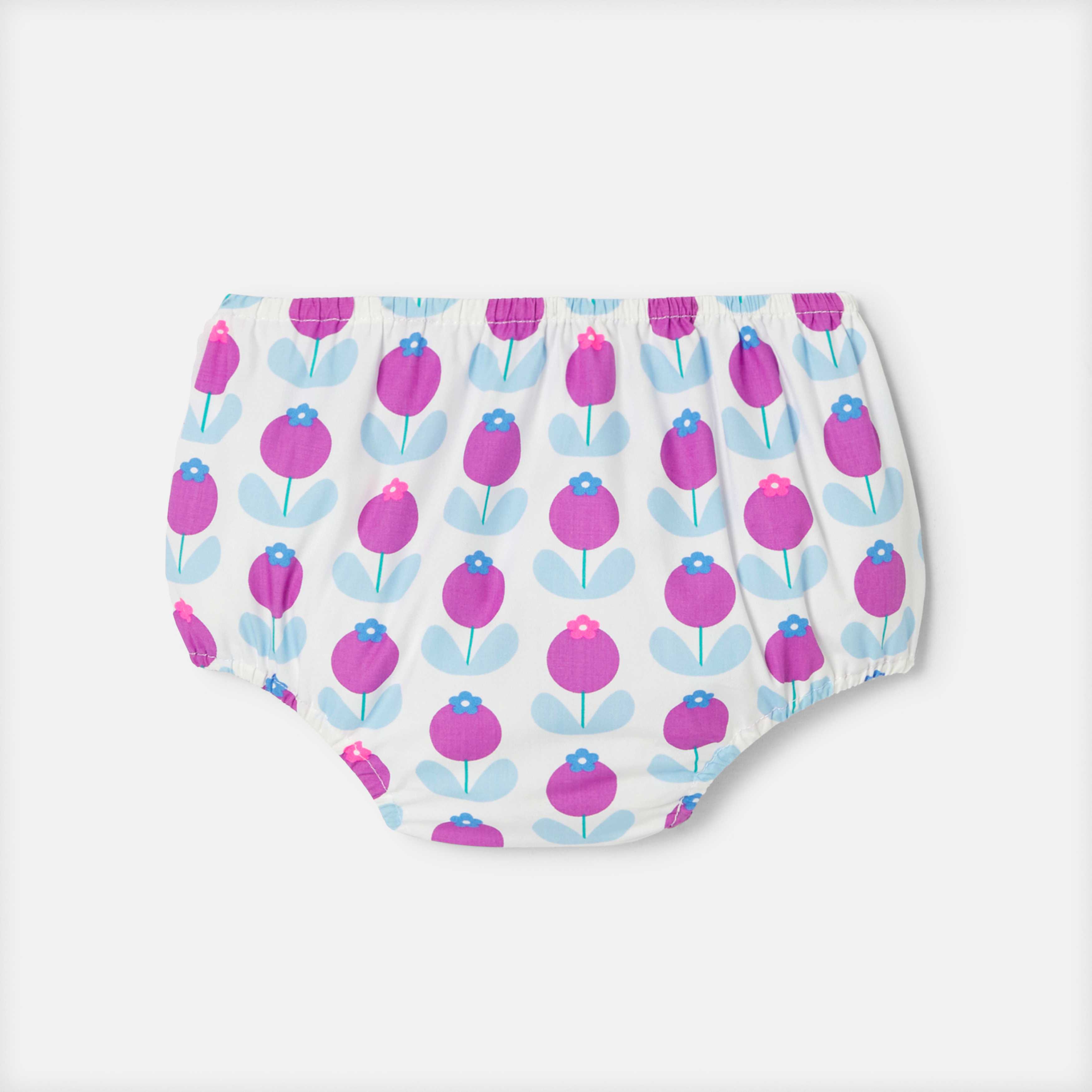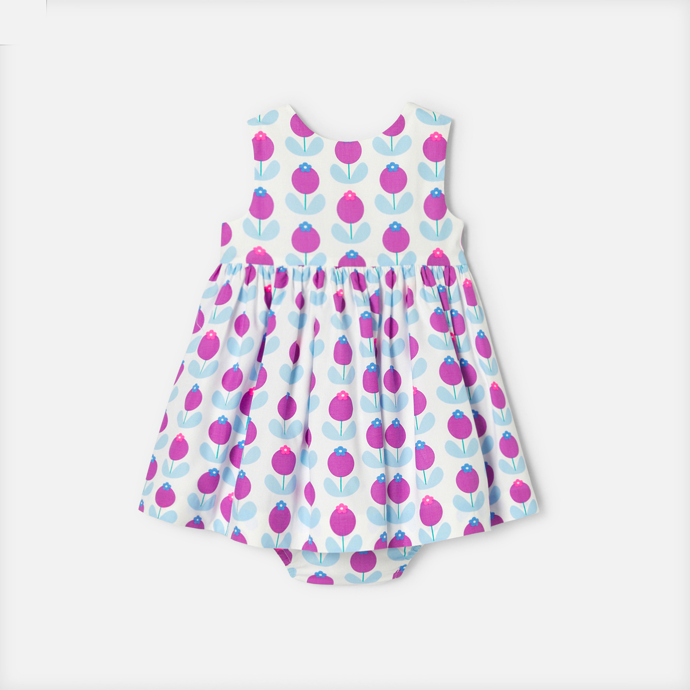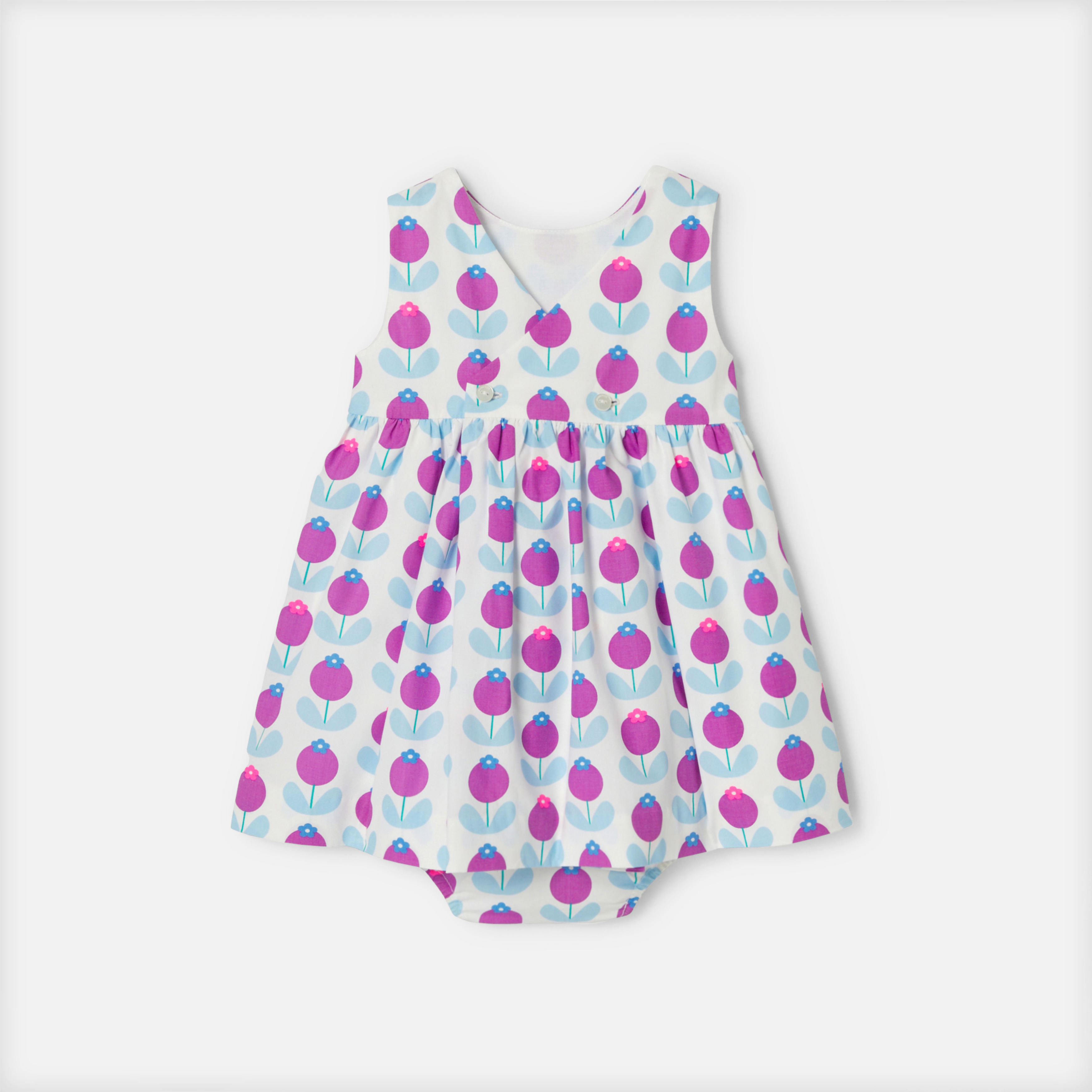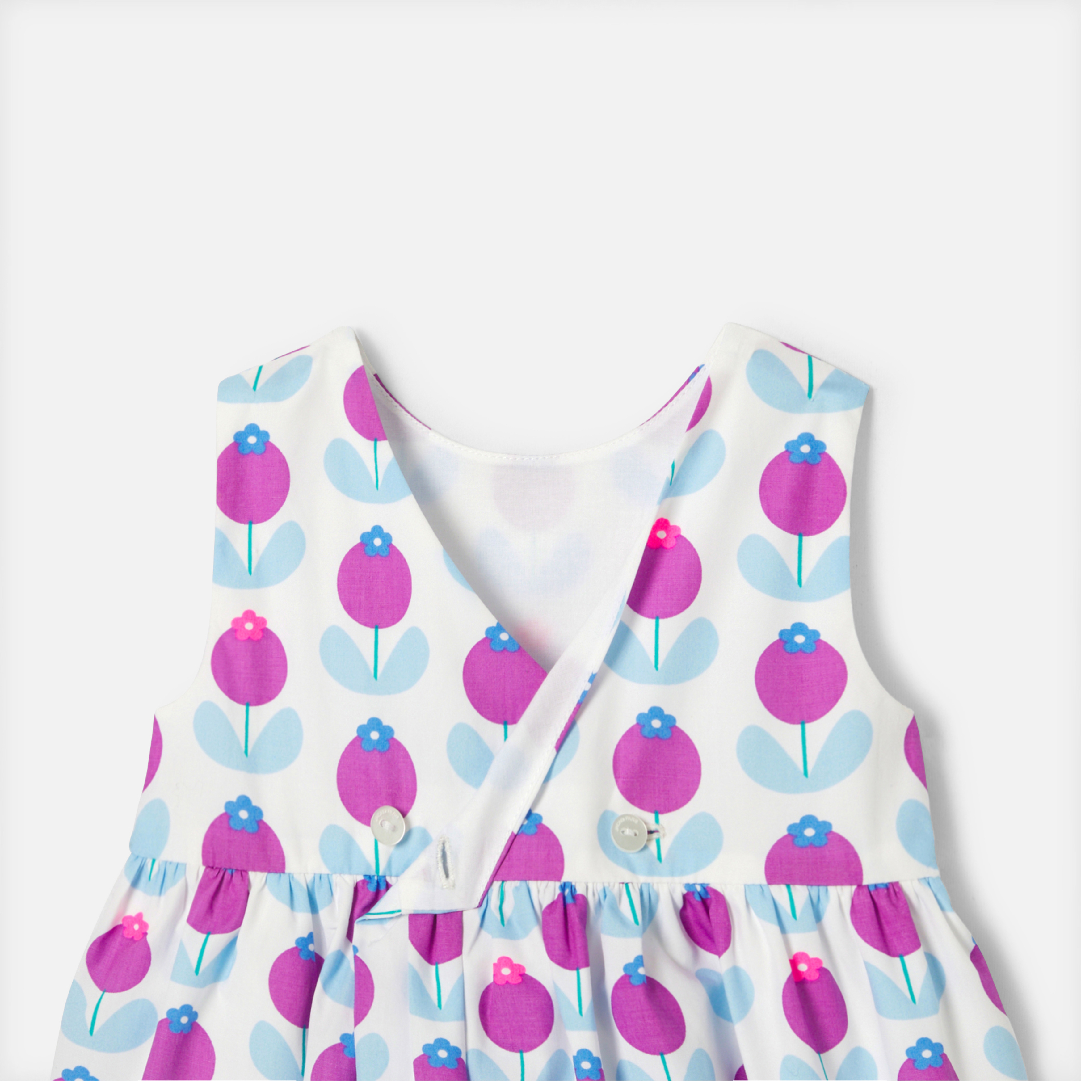 L'abito bimba di questa stagione presenta un volume strutturato e una stampa grafica e rétro per l'estate. Decorato con fiori stampati oversize, inserto arricciato e retro incrociato strutturano quest'abito coordinato con graziose mutandine per completare il look. Perfetto per le vacanze, sarà una bella idea di outfit da cerimonia.