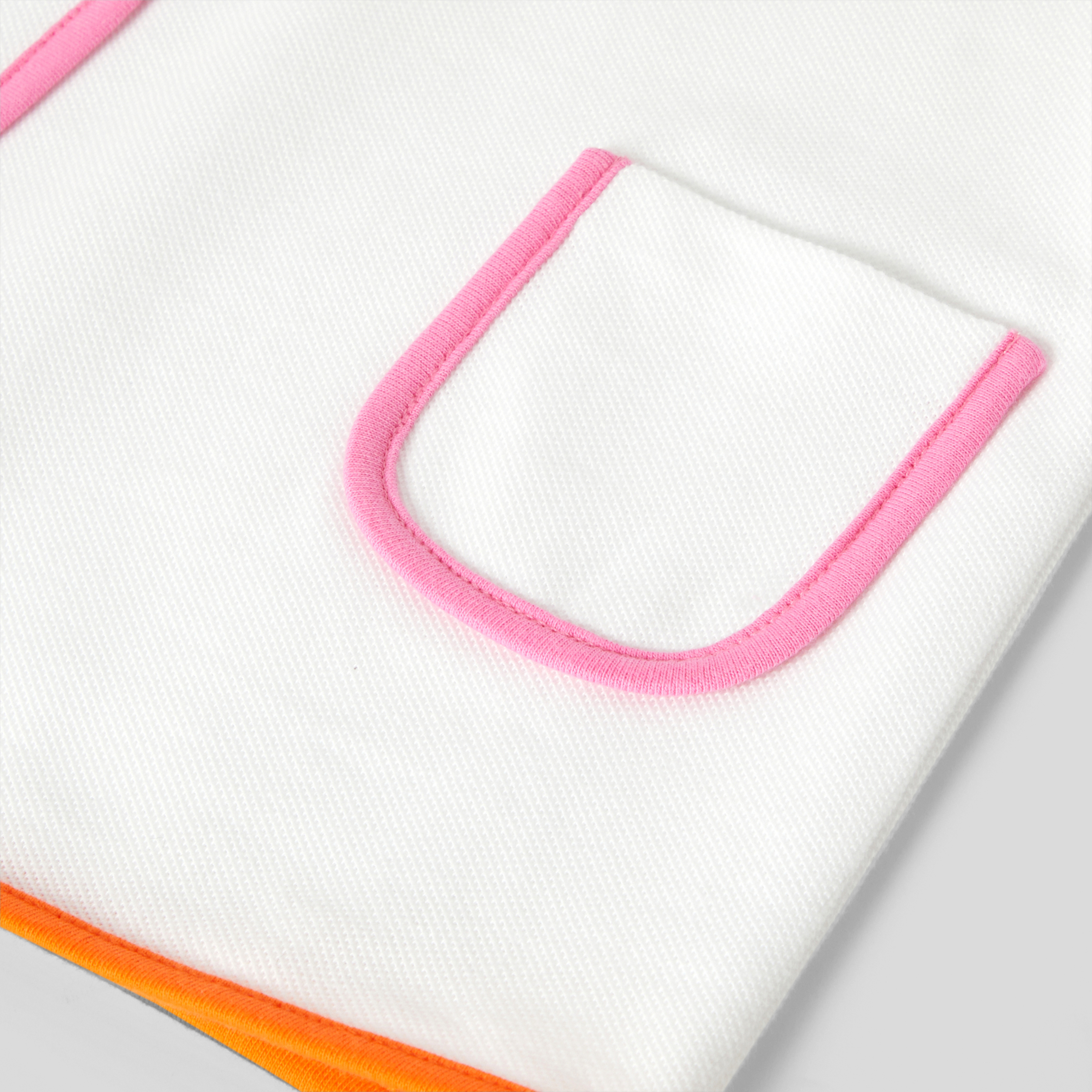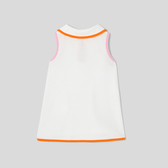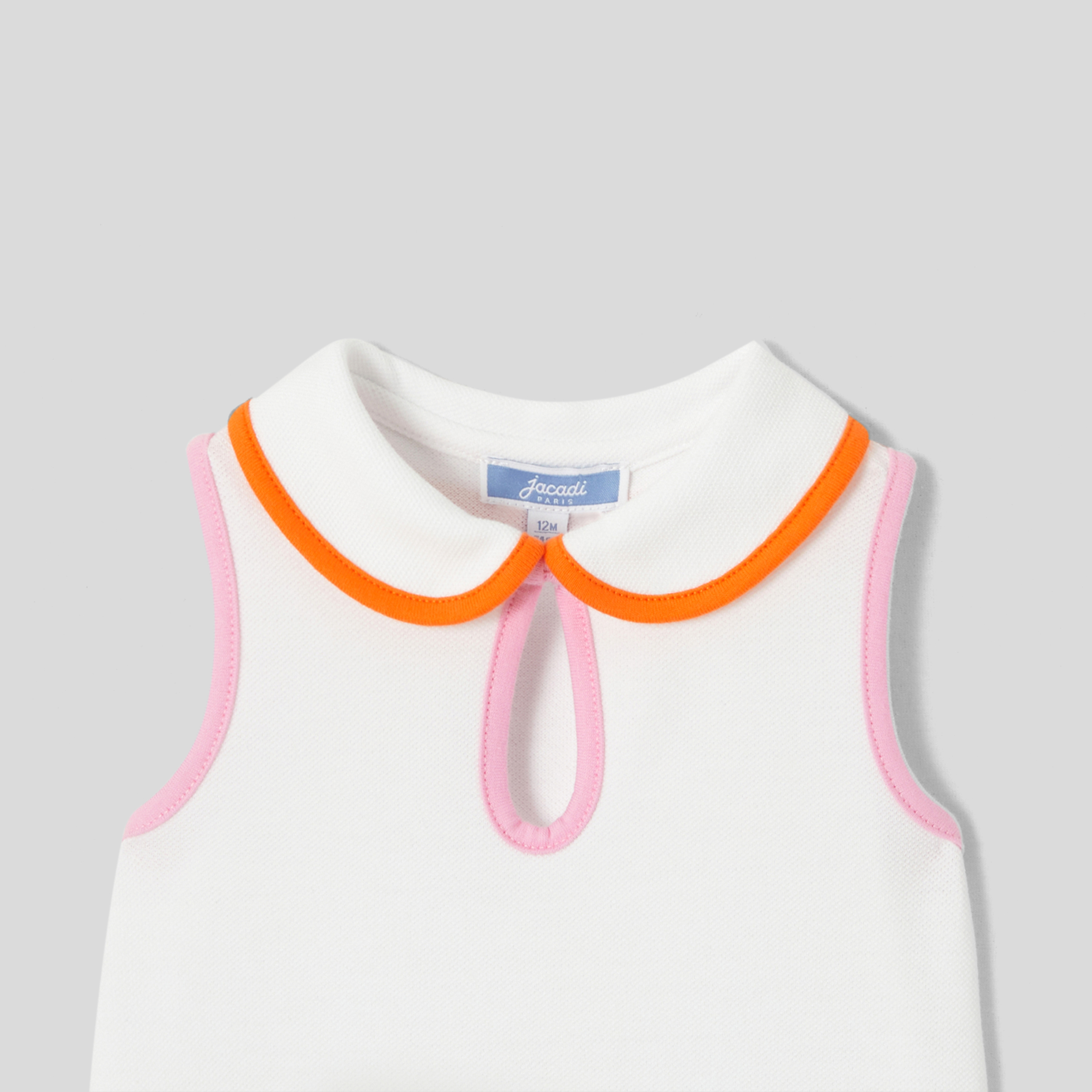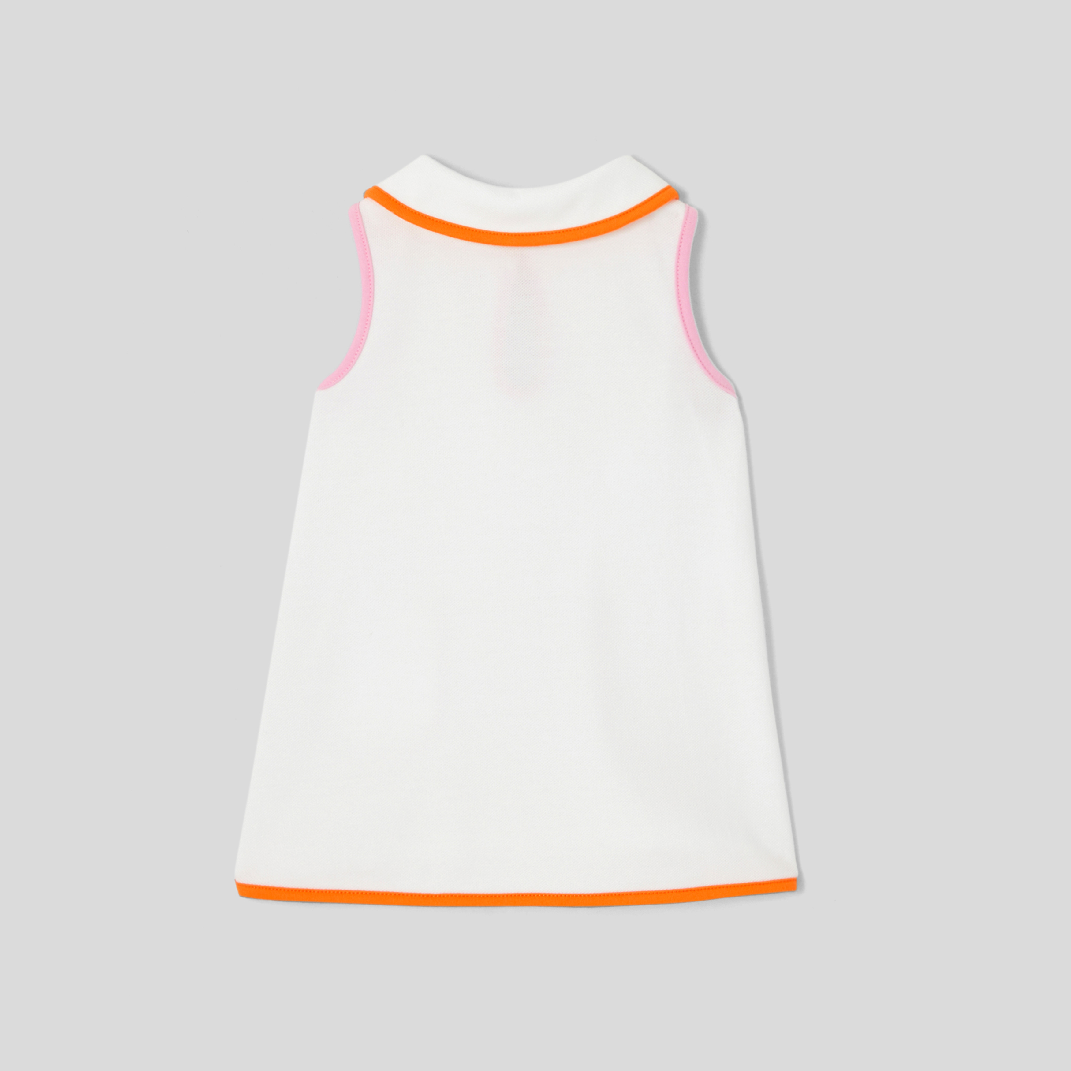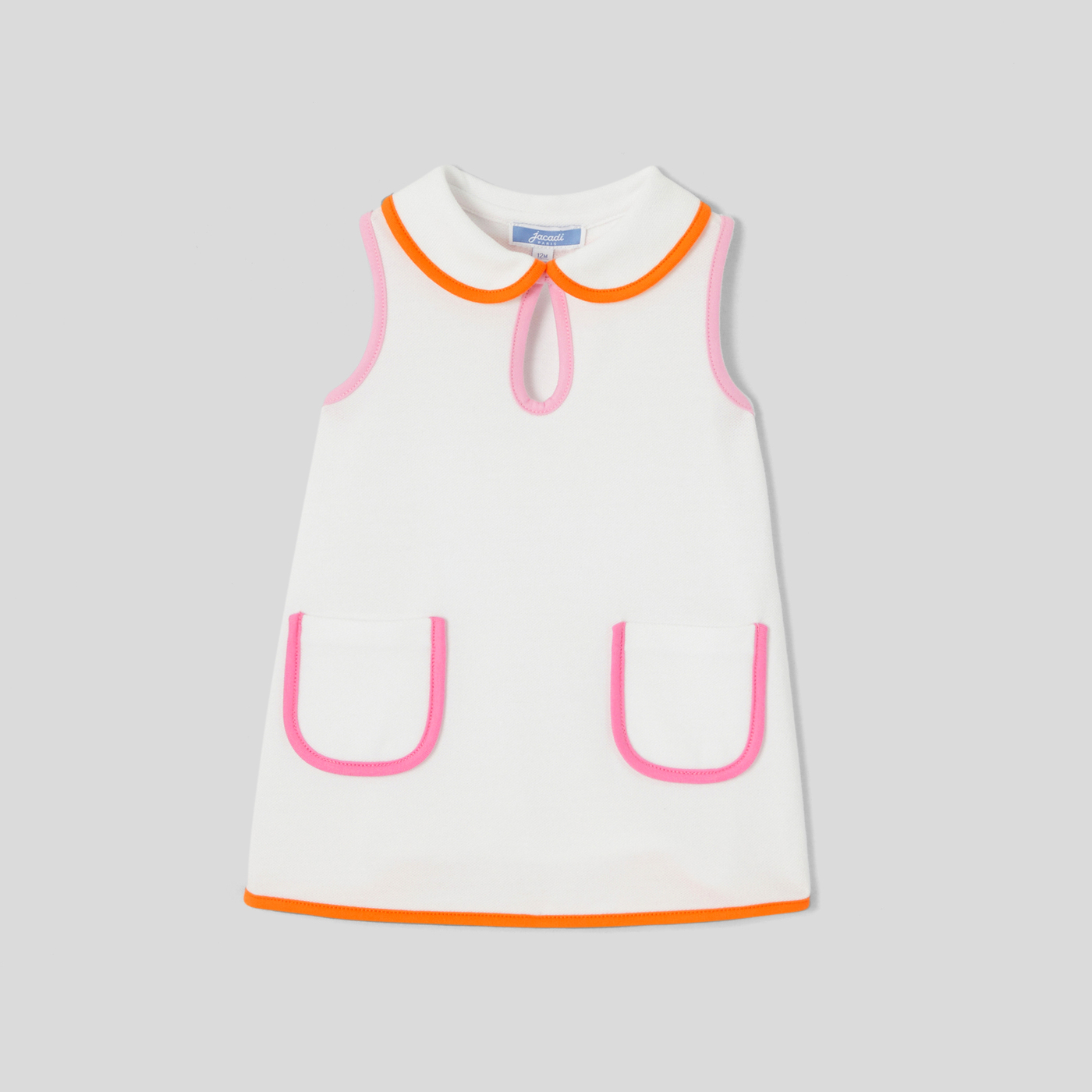 Grafico ed essenziale, l'abito bimba si indossa senza maniche per l'estate. In piqué di cotone, colletto tondo, tasche applicate e profili colorati abbelliscono quest'abito da abbinare a un cappello e a graziosi sandali.