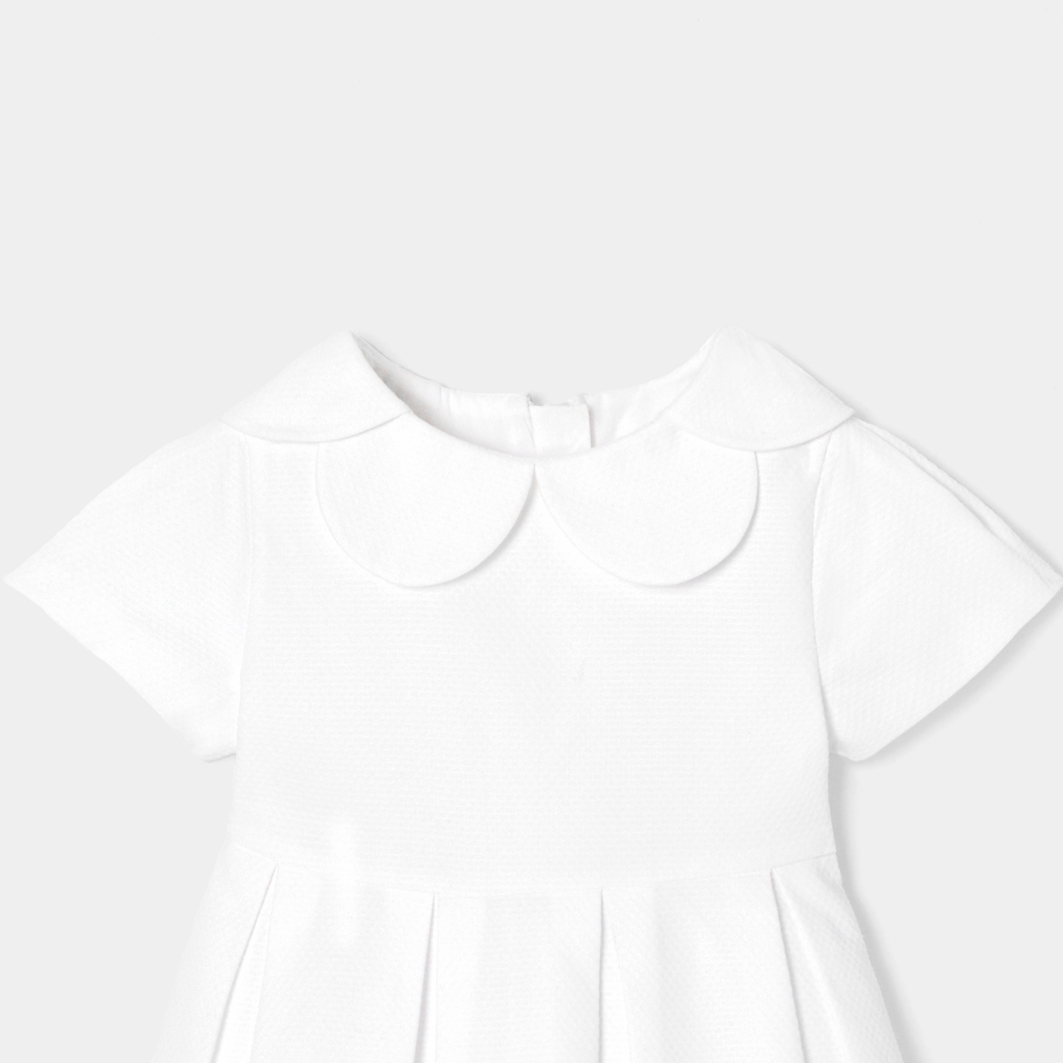 Ornato del colletto a petalo iconico di Jacadi e abbellito da un impeccabile lavoro di pieghe, quest'abito accompagnerà le bimbe per tutti i grandi eventi. In piqué di cotone foderato in voile di cotone, abbina quest'abito grafico e pieno di fascino a un cappello e a sandali aperti per una cerimonia estiva.