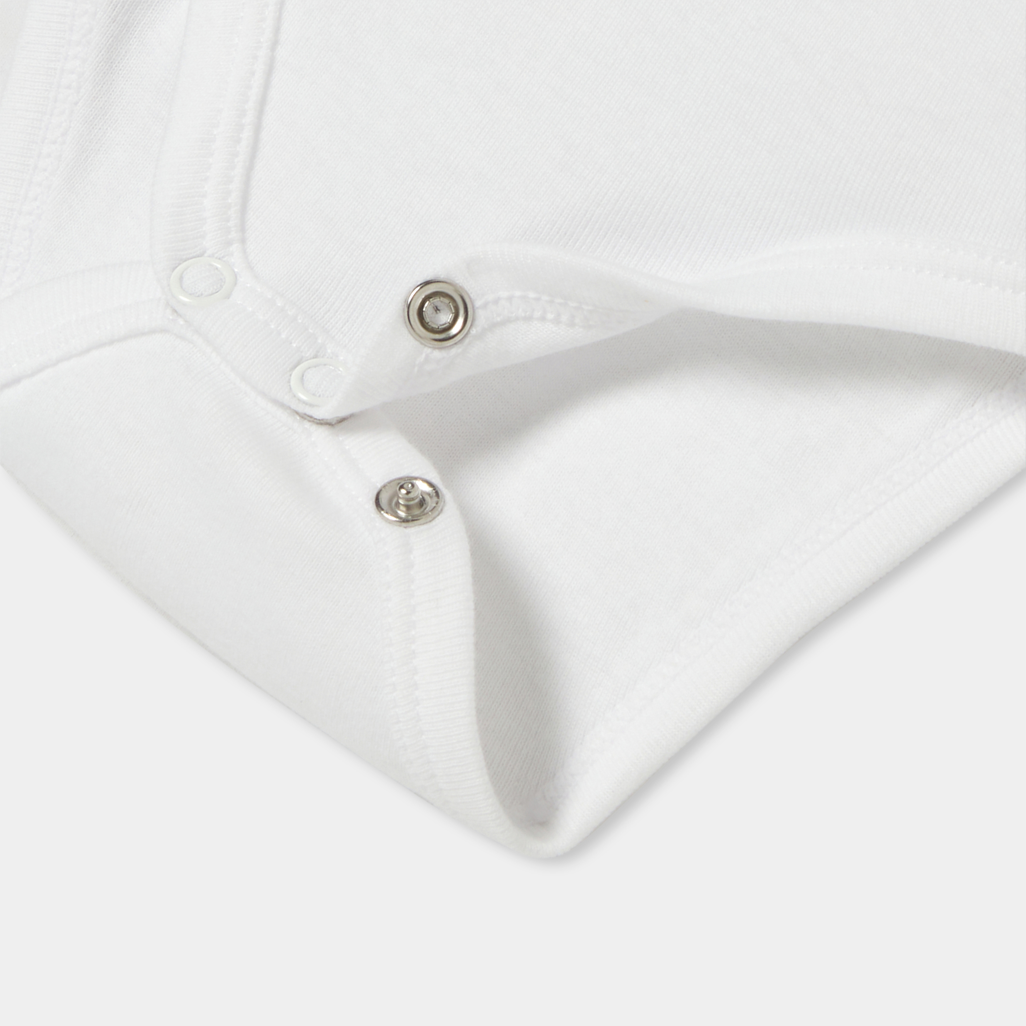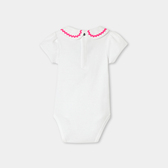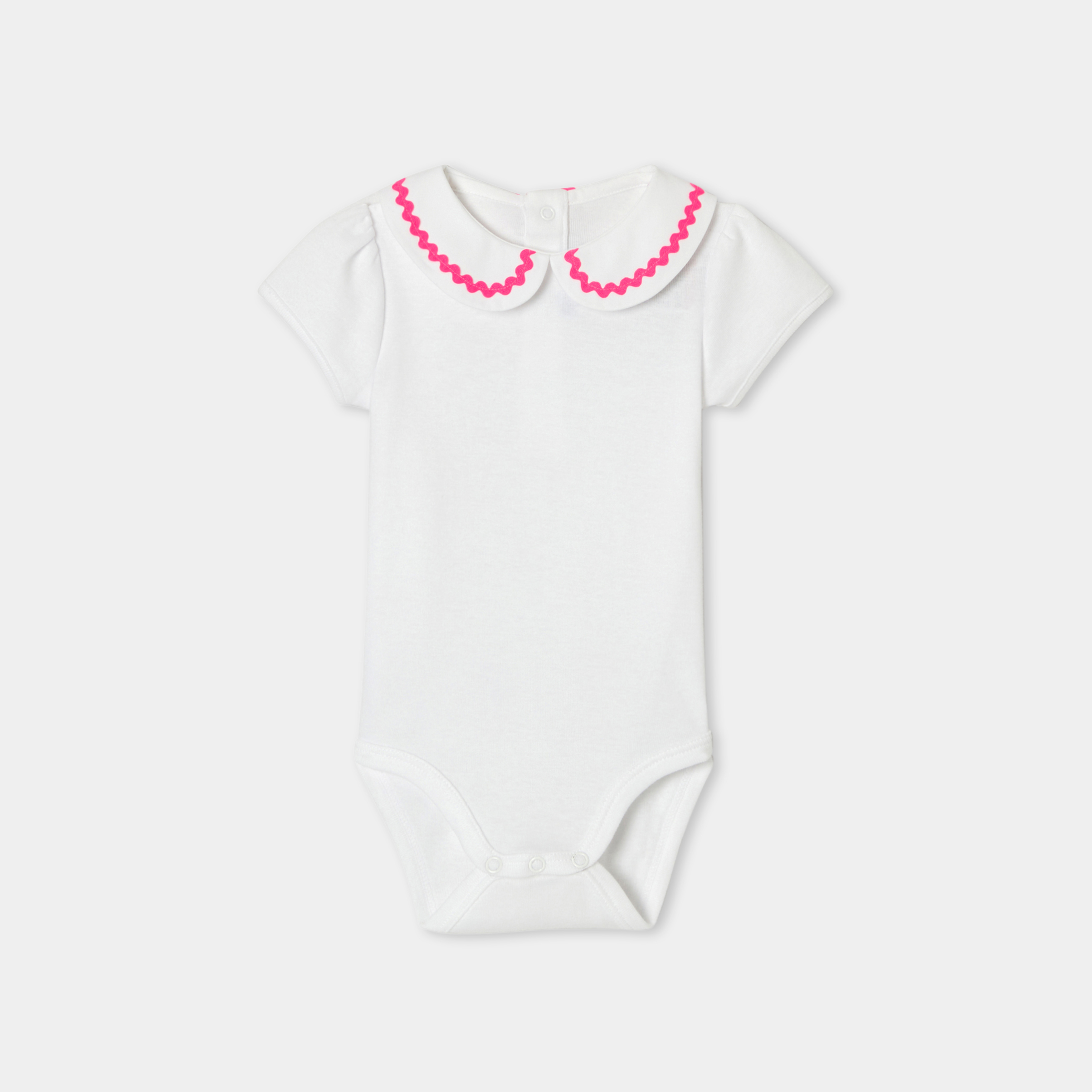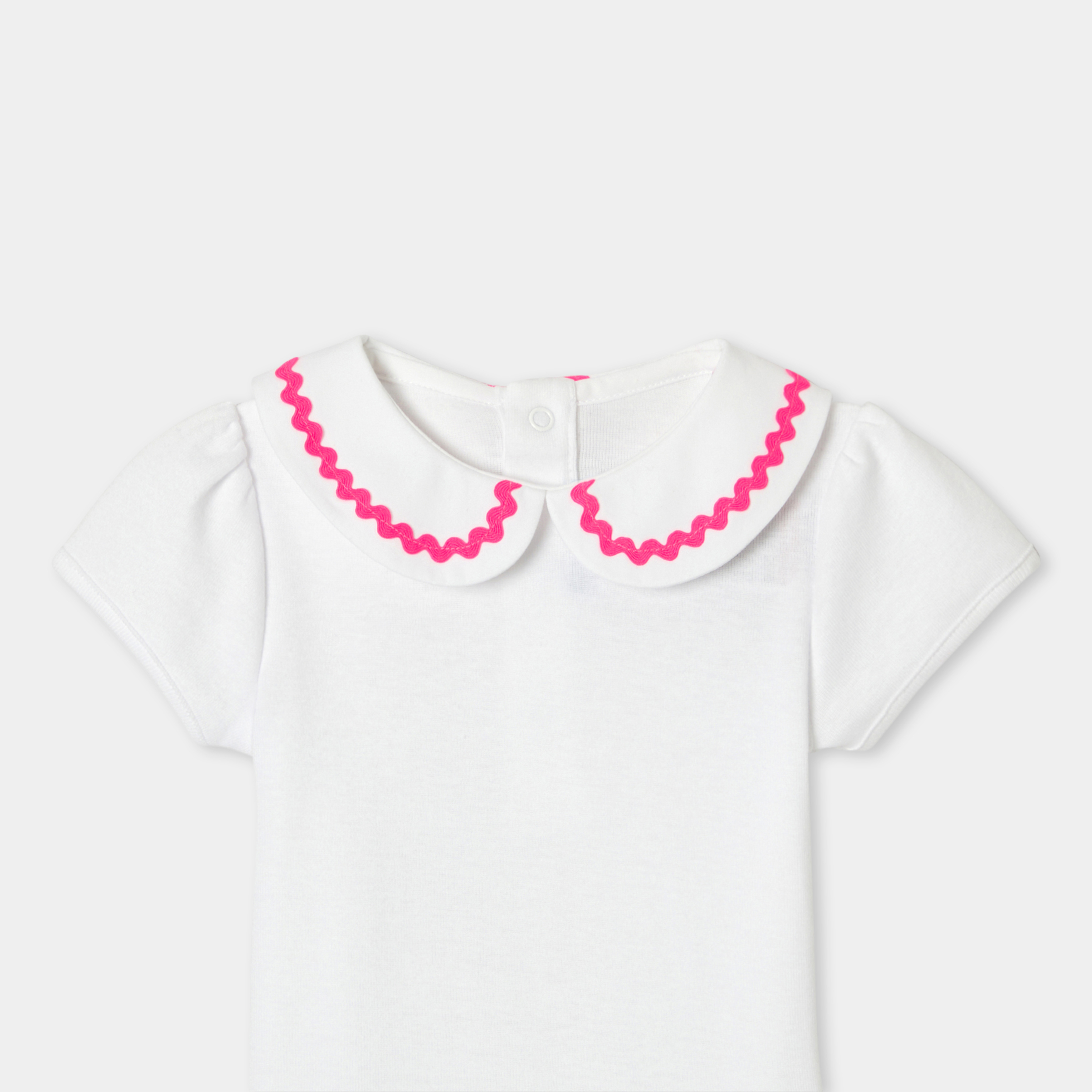 Quest'estate, il classico body da bambina è impreziosito da un colletto tondo e da un nastro a serpentina rosa fluorescente per esaltare i look di tutti i giorni. Indossato sotto un pullover a inizio stagione o con pantaloncini in tessuto Liberty e sandali durante le vacanze.