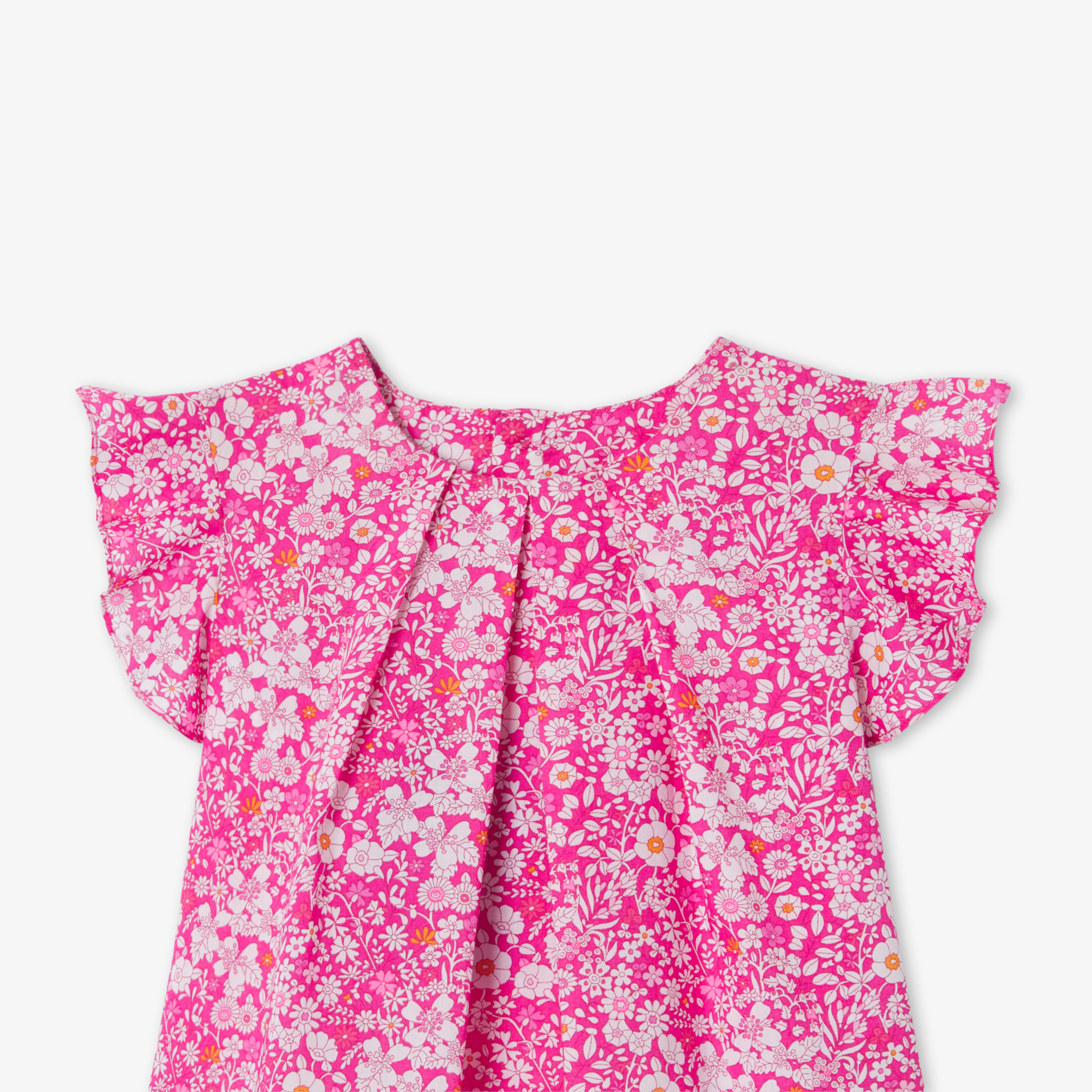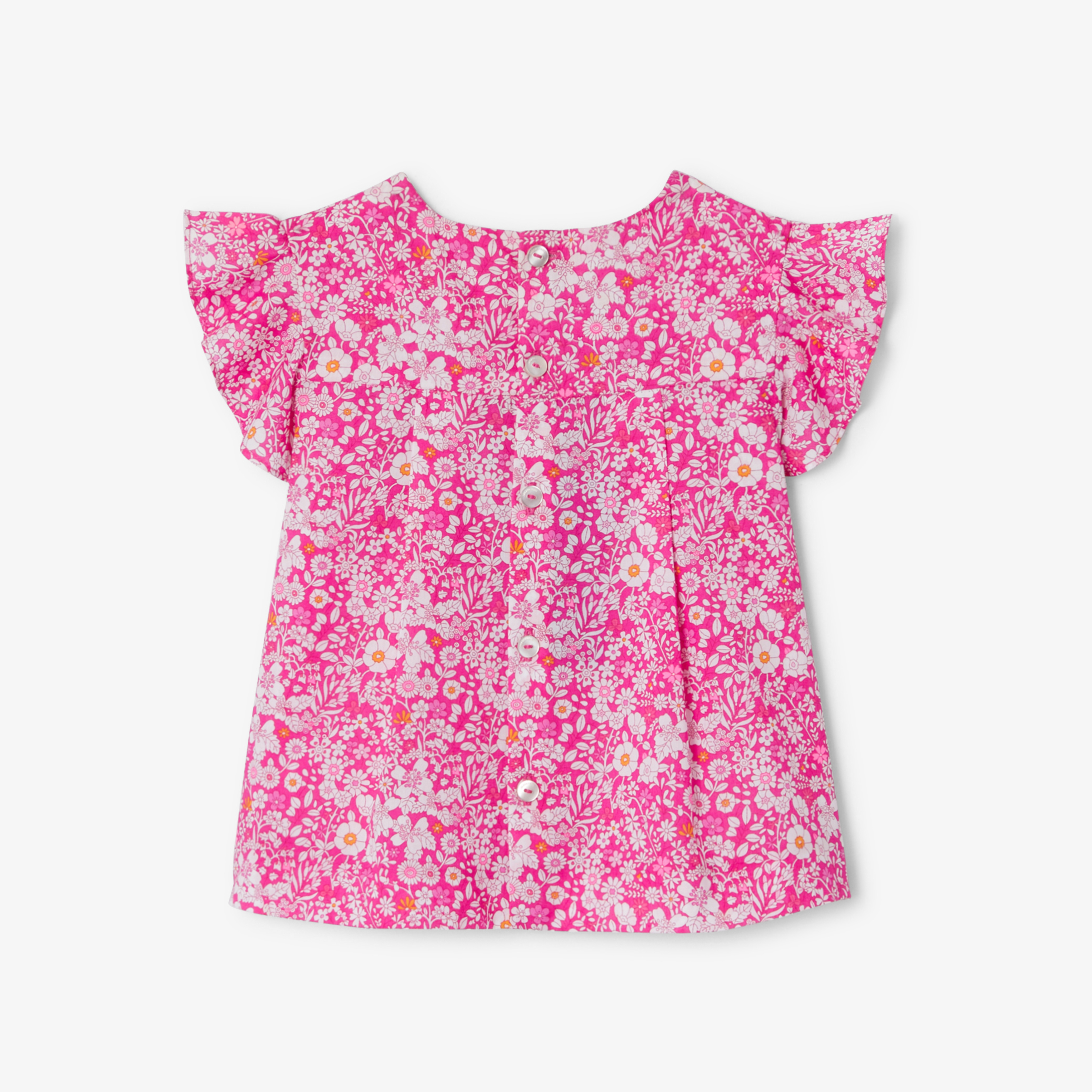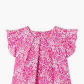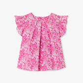 Questa incantevole blusa bimba annuncia una stagione floreale e colorata! Il tessuto Liberty, le maniche a volant e le pieghe sullo scollo donano struttura a questa blusa dal fascino primaverile da abbinare a pantaloncini e sandali nell'uso di tutti i giorni.