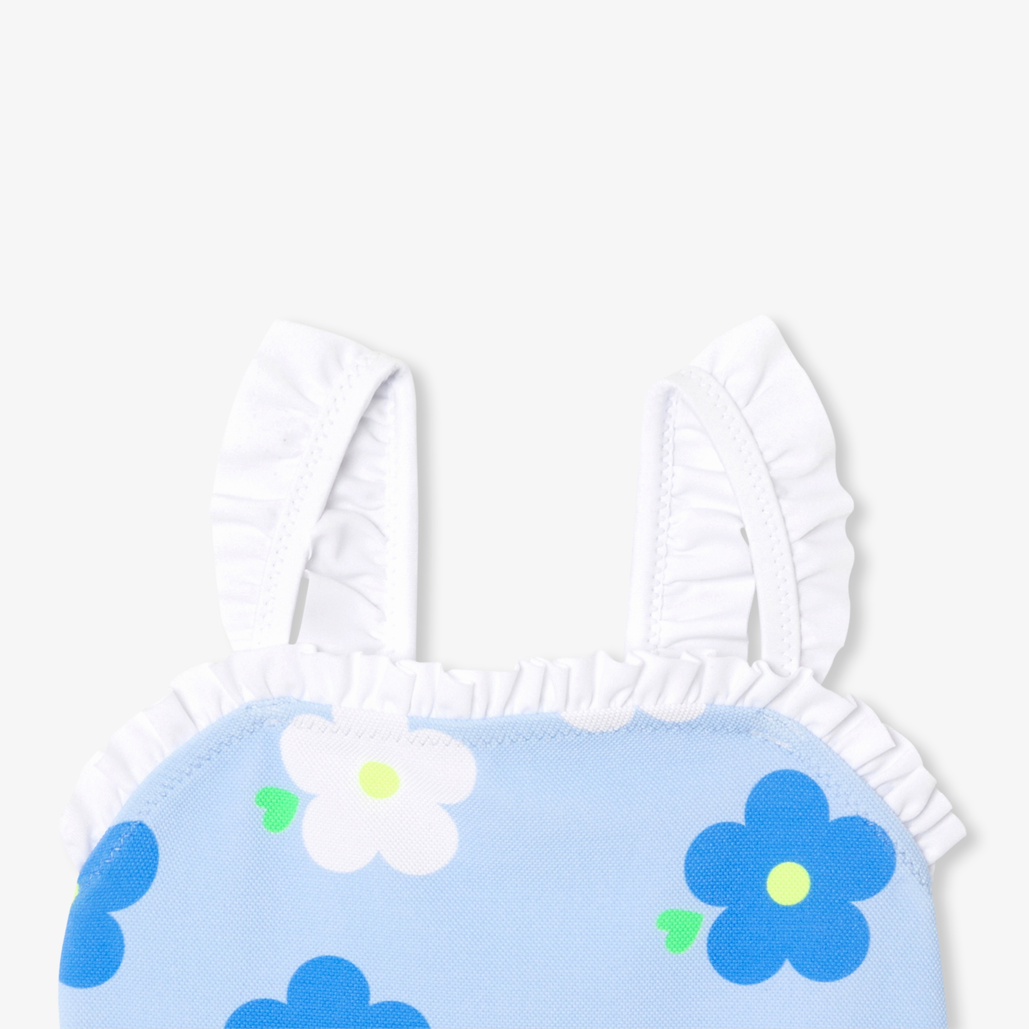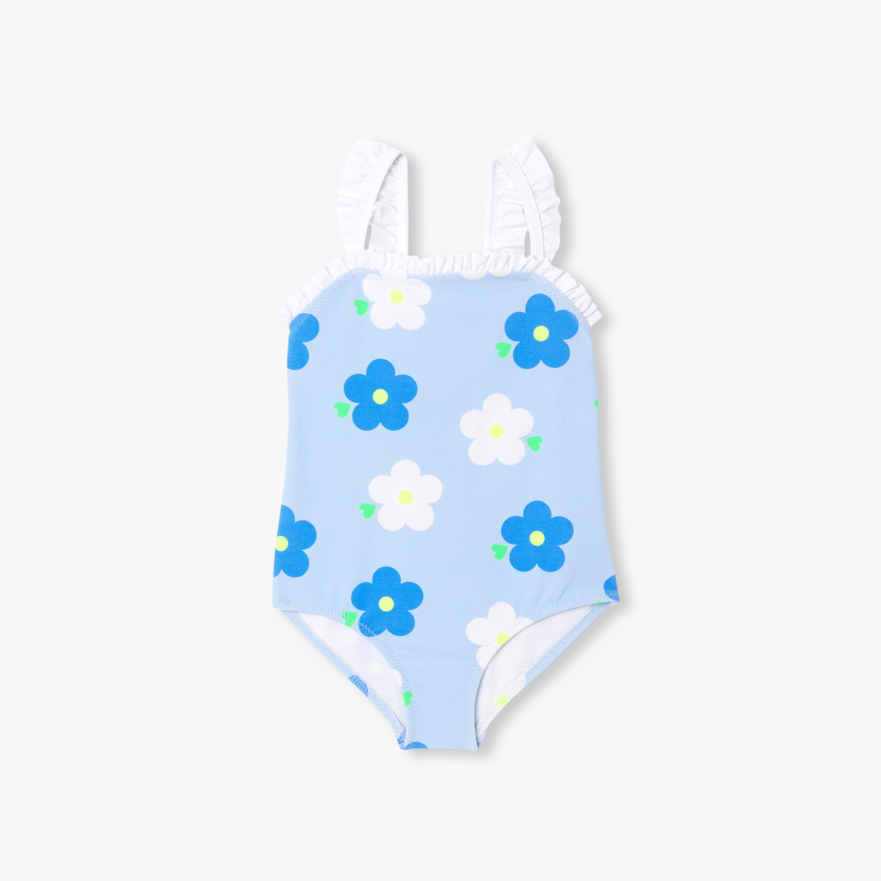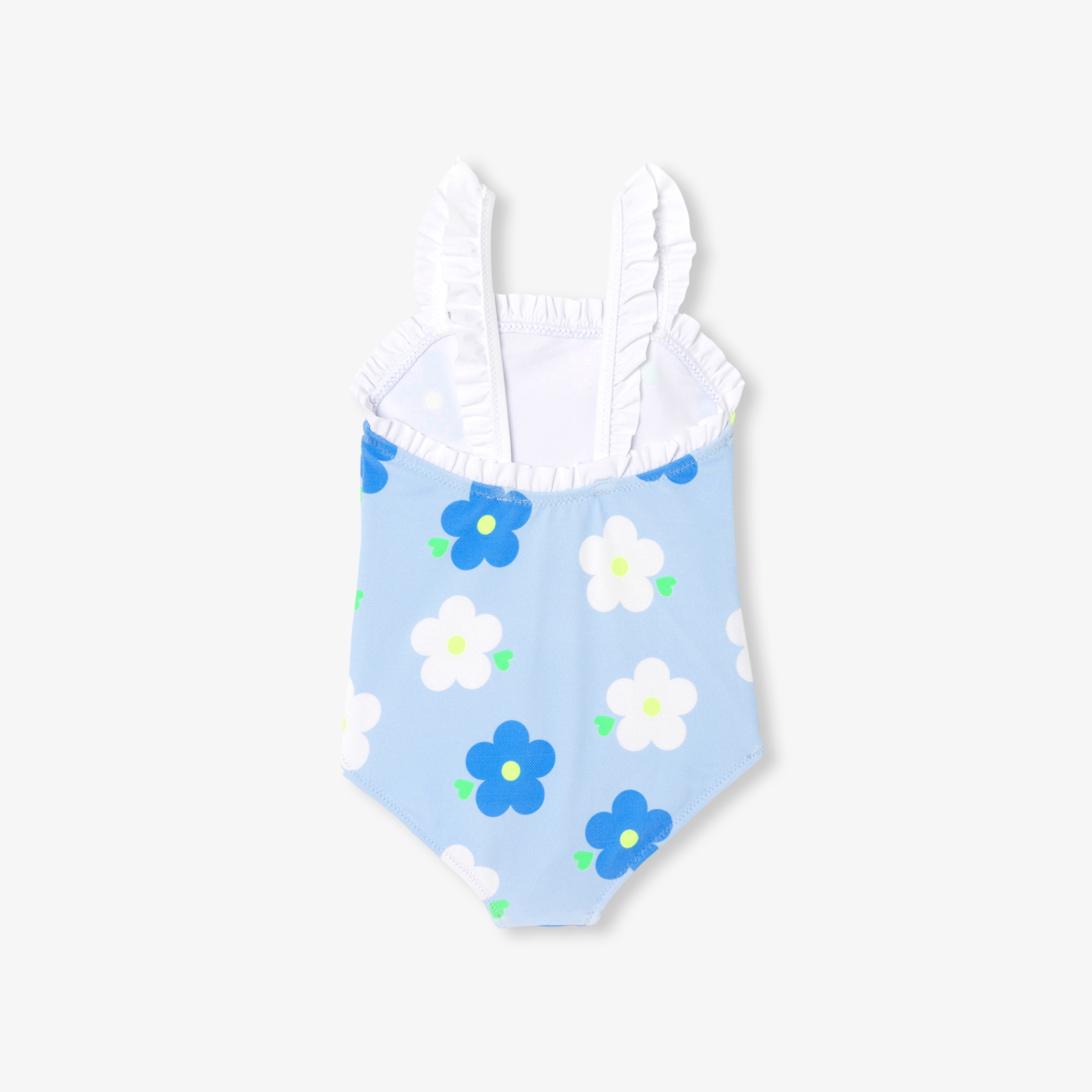 Realizzato in micro piqué di cotone, l'indispensabile costume da bagno bimba si immerge in un mondo sgargiante, chic e colorato per l'estate. Con la sua stampa a fiori bianchi e blu, lo scollo e le spalline con volant, questo costume da bagno è una vera chicca. Da indossare con un cappellino alla pescatora e protezione solare per tutti i bagni in arrivo.