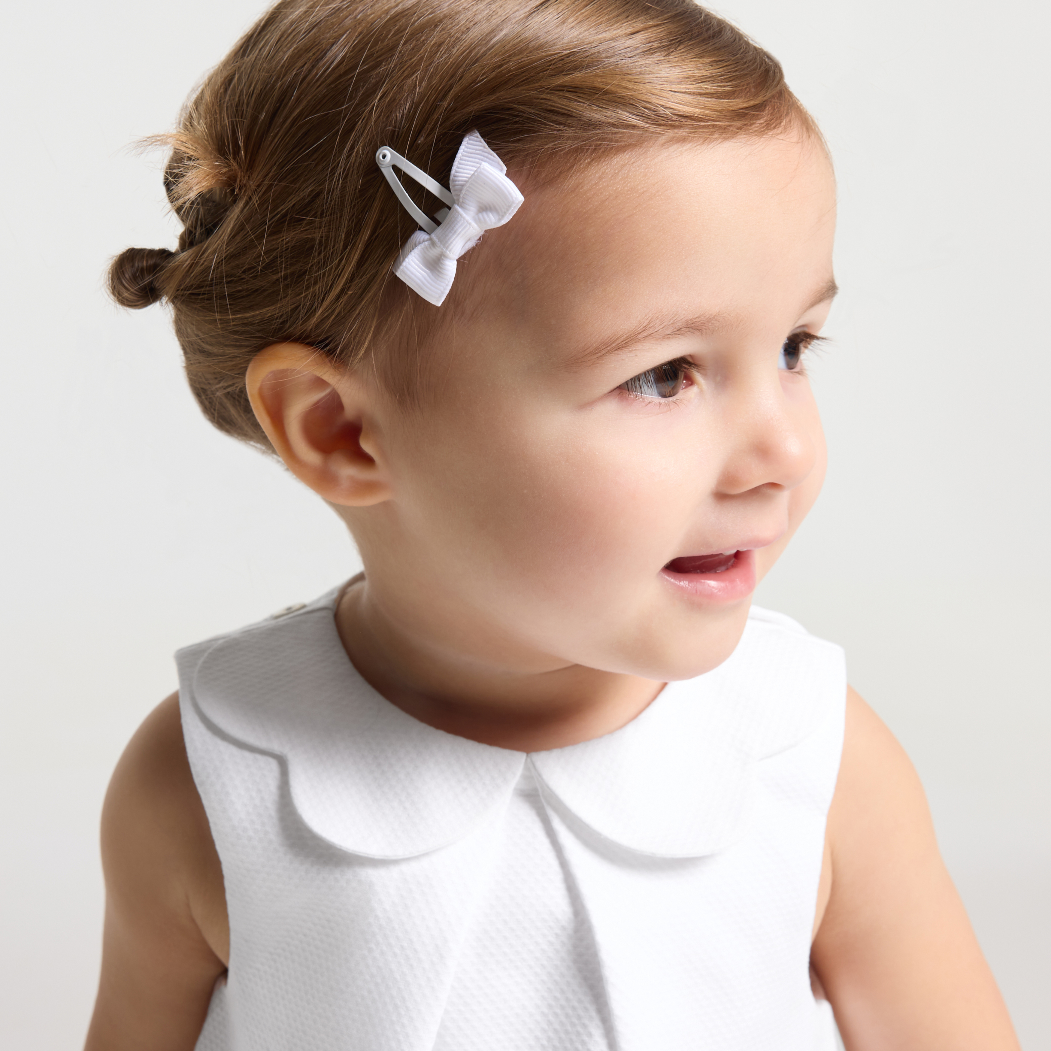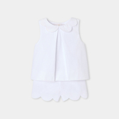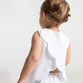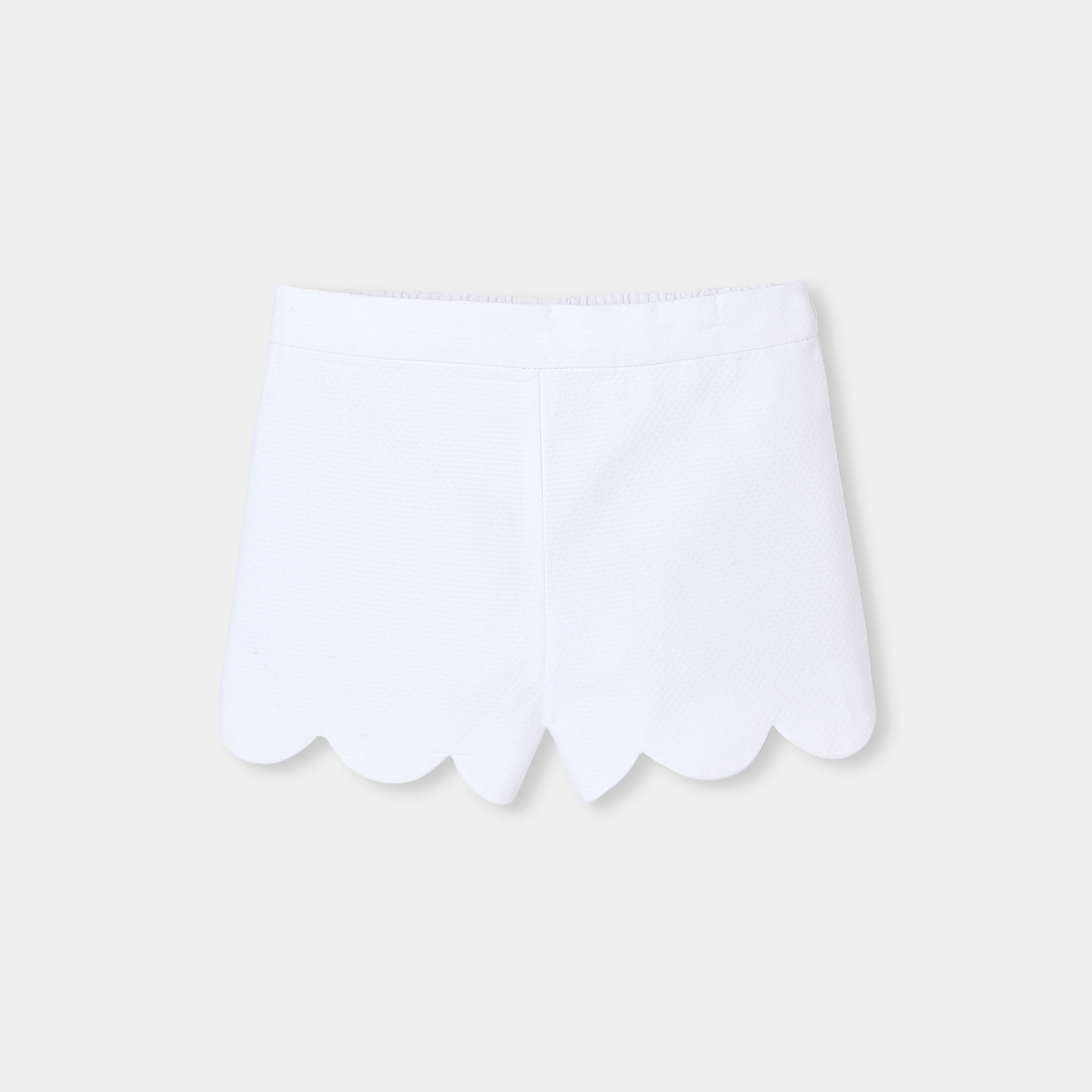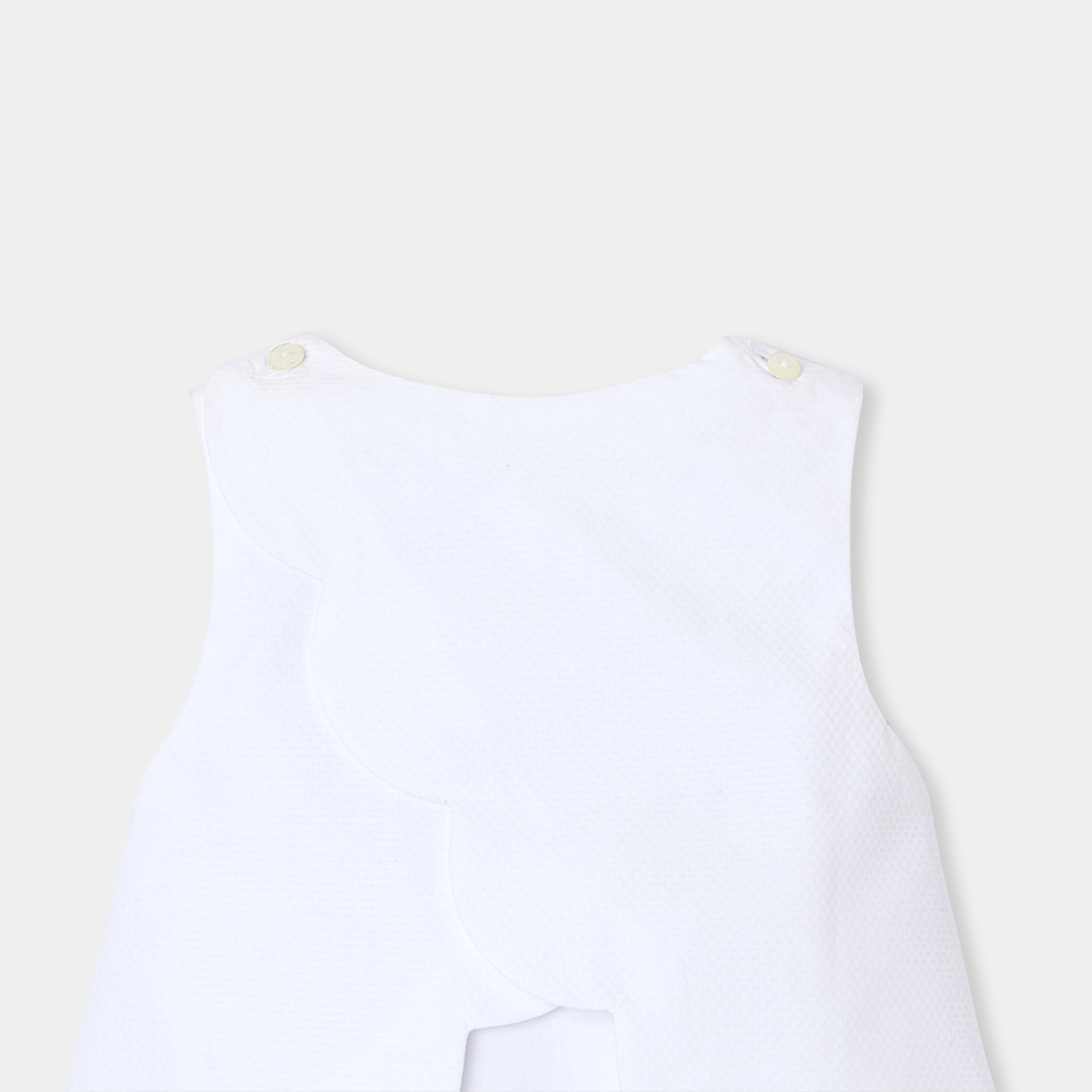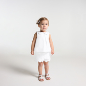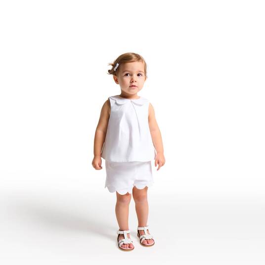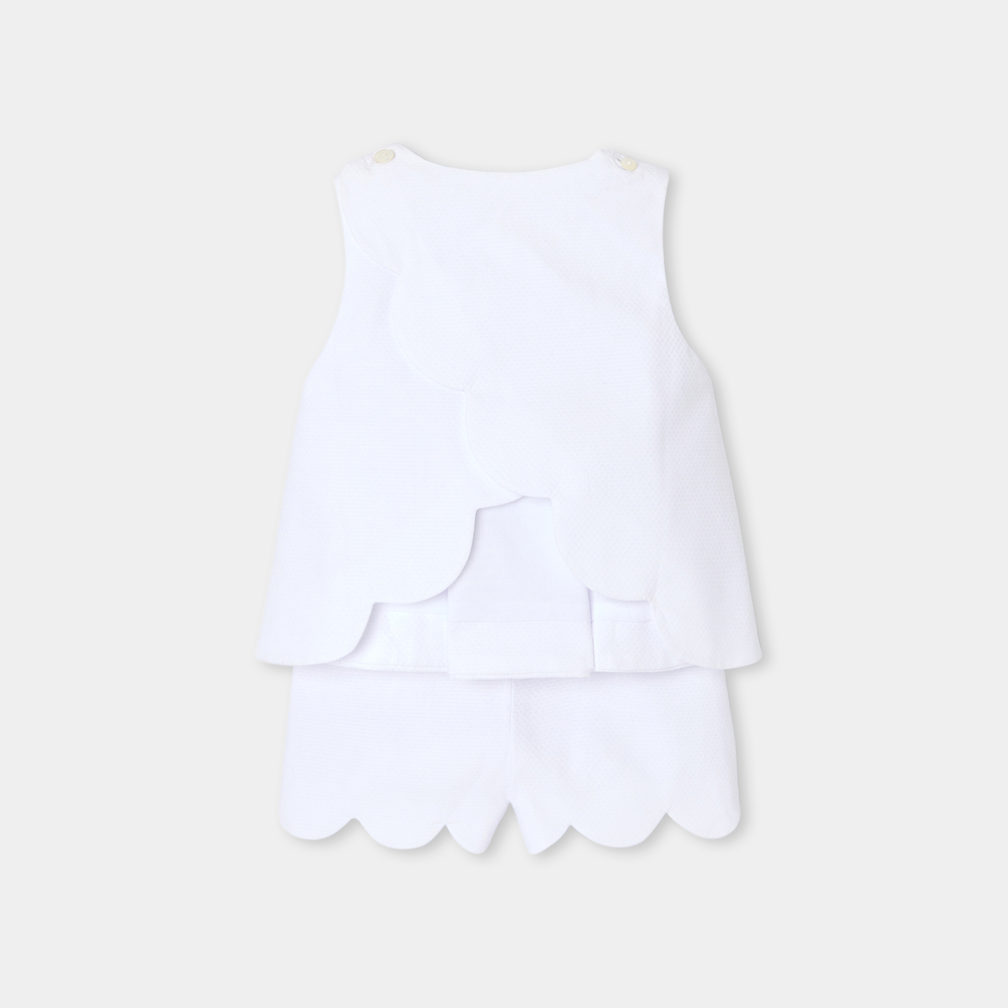 Con il suo innato senso dell'eleganza, Jacadi reinventa l'outfit da cerimonia creando questo raffinato completino bimba in piqué di cotone a nido d'ape. Composto da un top con colletto smerlato e da shorts con orlo smerlato, quest'elegante completino due pezzi potrà essere indossato in piena estate per rispondere a tutti gli inviti.