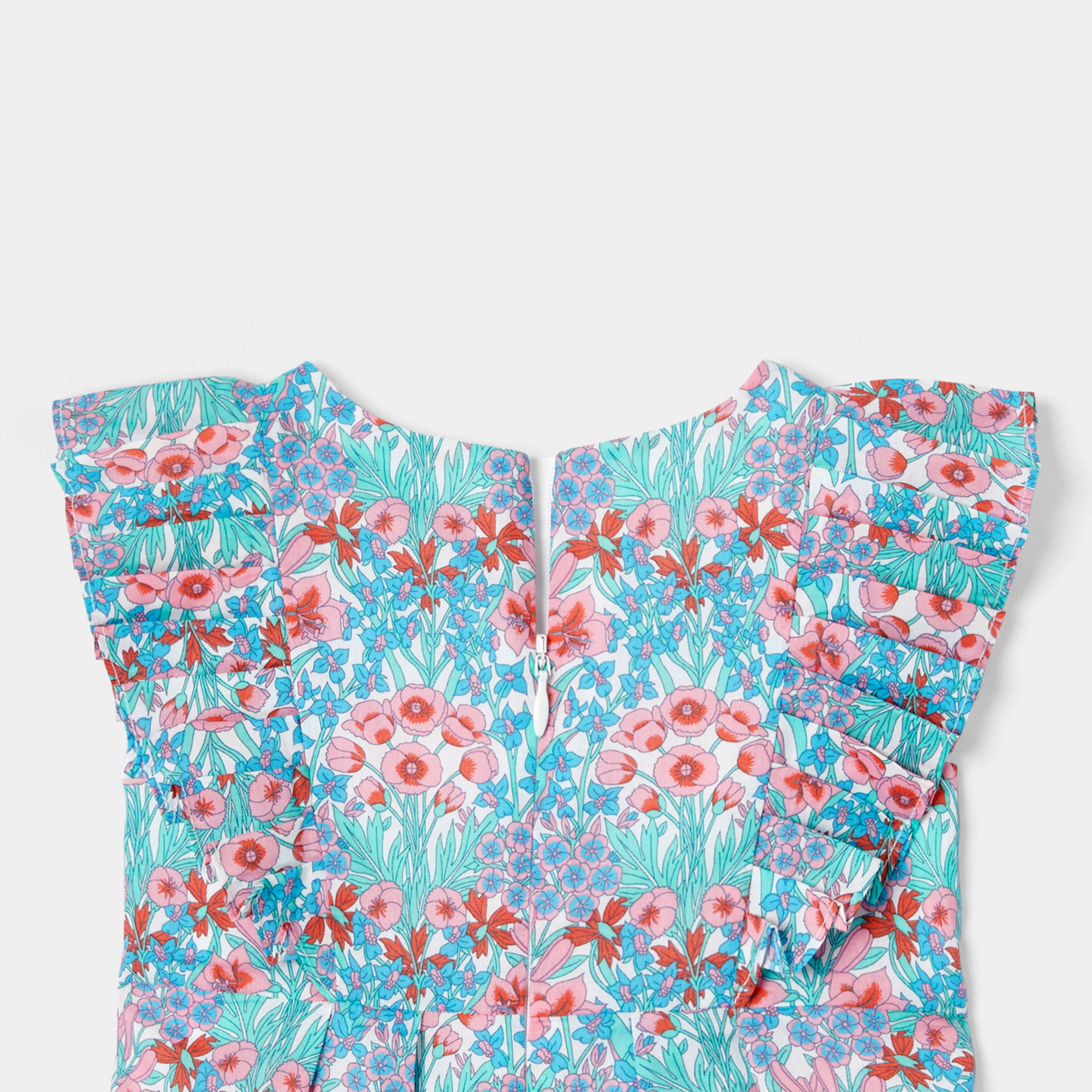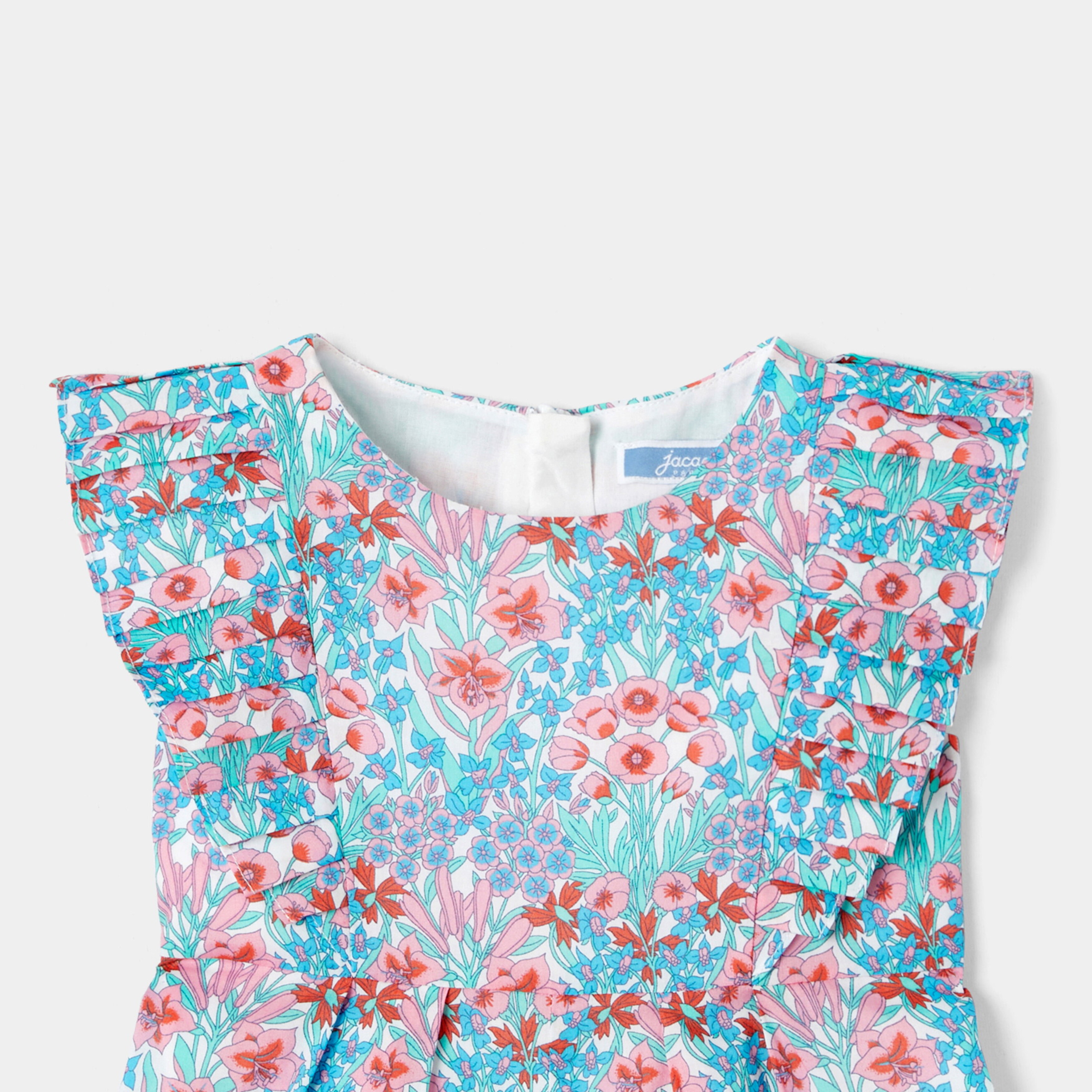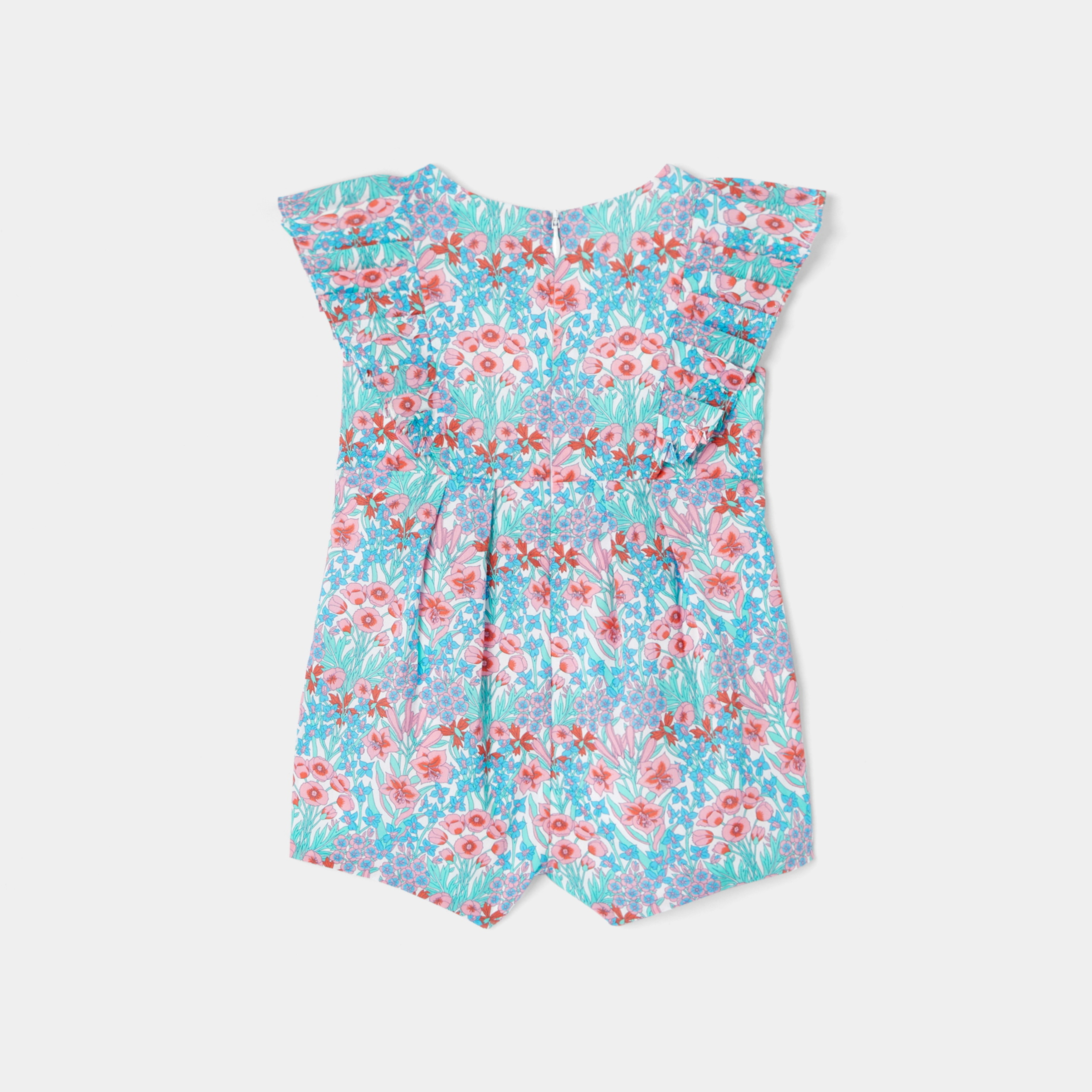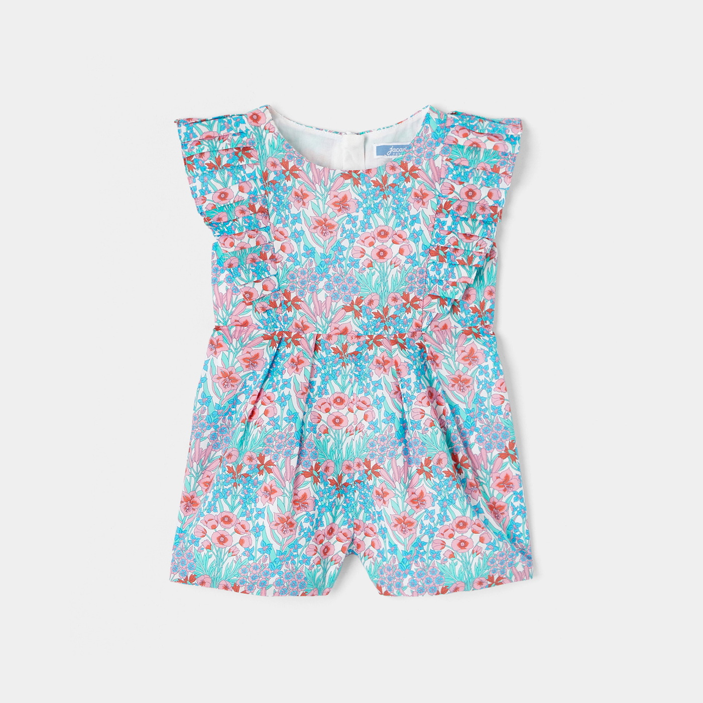 La tuta bimba di questa stagione è dinamizzata da un tessuto Liberty caratterizzato da colori allegri. Modernizzata da una pettorina con inserti ornati di volant per un look grafico, abbinala a graziosi sandali per l'estate.