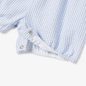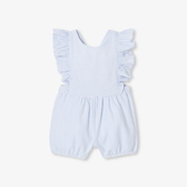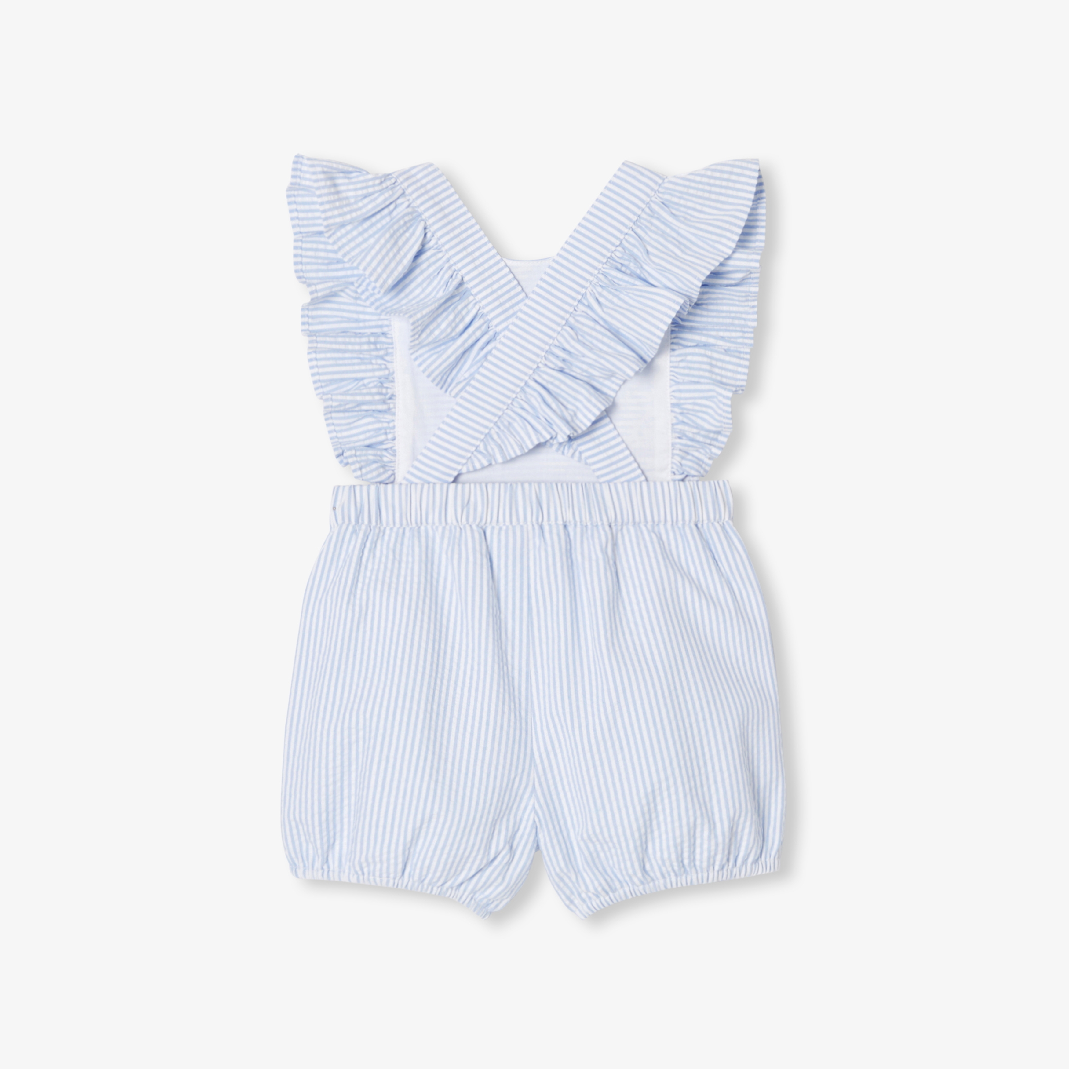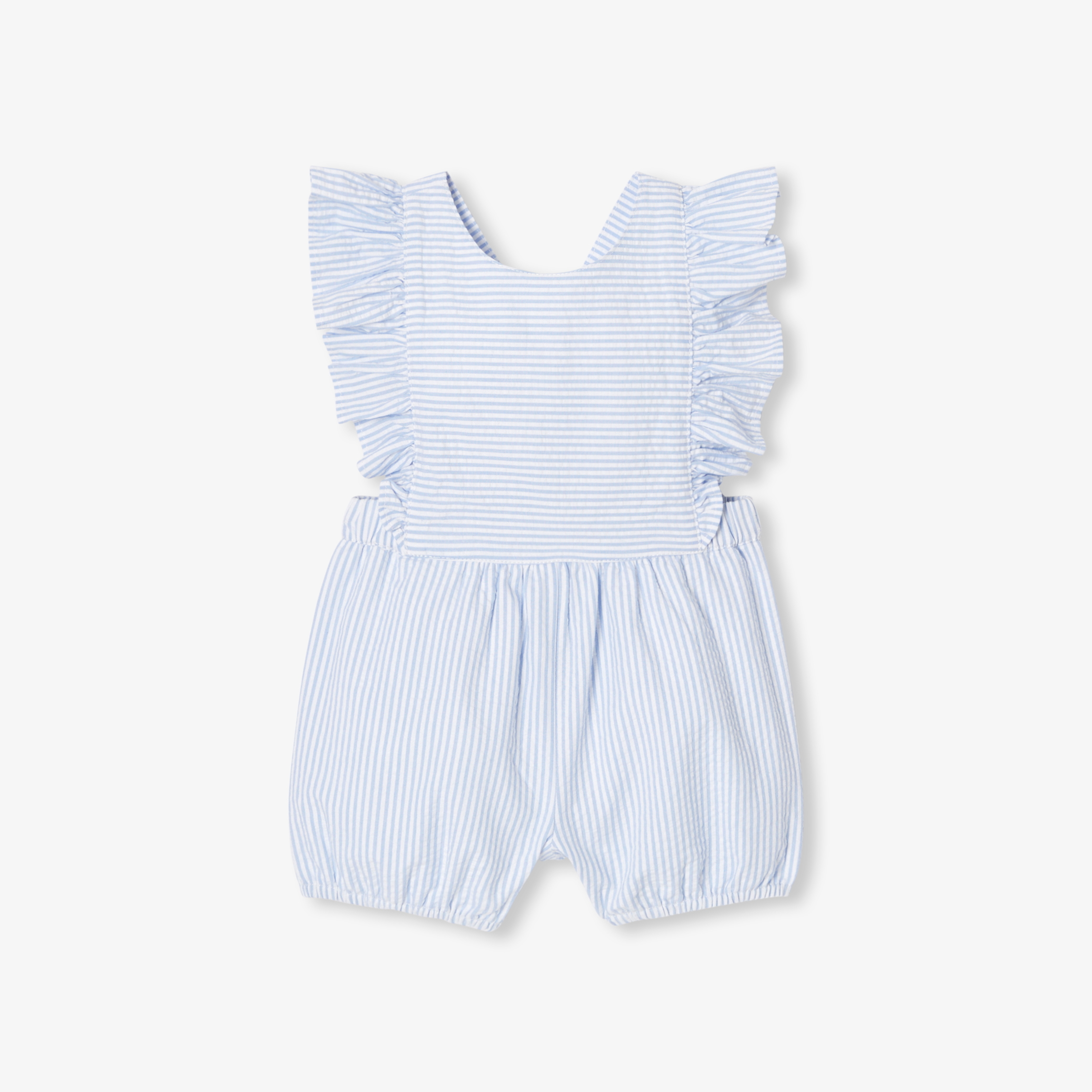 L'iconica tutina corta bimba si trasforma in un modello comodo e chic per l'estate. Disponibile in seersucker per la leggerezza e l'aspetto goffrato di facile manutenzione, con inserti a volant e bretelle incrociate sulla schiena, questa tutina corta è perfetta come regalo o da infilare nella valigia delle vacanze.