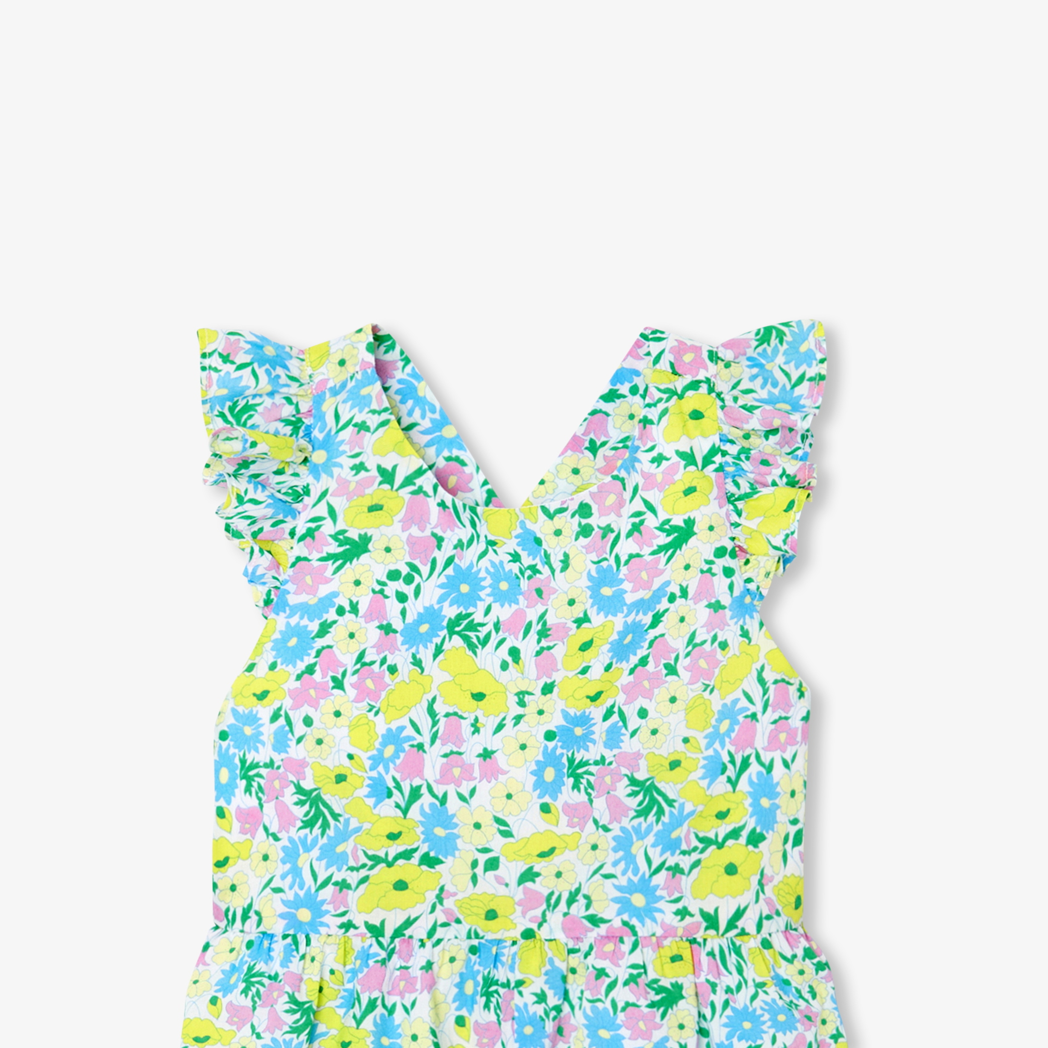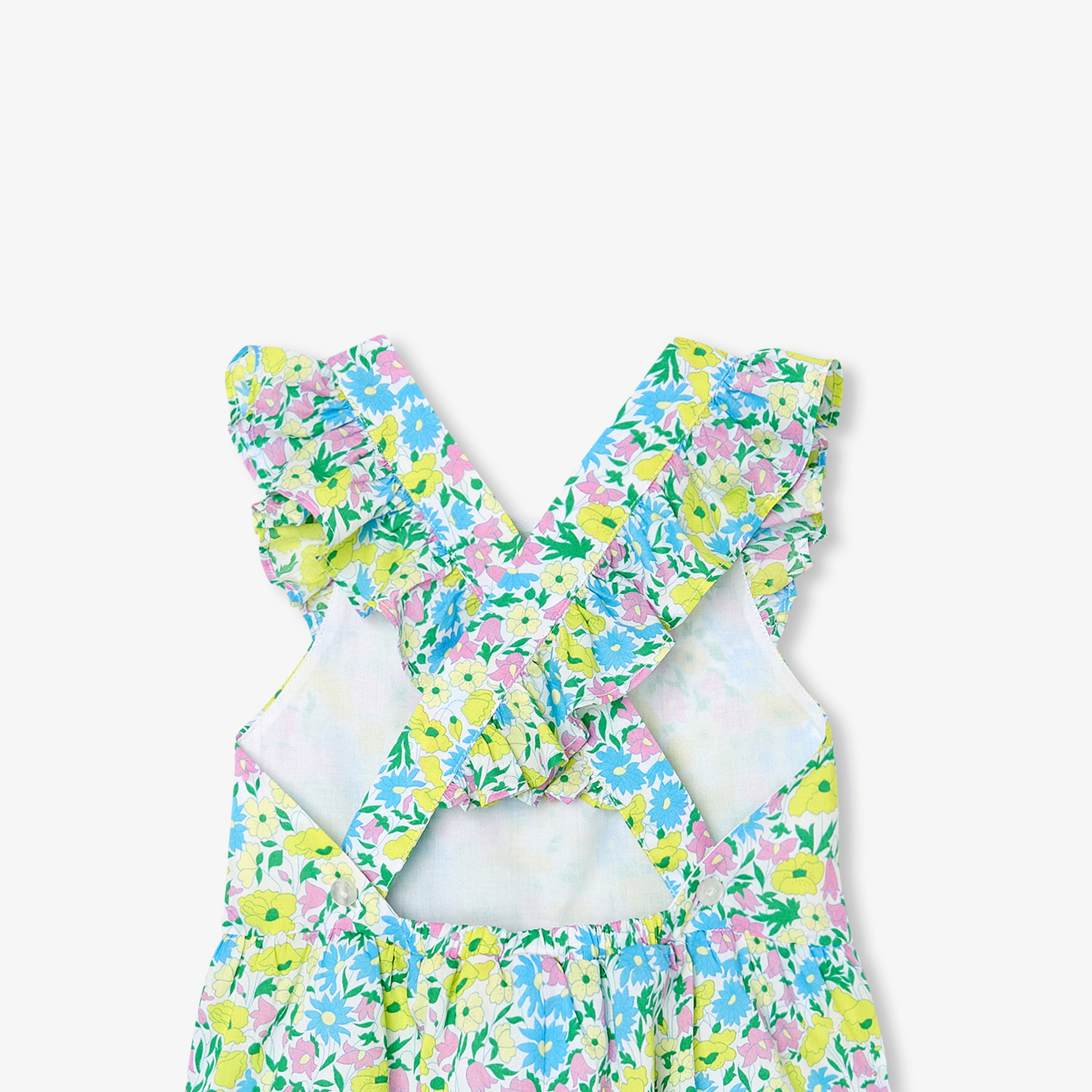 Realizzata in tessuto Liberty, con giromanica a volant e bretelle incrociate sulla schiena, questa tutina corta bimba è un vero e proprio richiamo per gli occhi. Comodità chic e facile da indossare, con inserto arricciato in vita e risvolti sul fondo gamba, un modello fresco e luminoso, perfetto da indossare con un paio di sandalini a una festa di compleanno.