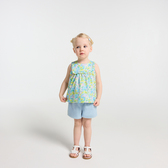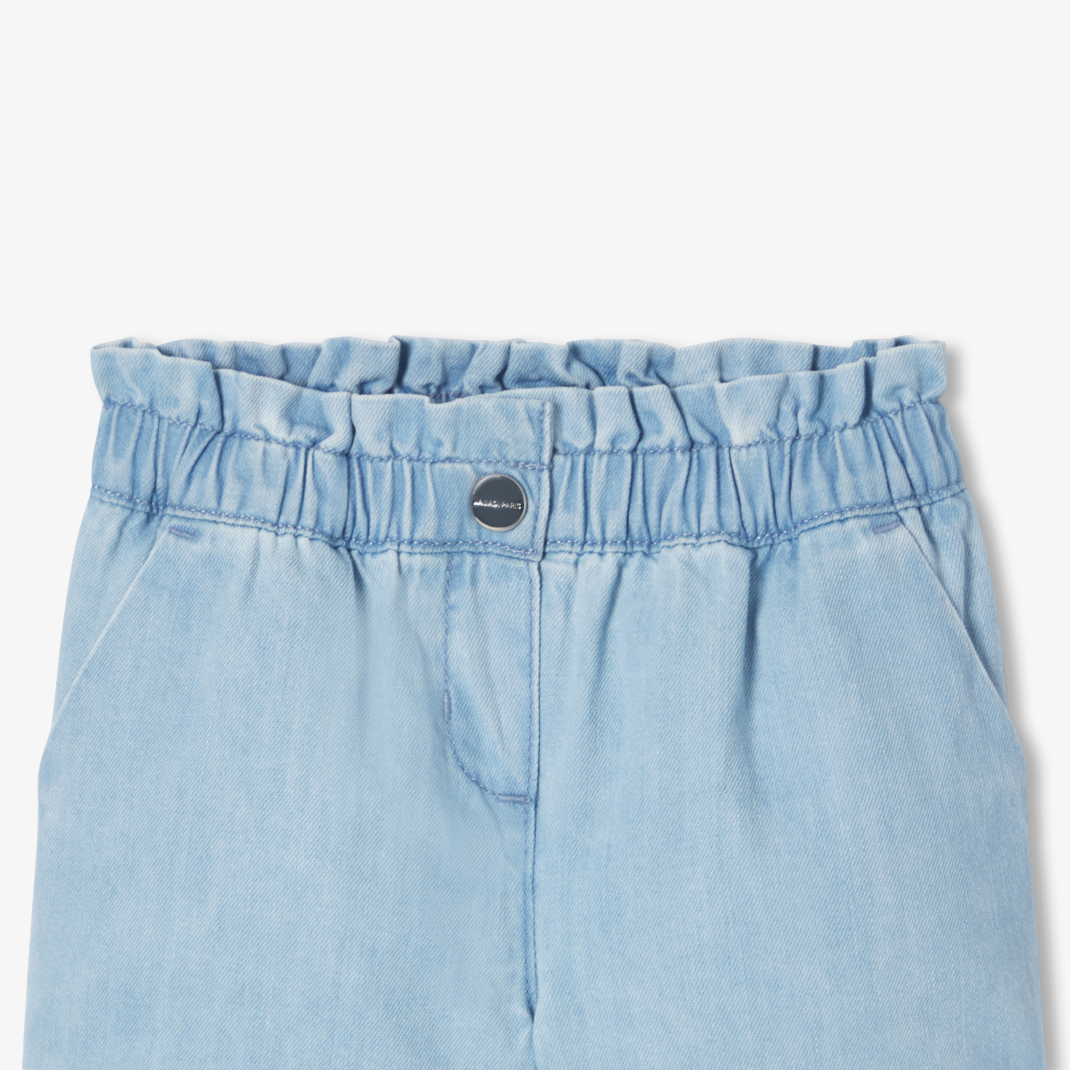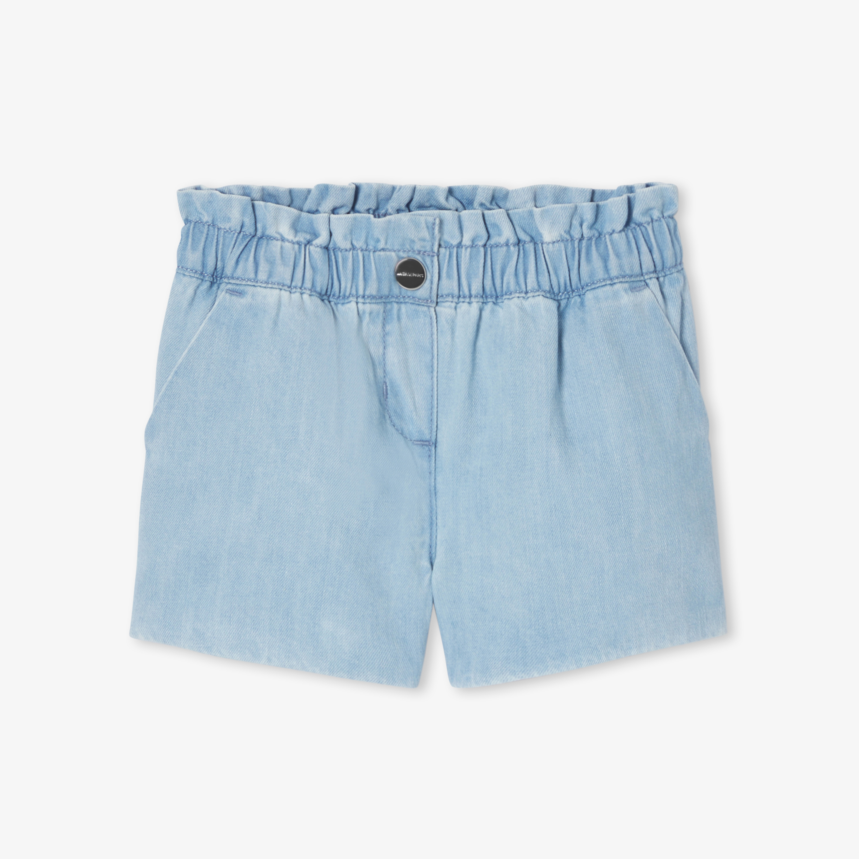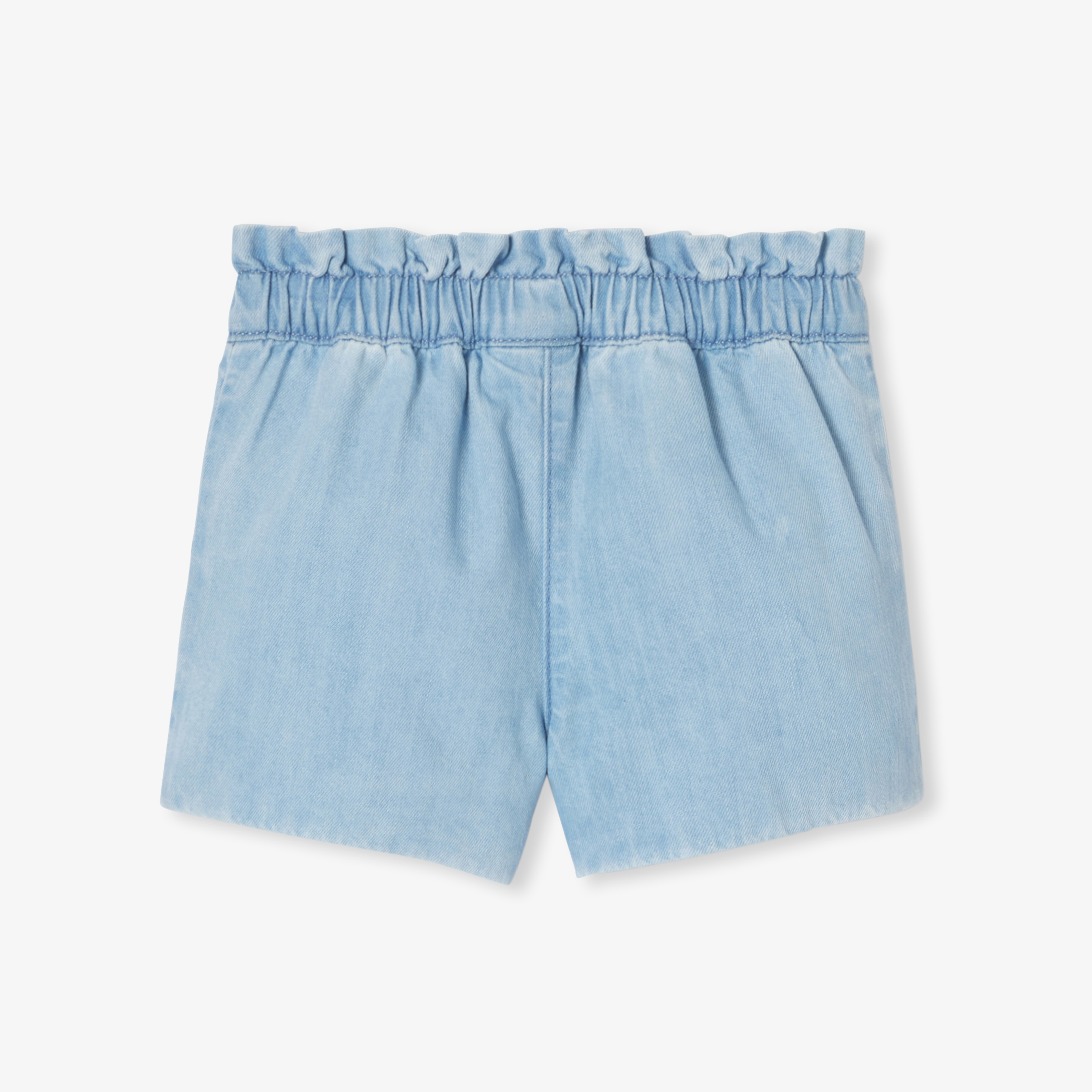 Realizzati in denim leggero con fodera in voile di cotone, questi pantaloncini bimba sono stati rivisitati con un elastico in vita modello paper bag e un leggero trattamento délavé. Da indossare con una t-shirt e un paio di graziosi sandalini per un perfetto look estivo.