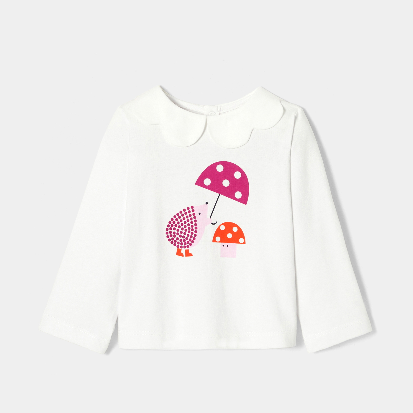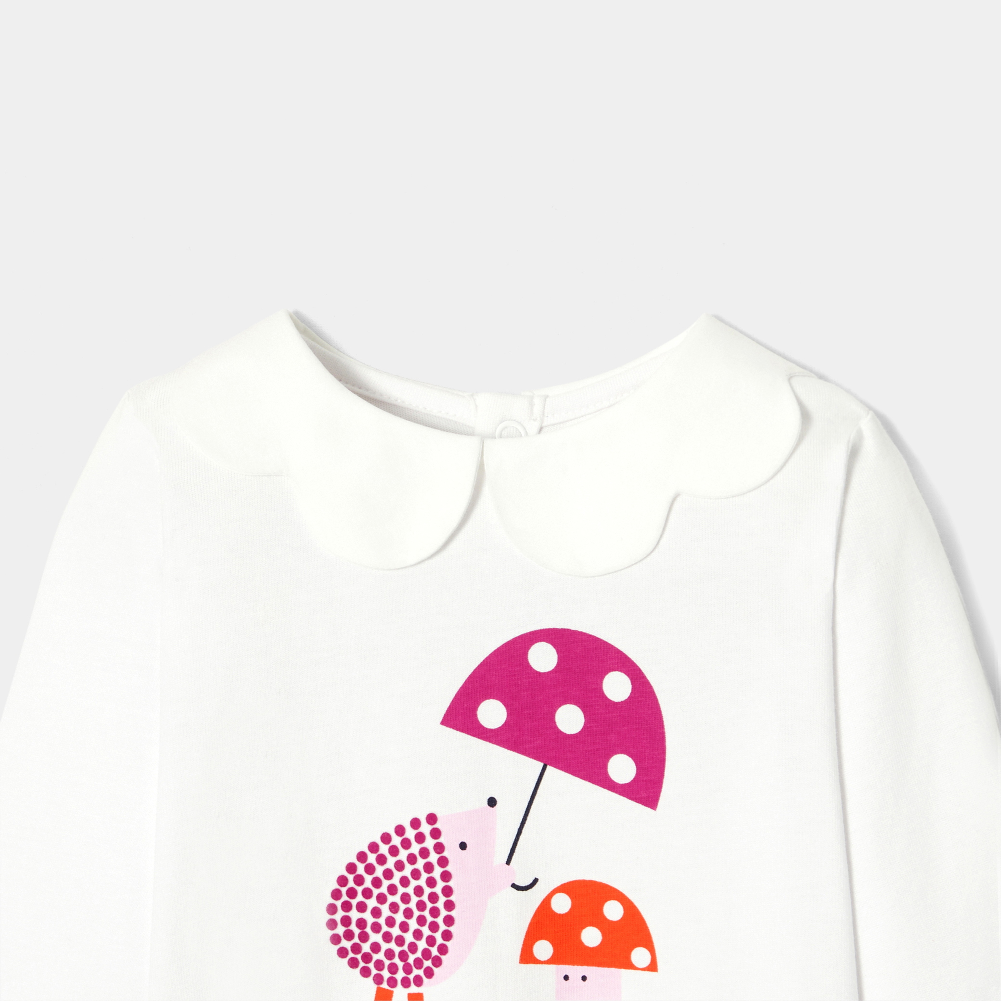 Un autunno country-chic con questa incantevole t-shirt bimba. In cotone biologico, è arricchita da un colletto smerlato e da un allegro motivo sulla pettorina con un porcospino e un fungo. Comoda, pratica e facile da coordinare, si abbinerà a meraviglia a shorts o a pantaloni di velluto e a graziosi scarponcini per l'outfit quotidiano.