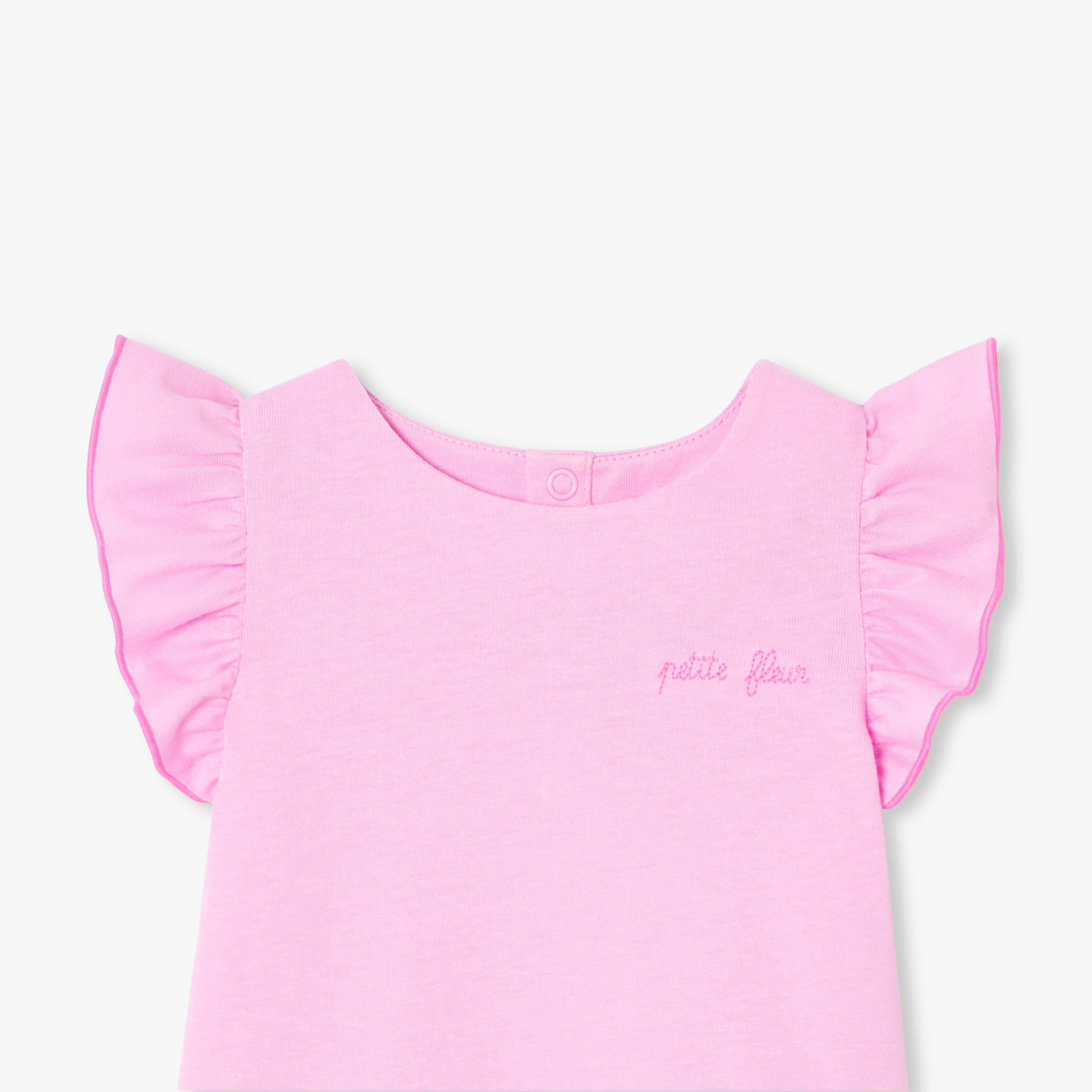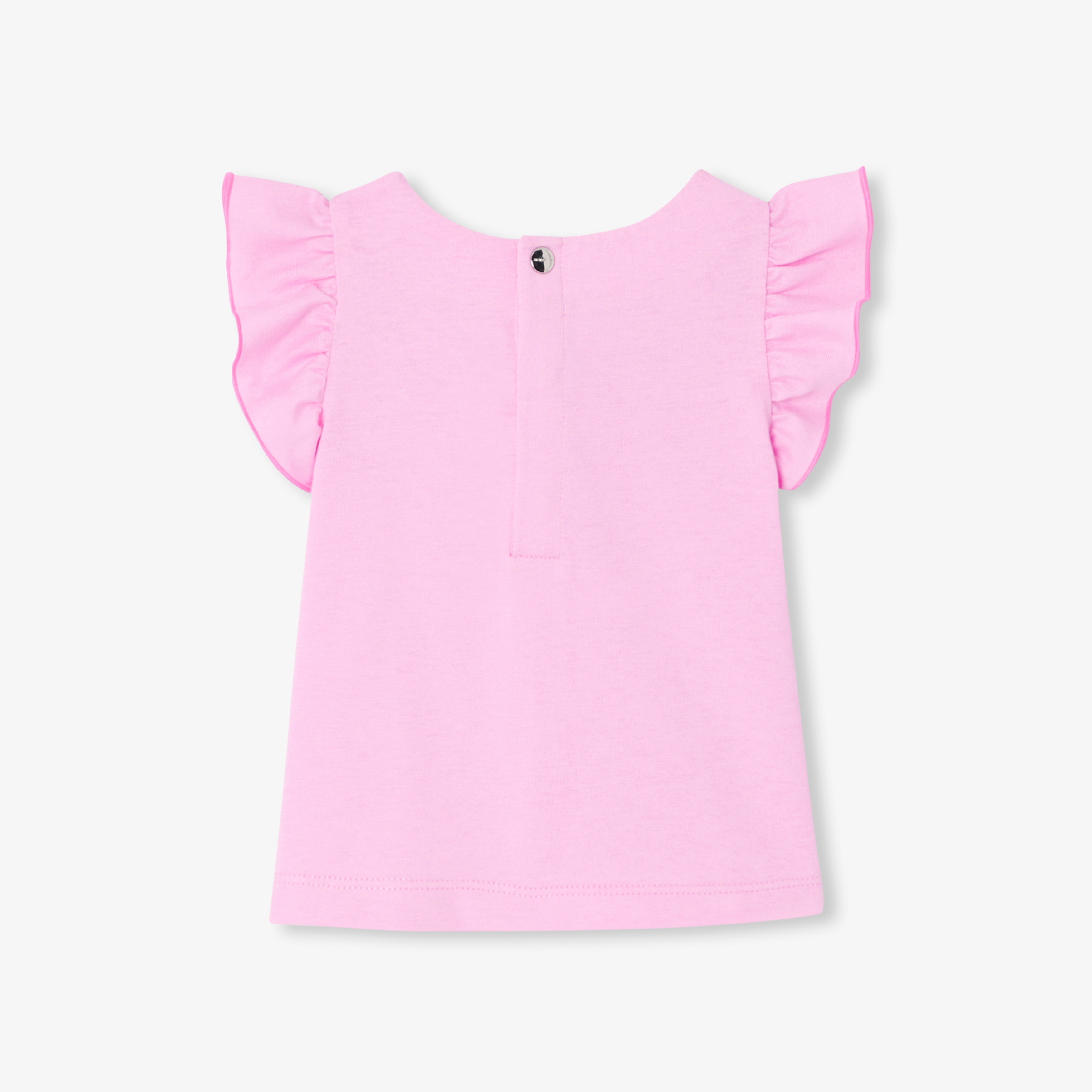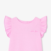 La t-shirt bimba si fa ancora più elegante con le sue maniche a volant valorizzate dalla cucitura a punto bourdon. Ricamata con una tenera scritta, abbinala a pantaloncini in tessuto Liberty per un romantico look folk.