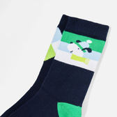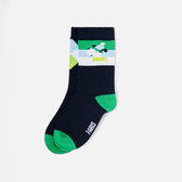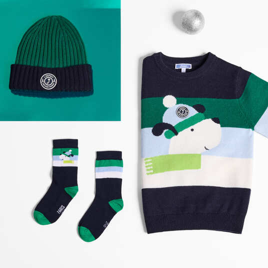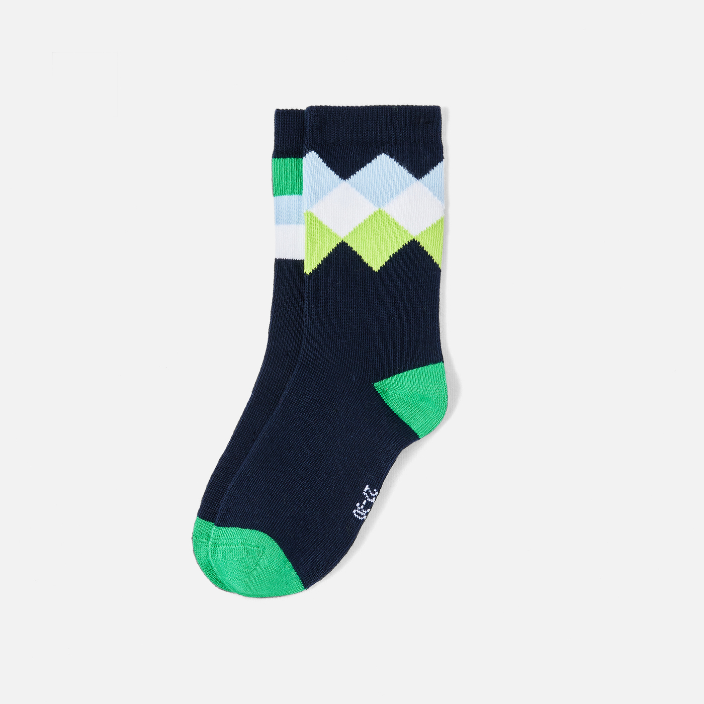 Rombi a intarsio e cane giocoso dinamizzano questi incantevoli calzini bambino. Coordinati con la collezione di abbigliamento, completeranno l'outfit per la scuola con originalità.
