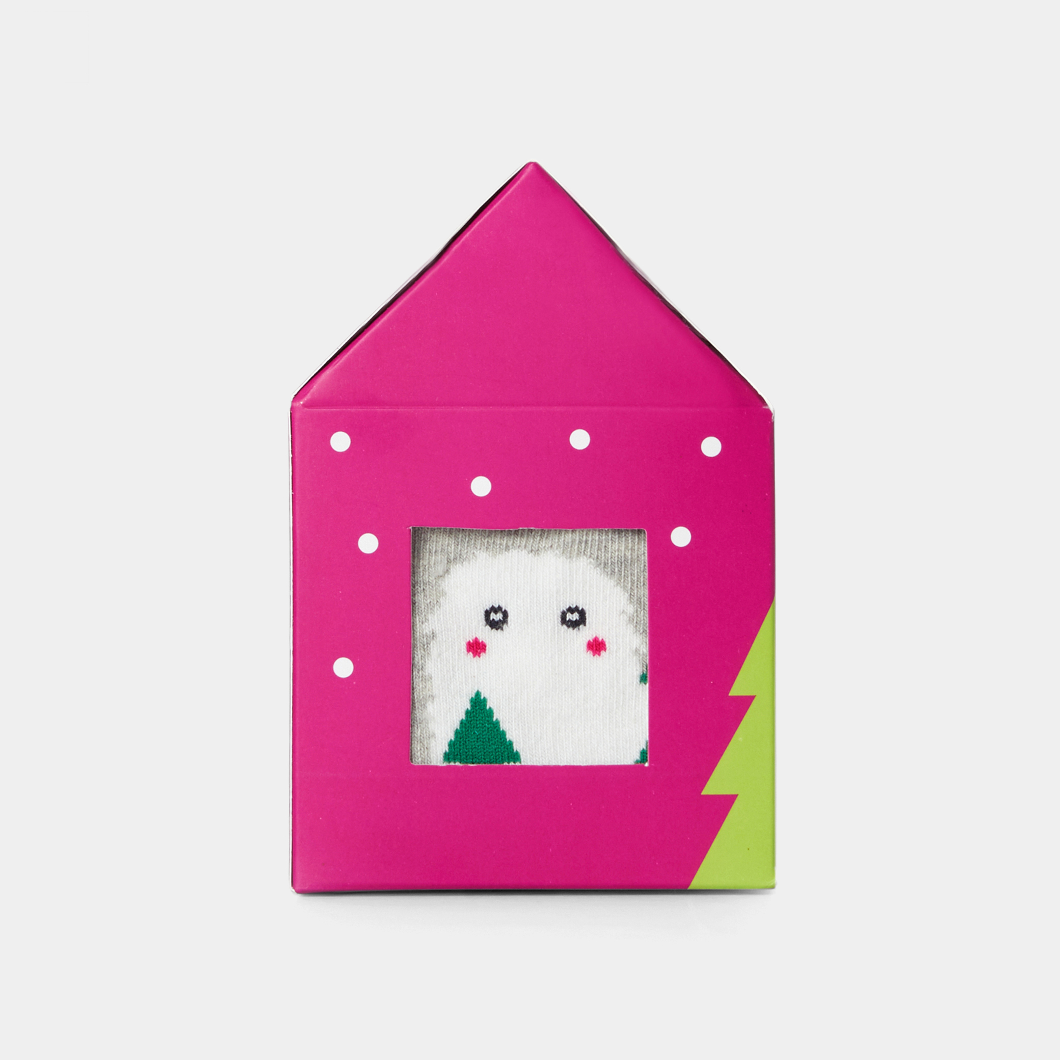 Uno Yeti in una foresta e una pallina di Natale decorano i calzini delle bambine per la fine dell'anno. Appositamente creati per le feste di fine anno e coordinati con il pullover della stessa collezione, sono presentati in una scatola a forma di casa di Natale e saranno una bella idea regalo.
