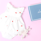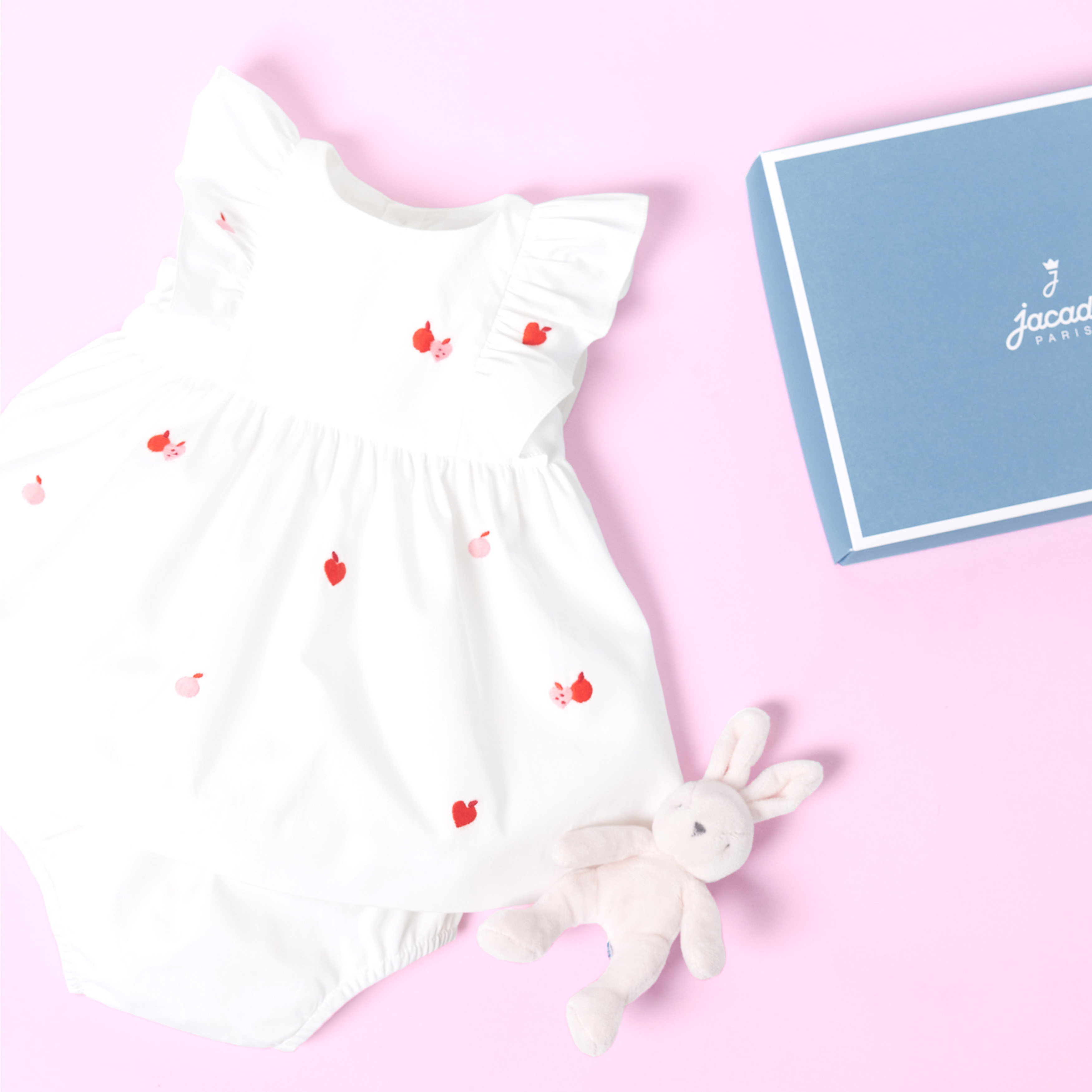 Ideale per una cerimonia e perfetto per l'estate, l'abito bimba di questa stagione si distingue per i suoi splendidi ricami a contrasto. Arricchito da giromanica con volant e foderato in popeline, è dotato di un'apertura sul retro con bottoni in madreperla naturale e completato da adorabili mutandine per rifinire il look.