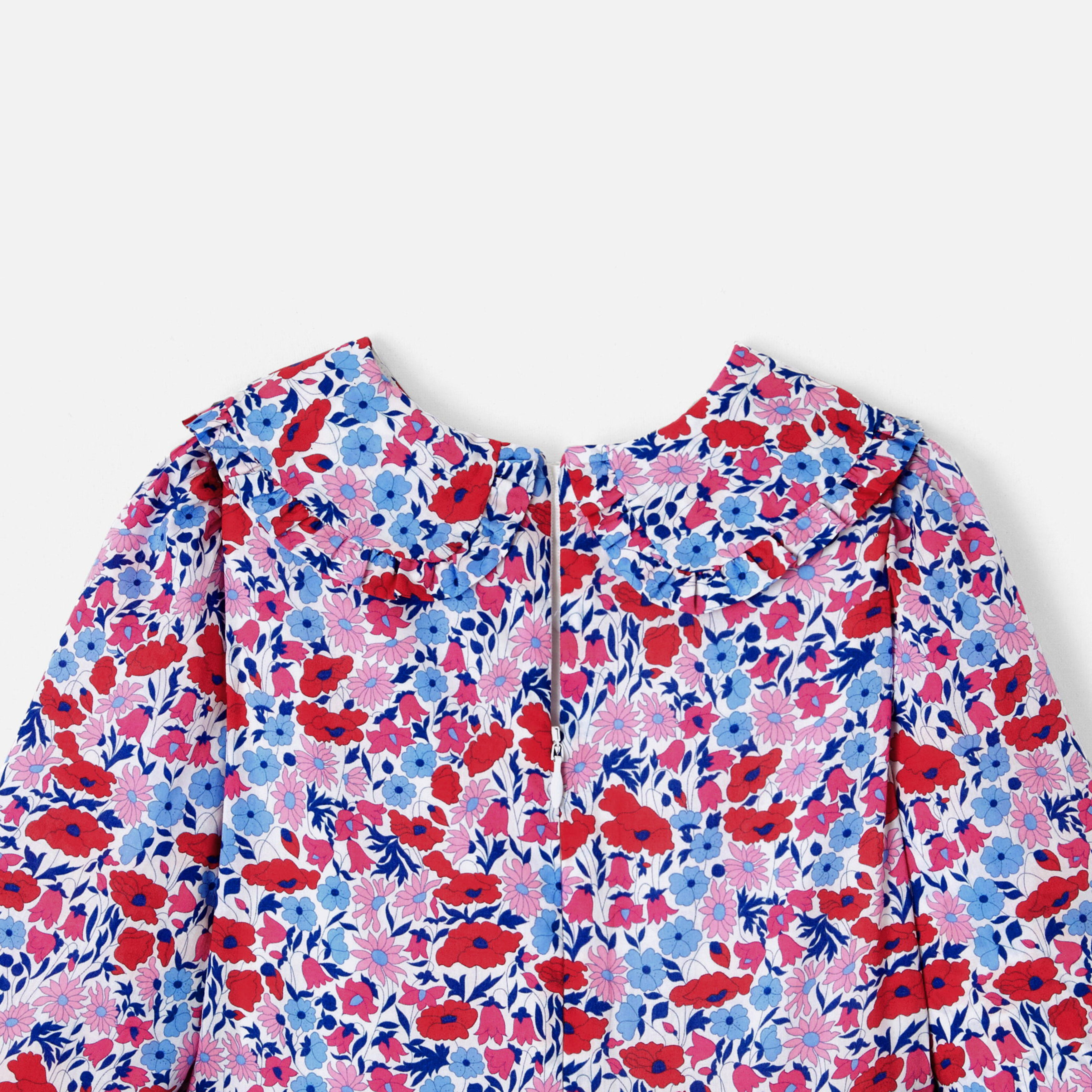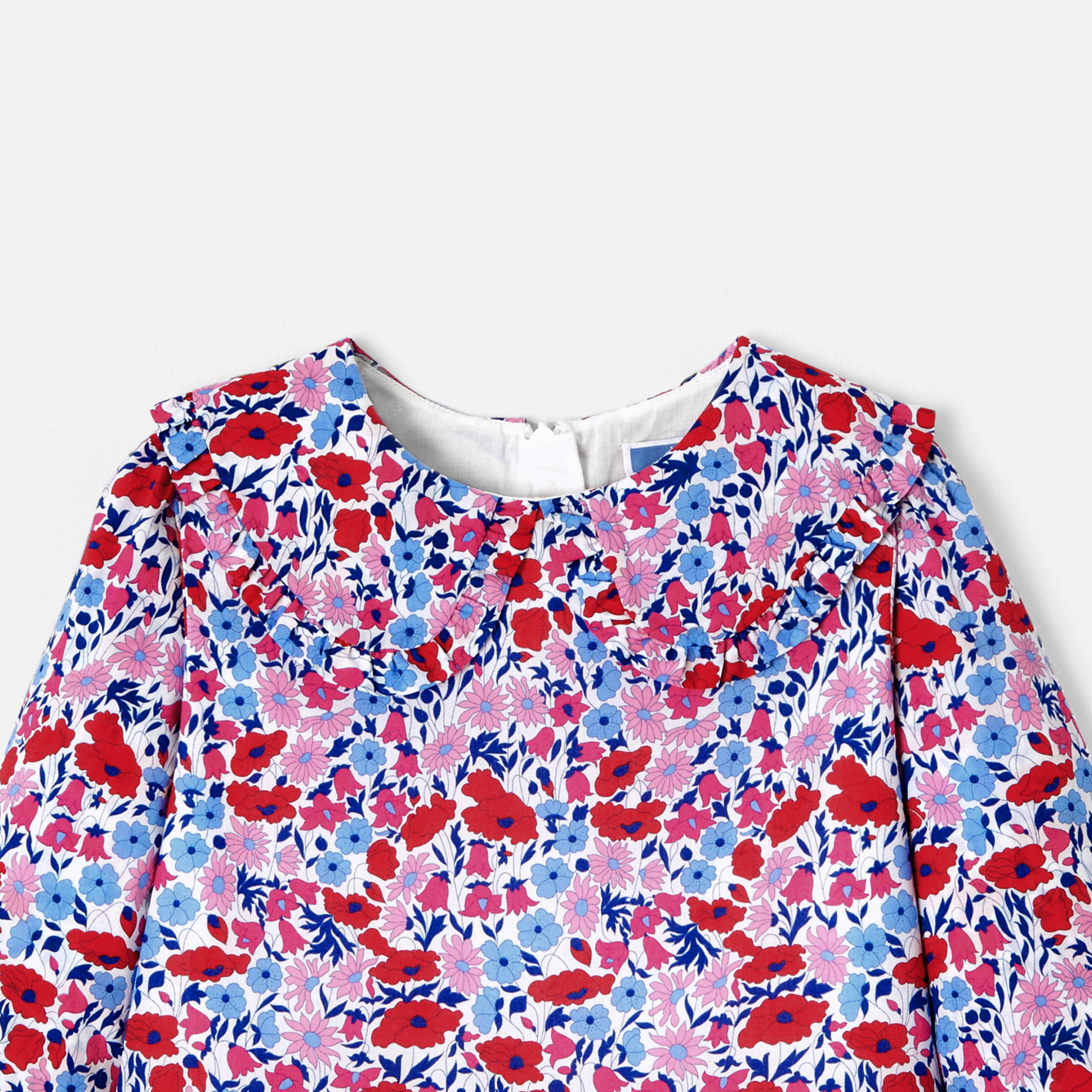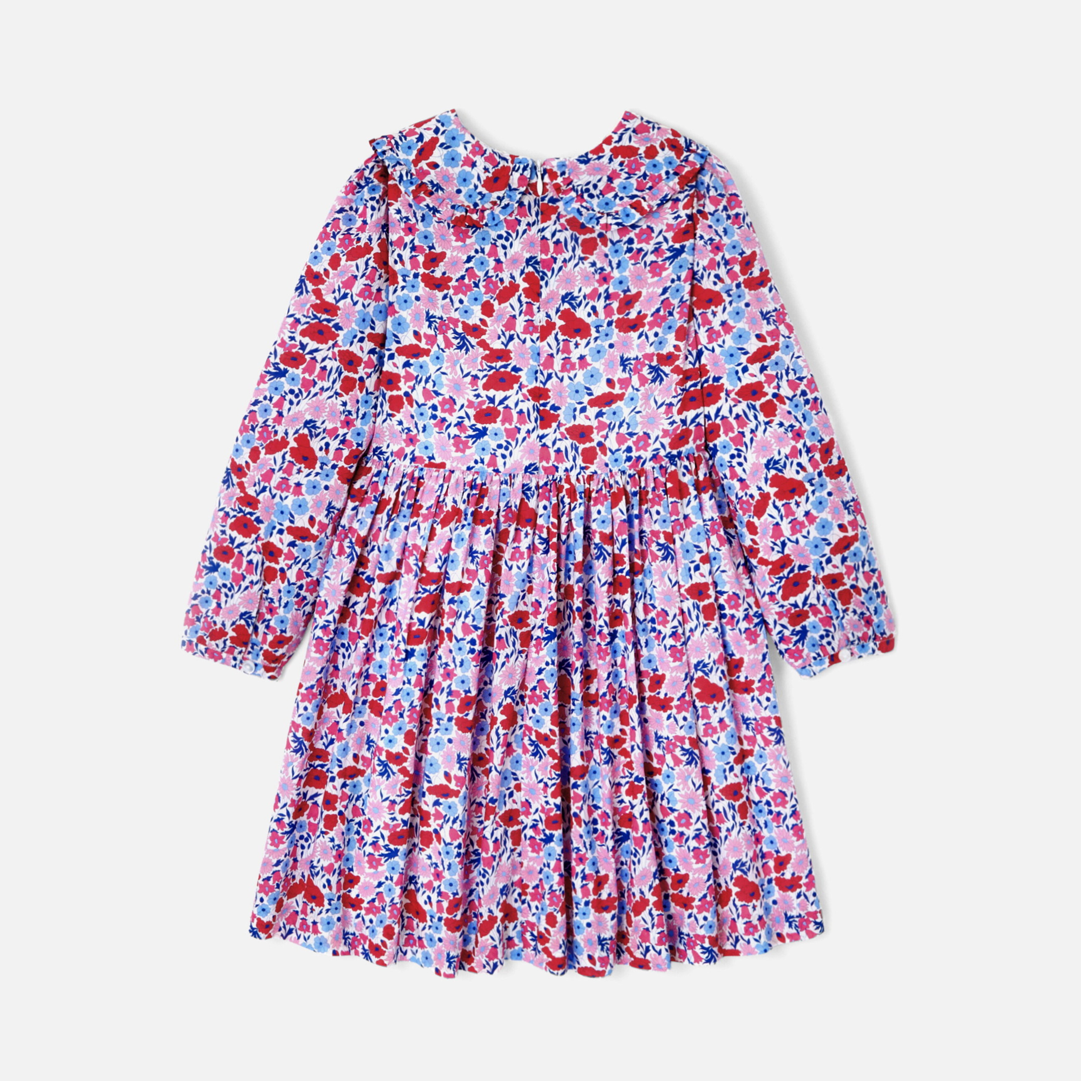 Look elegante e linee impeccabili per quest'abito a maniche lunghe bambina. In un tessuto Liberty con colori vivaci, orlo del colletto con volant, fondo manica più stretto e vita arricciata abbelliscono questo modello autentico da far volteggiare nel cortile della scuola.