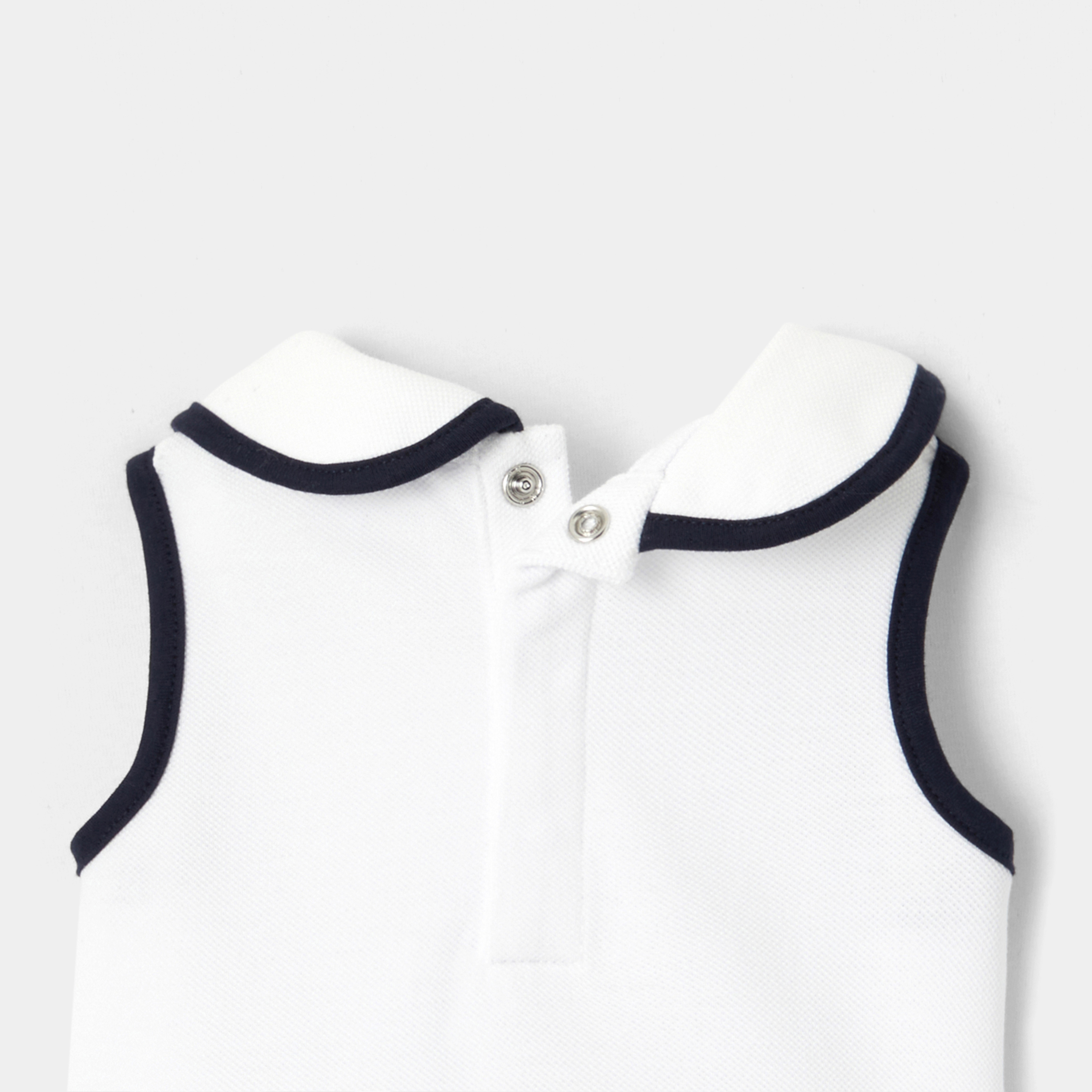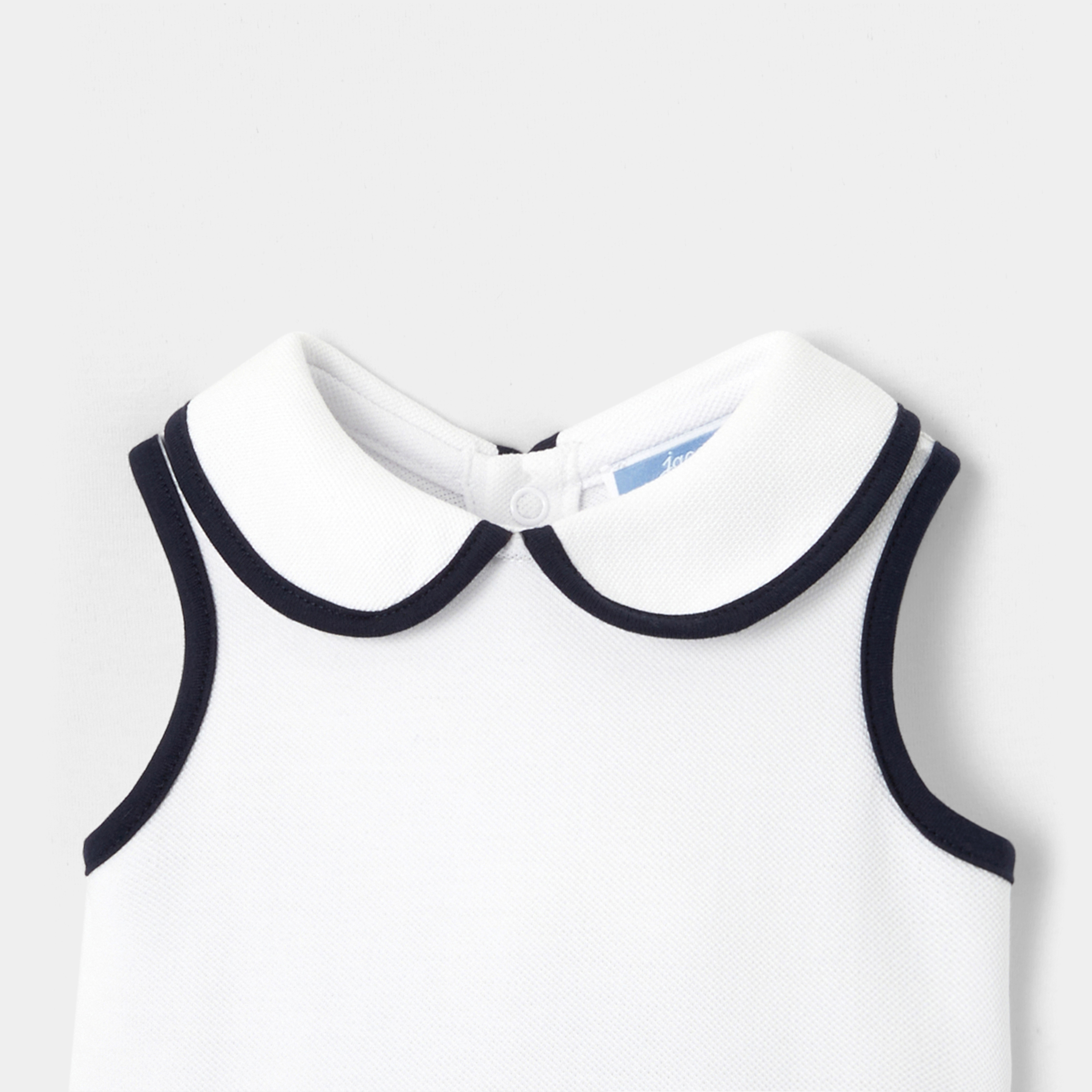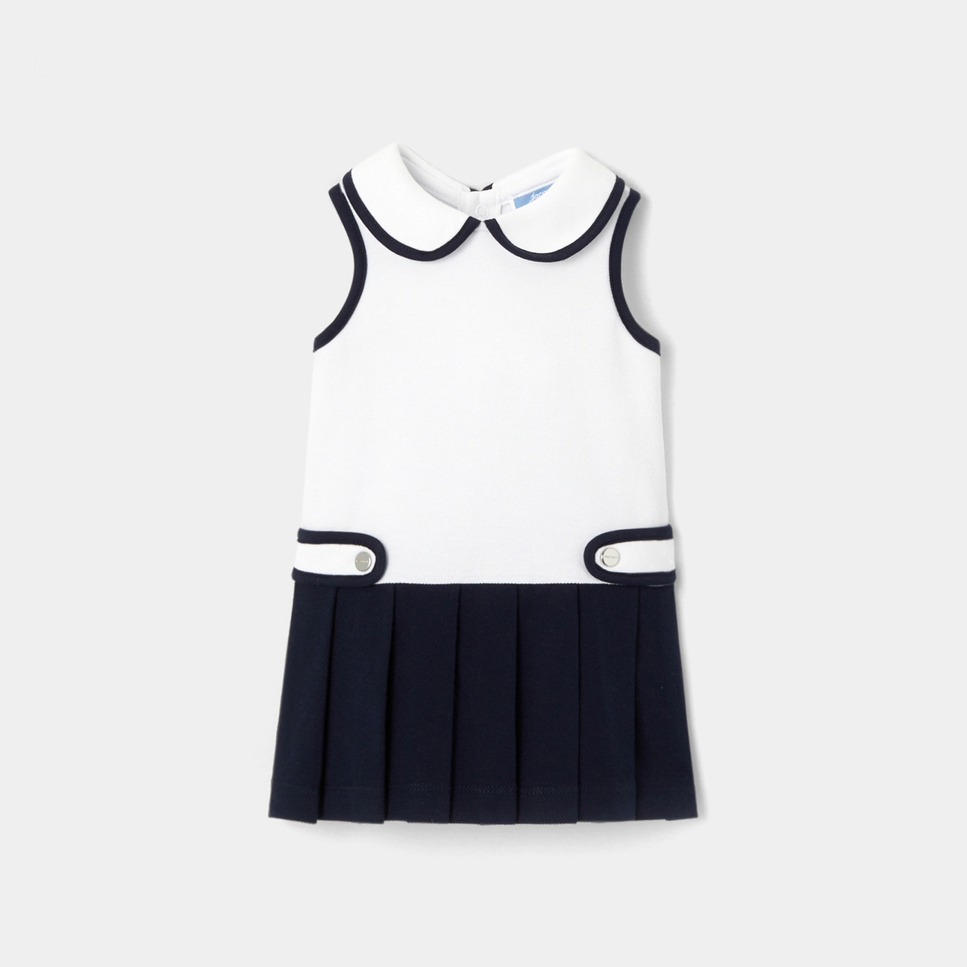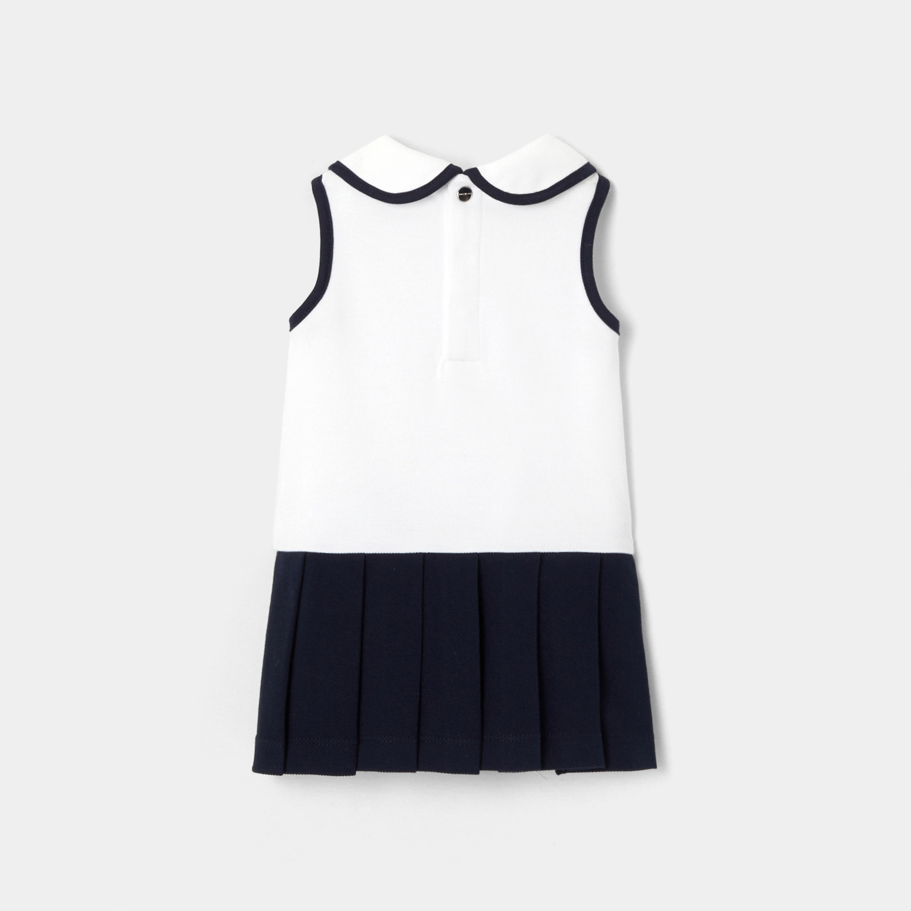 Ispirato al guardaroba sportivo, l'abito bimba di questa stagione è in piqué di cotone biologico. Ornato di un colletto tondo e di un fondo a pieghe, profili a contrasto e linguette decorative in vita completano quest'abito ideale per l'estate.