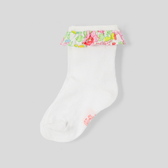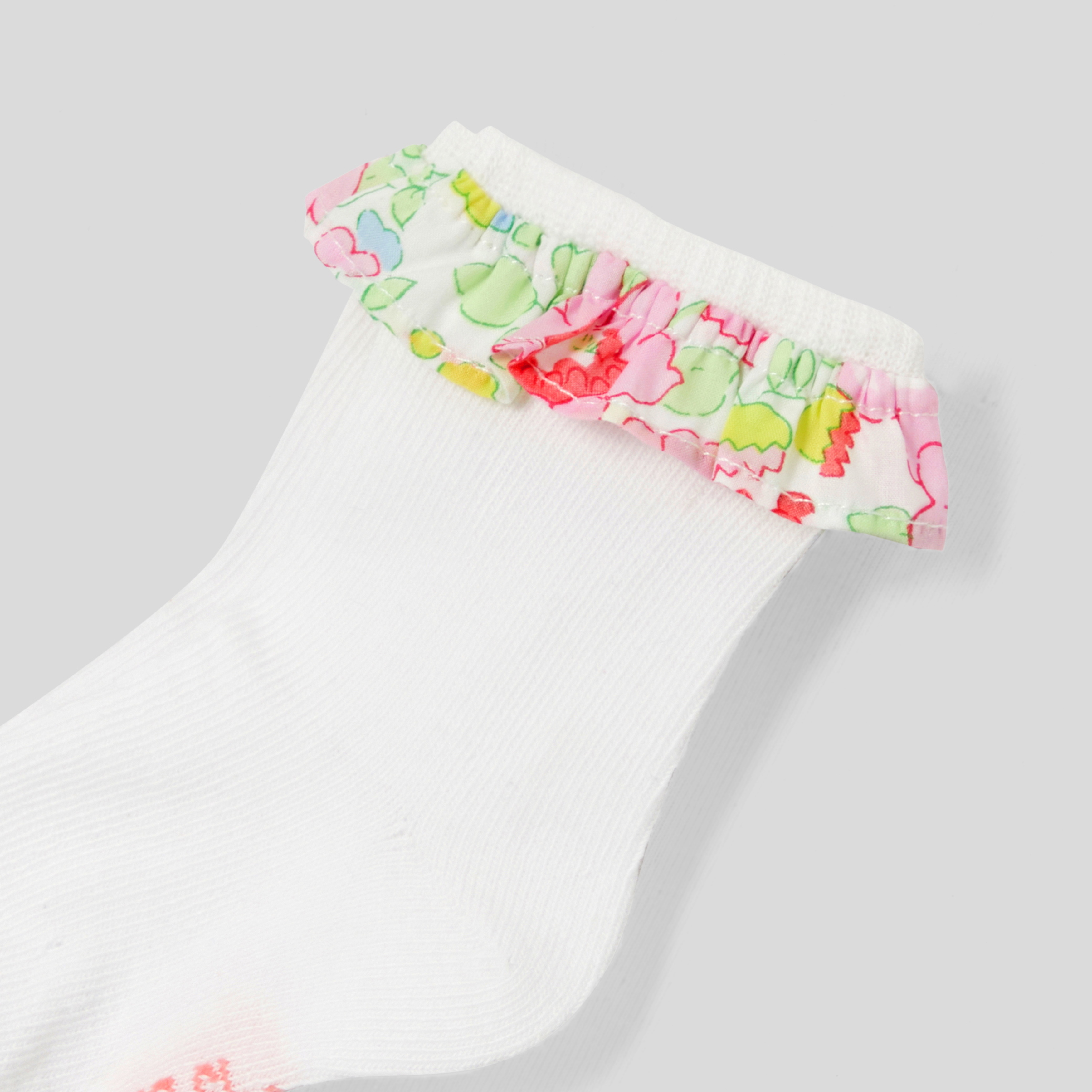 Morbidi ed elasticizzati, questi calzini bimba sono ornati di un bordo con volant in tessuto Liberty. Coordinati alla collezione di abbigliamento, sono perfetti per la primavera.