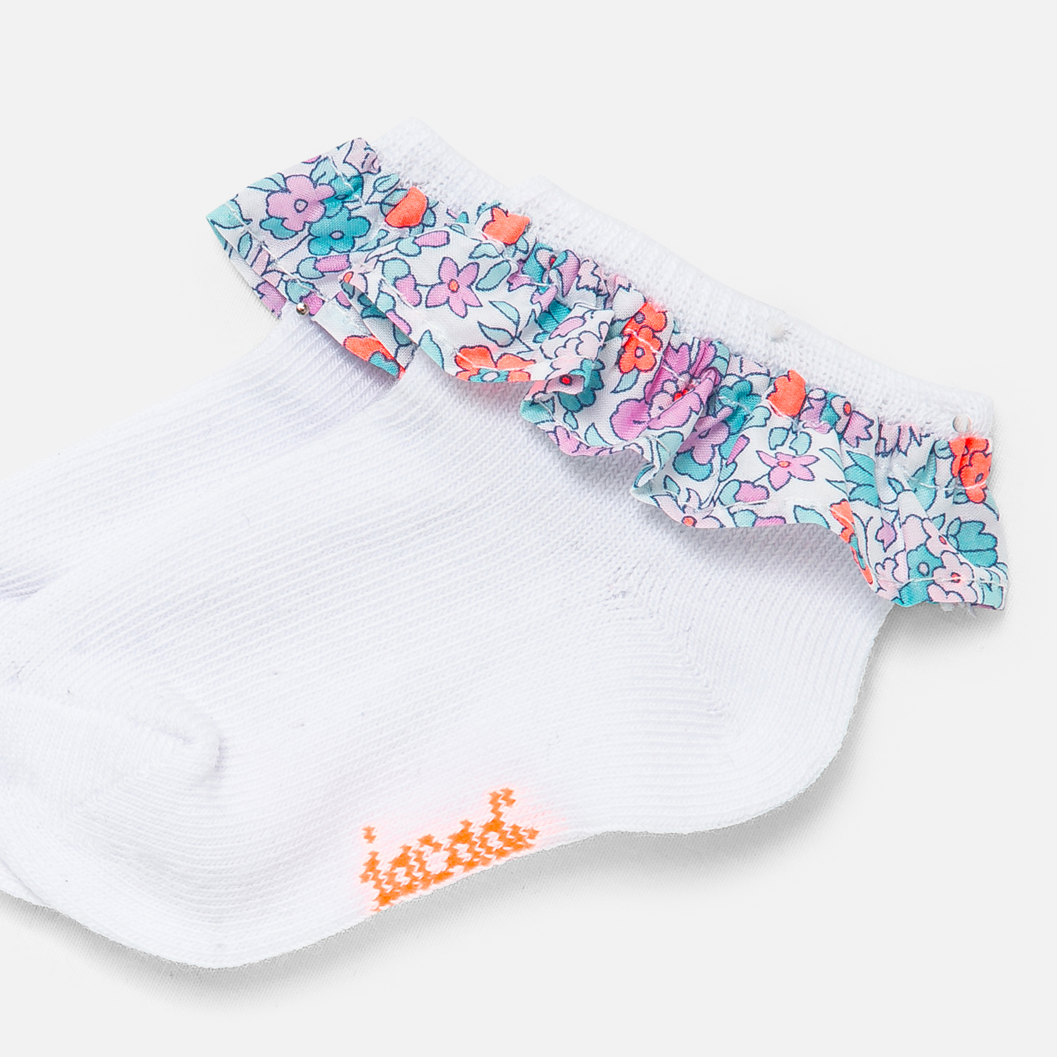 I calzini bimba di questa stagione sono ornati di un volant in tessuto Liberty Fabrics. Perfetti per completare un outfit quotidiano o un look da cerimonia, abbinali a graziose scarpe con cinturino a T.