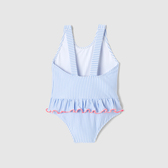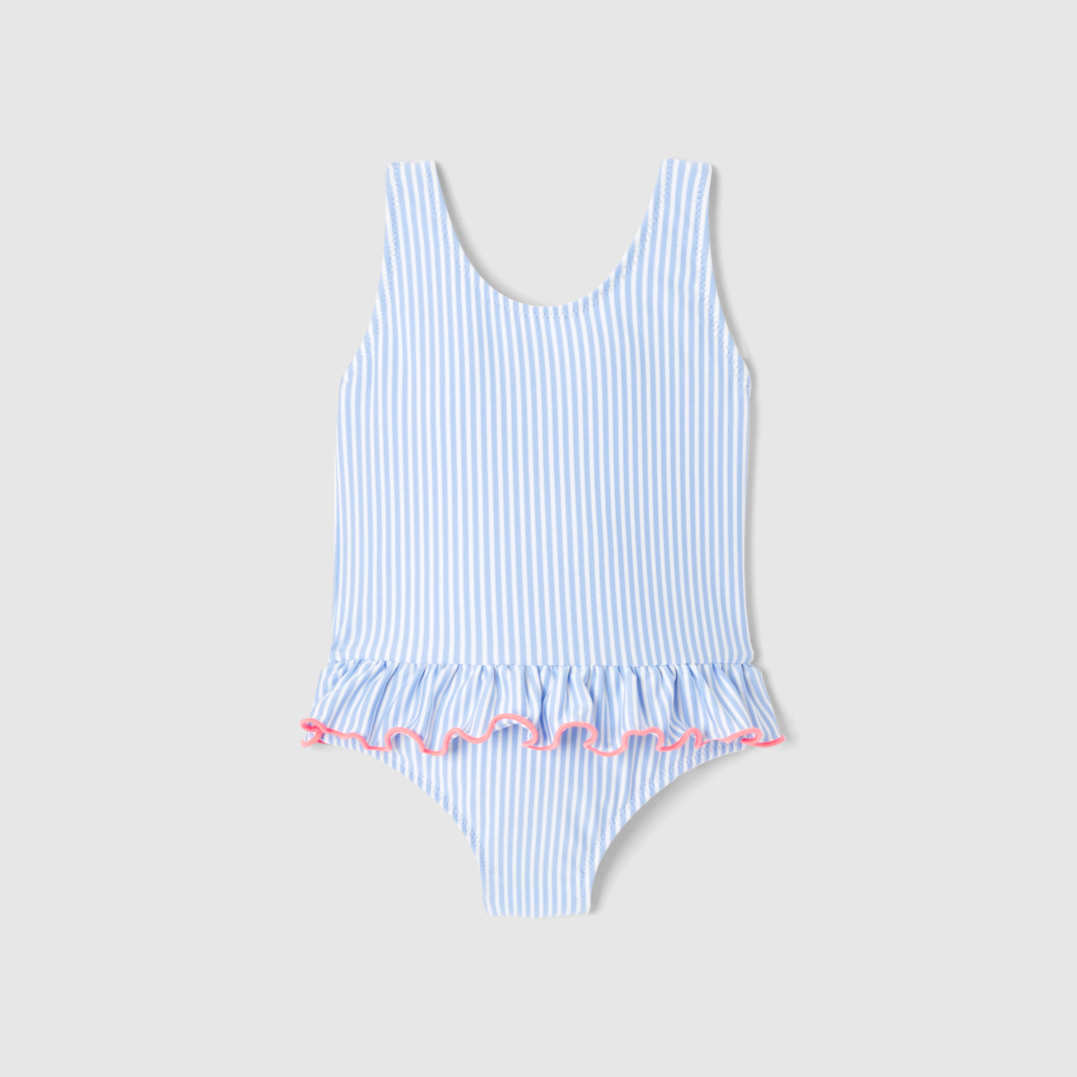 Elegante e grafico, questo costume da bagno bimba è abbellito da un inserto con volant decorato con un punto bourdon fluo. Ideale per le vacanze e la piscina, non può mancare nel guardaroba estivo delle bimbe.