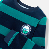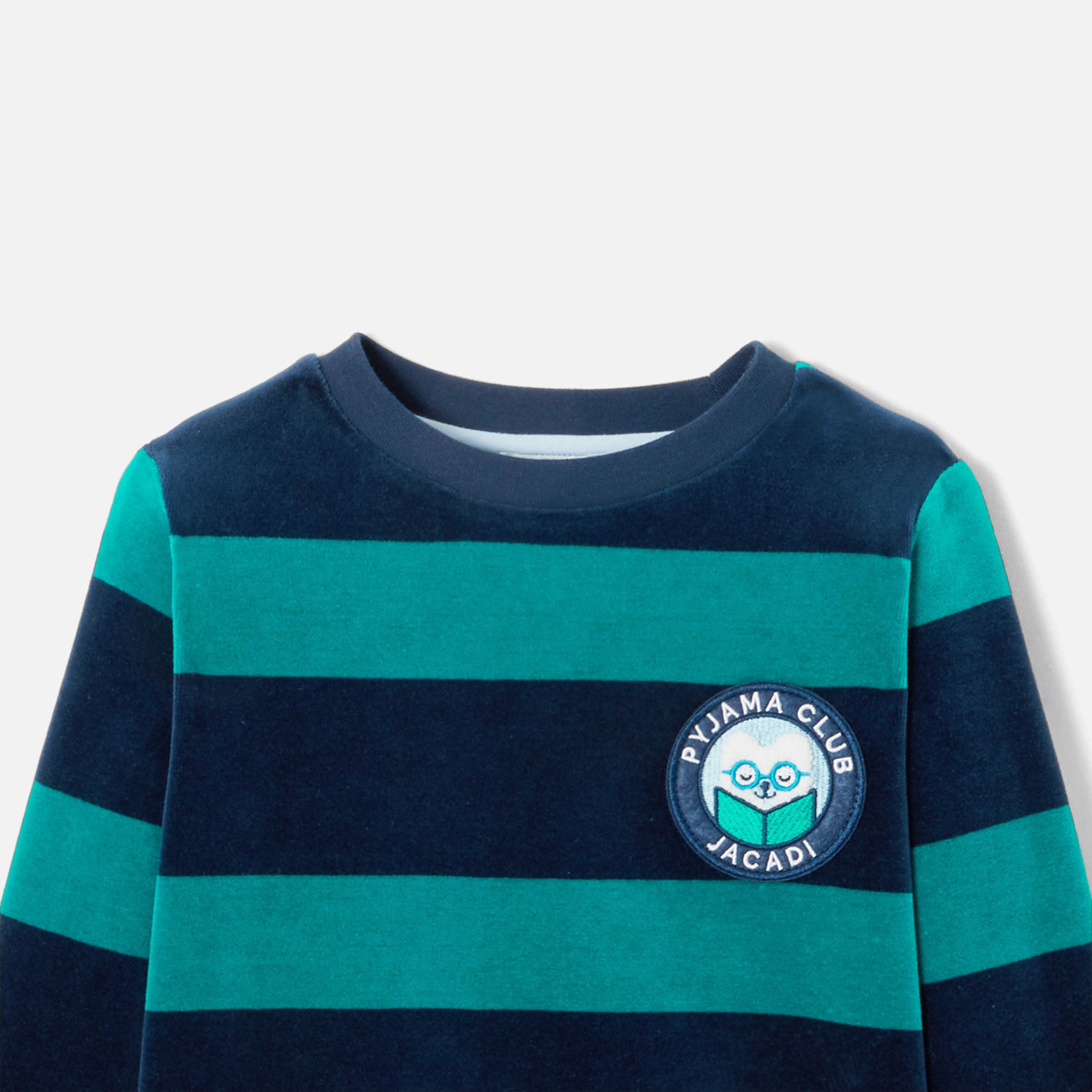 Il pigiama bambino di questa stagione è in morbido velluto. Composto da una t-shirt a maniche lunghe ornata di un motivo a righe, e da pantaloni con elastico in vita, è abbellito da un ricamo con la scritta "Jacadi Club". Ideale per l'autunno, promette sonni all'insegna della dolcezza.