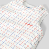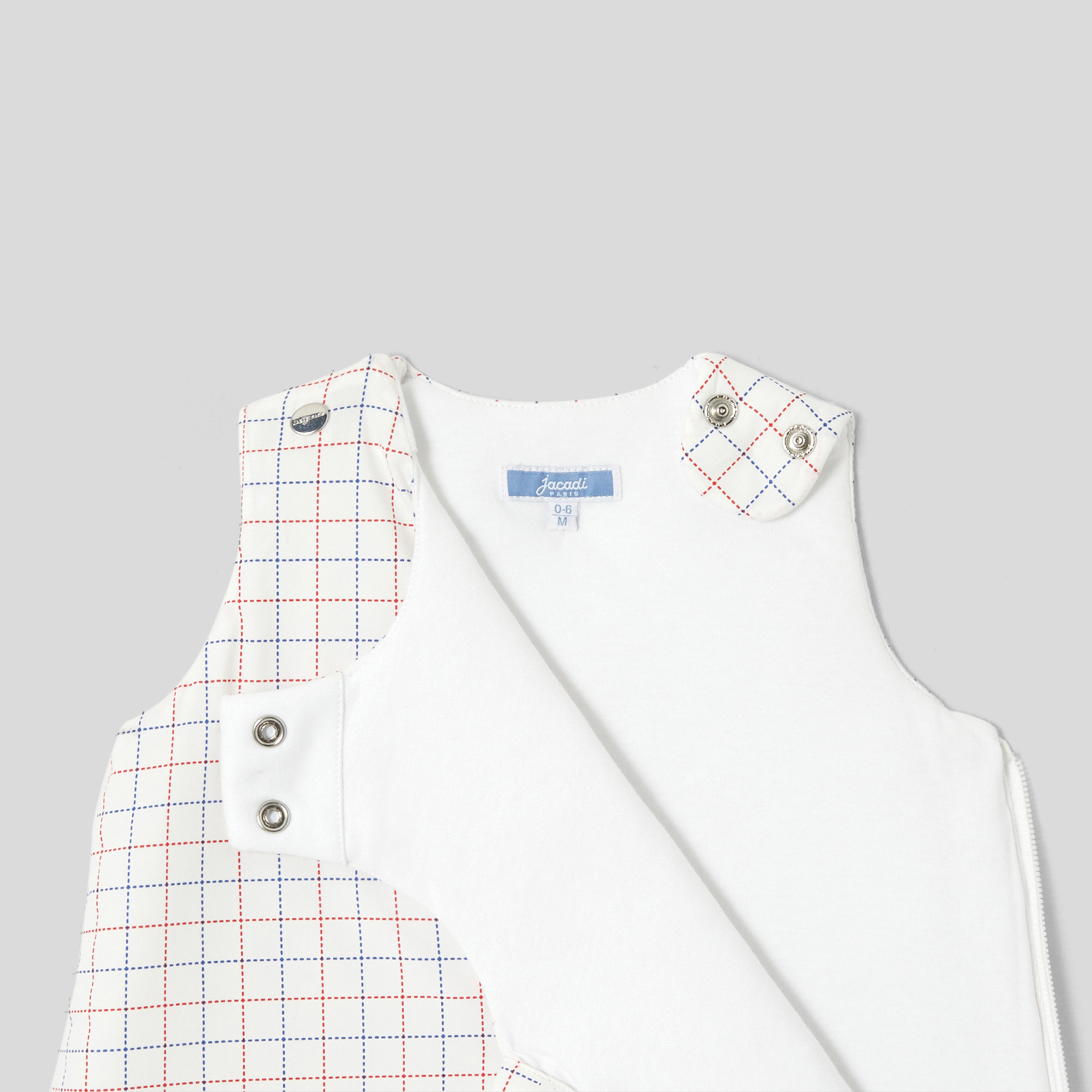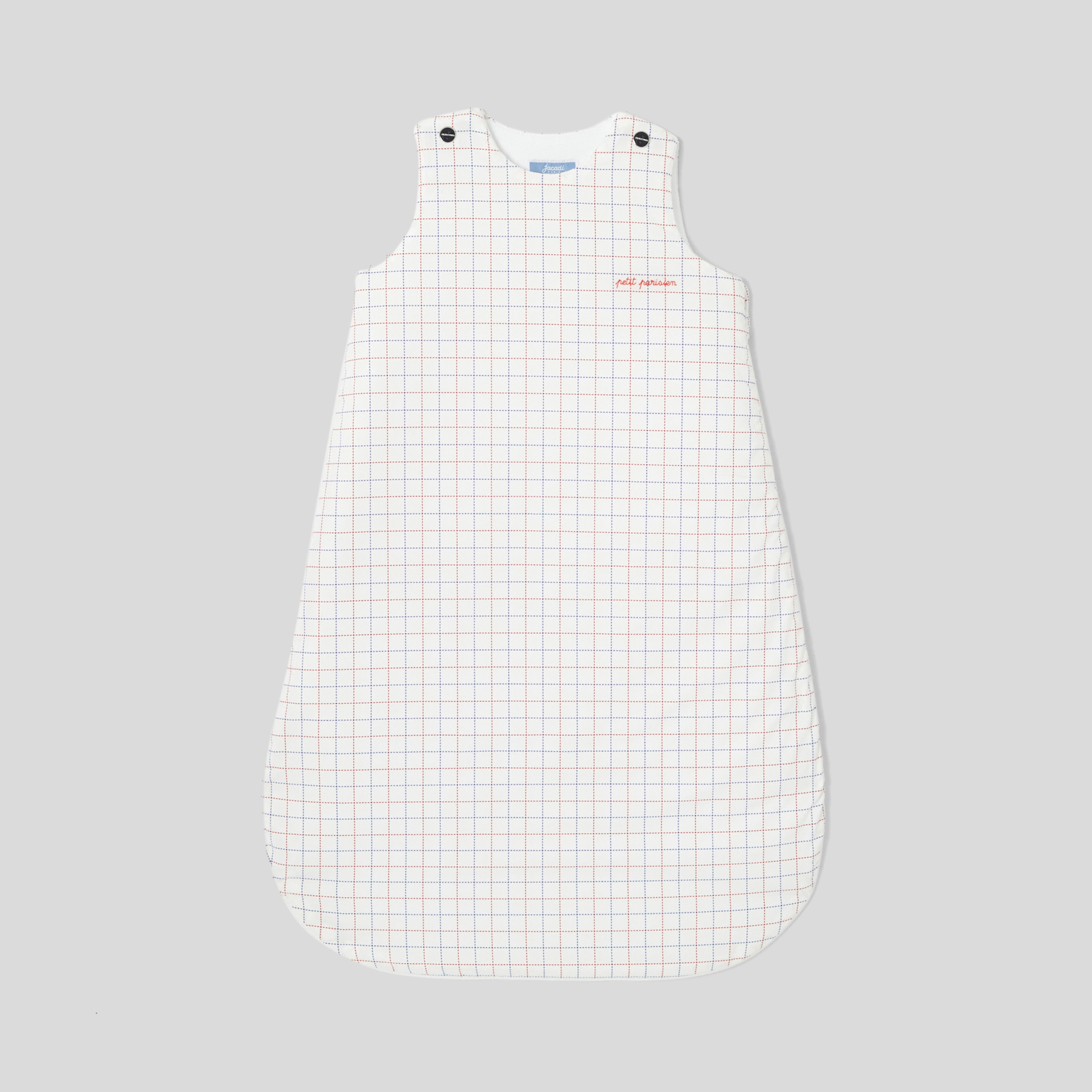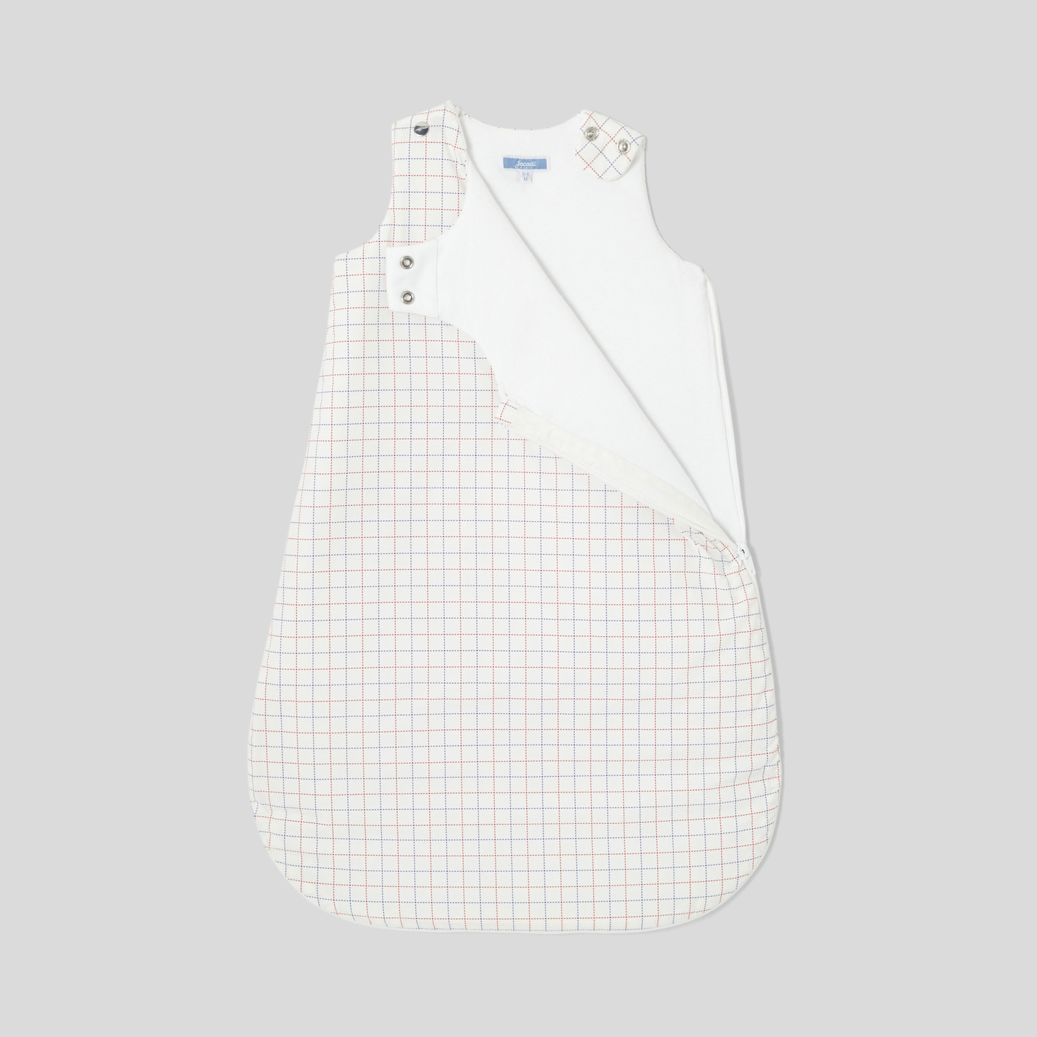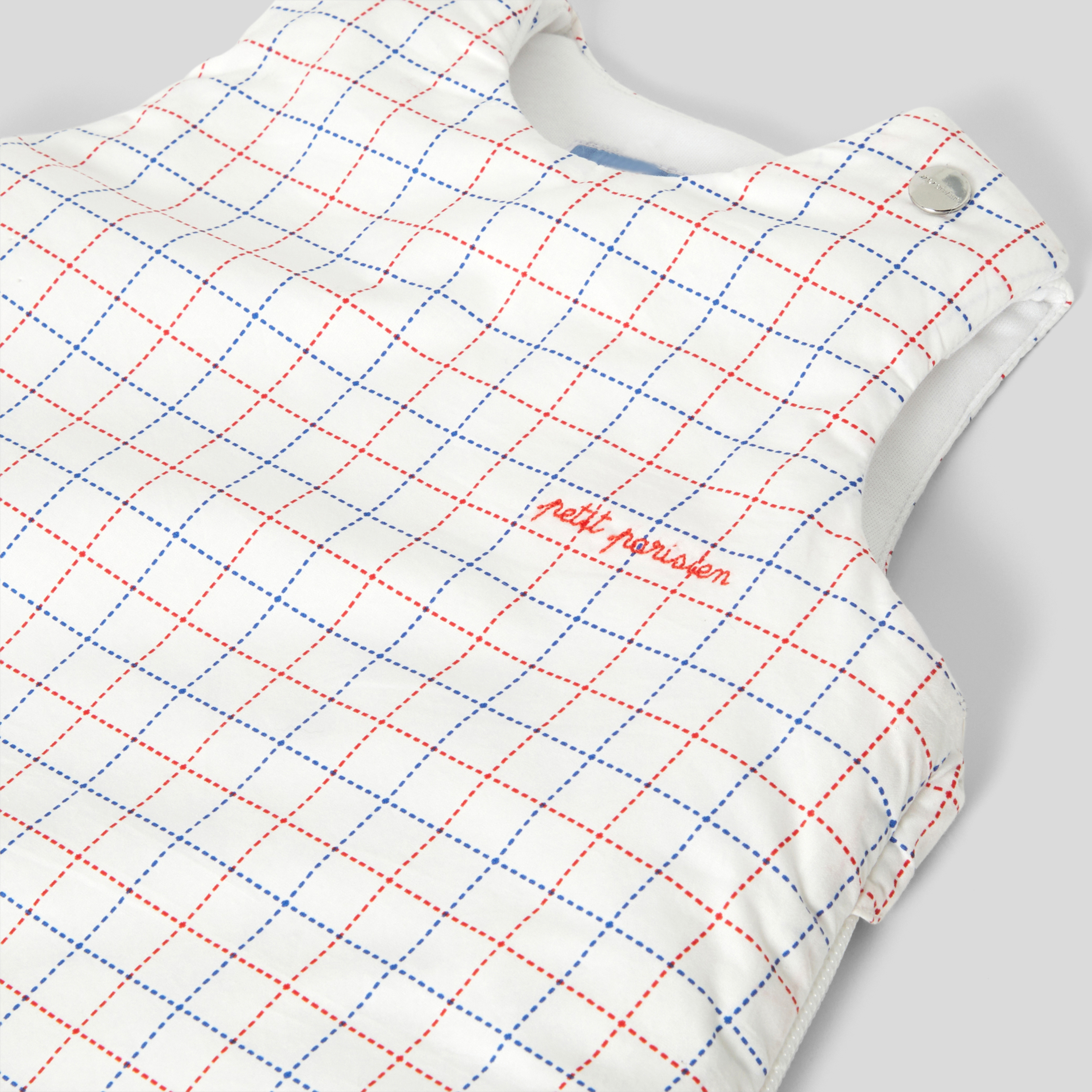 Elegante e grafico, il sacco nanna è disponibile in popeline di cotone e imbottito per il massimo comfort. Dinamizzato da un motivo a quadri e da un piccolo ricamo, è facile da indossare grazie agli automatici sulle spalle e alla zip laterale.