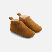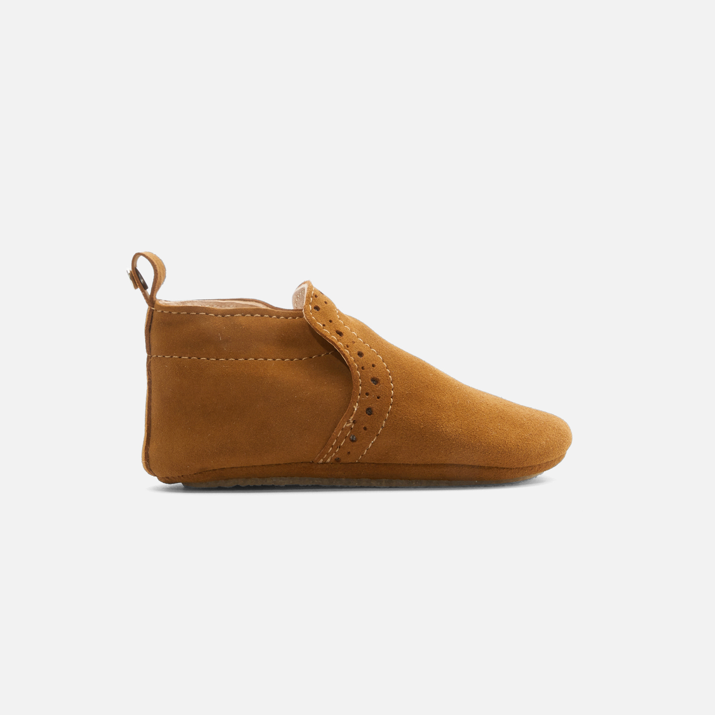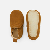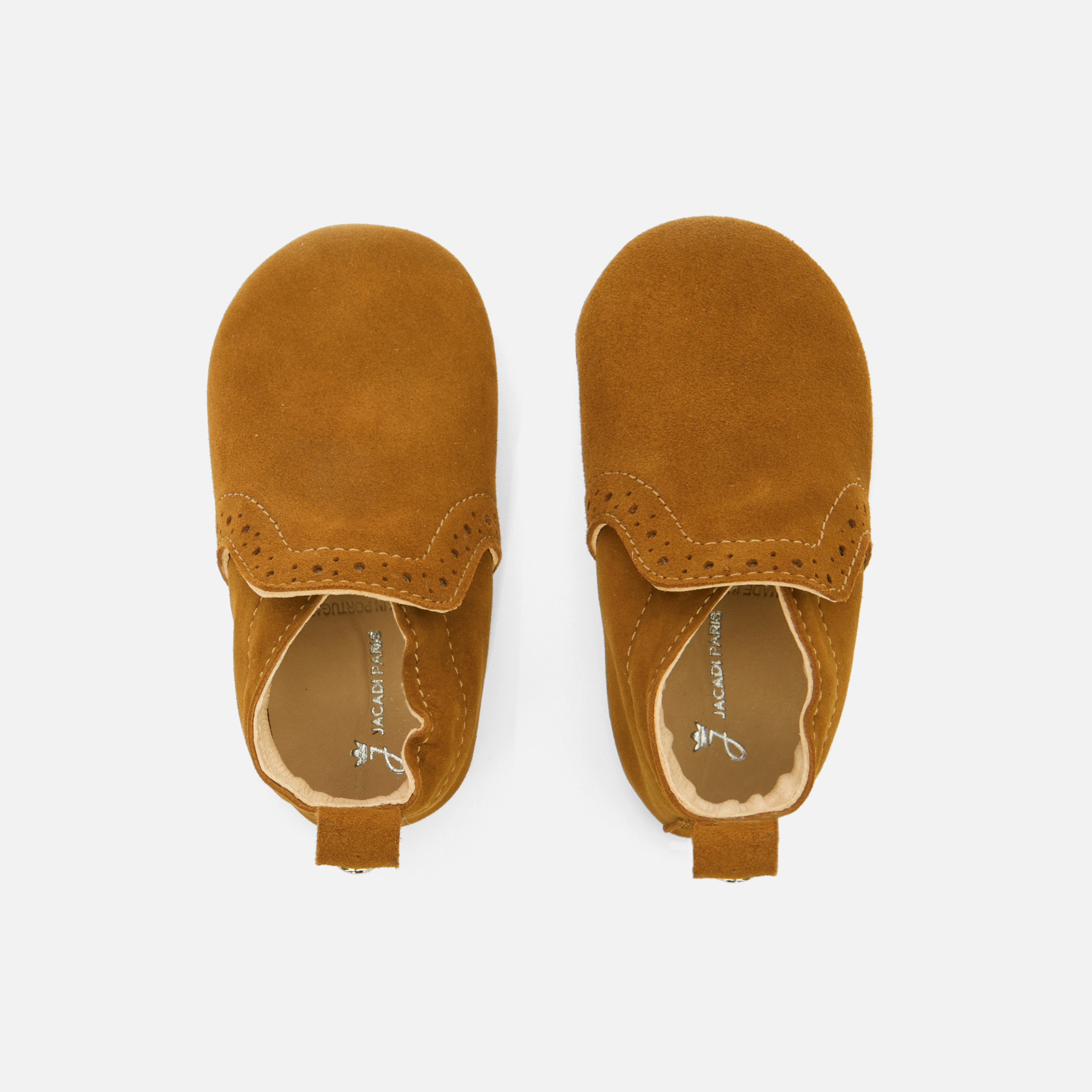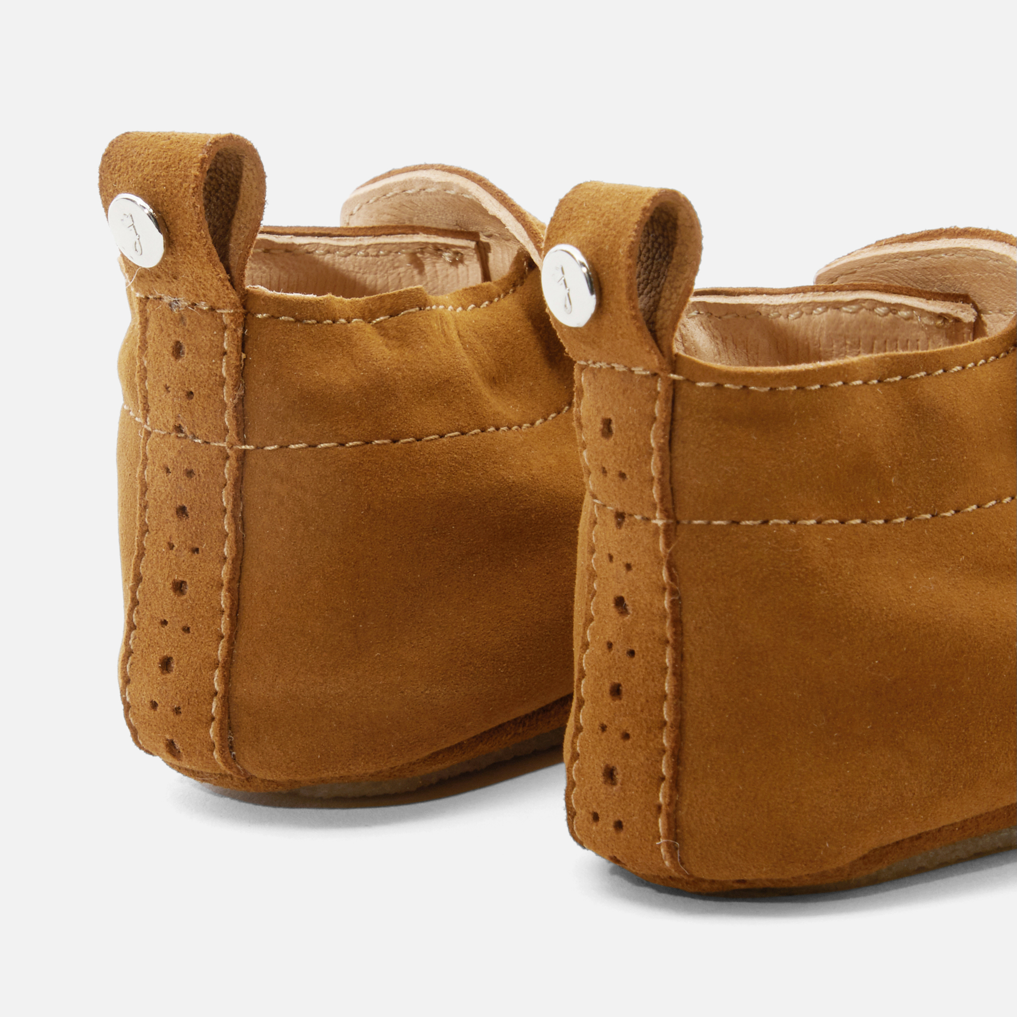 Immancabili per l'outfit quotidiano, le scarpine neonato di questa stagione sono modernizzate da una crosta di cuoio di un'elegante tonalità autunnale. Ornate di graziosi trafori e facili da infilare grazie all'ampia apertura con elastico, la suola antiscivolo è adatta ai bimbi che iniziano ad alzarsi in piedi. Perfette per il nido e la casa, saranno un bel regalo di nascita.