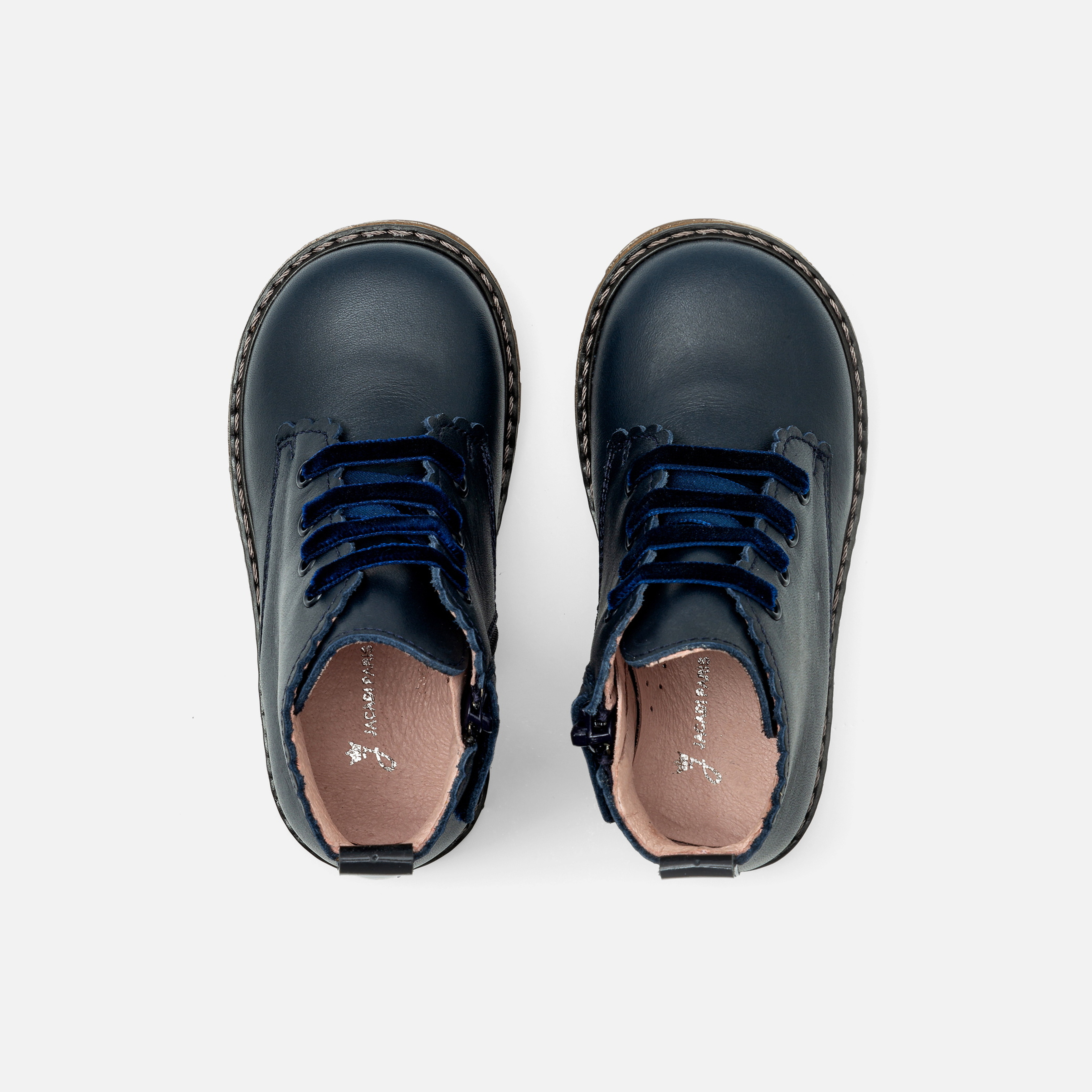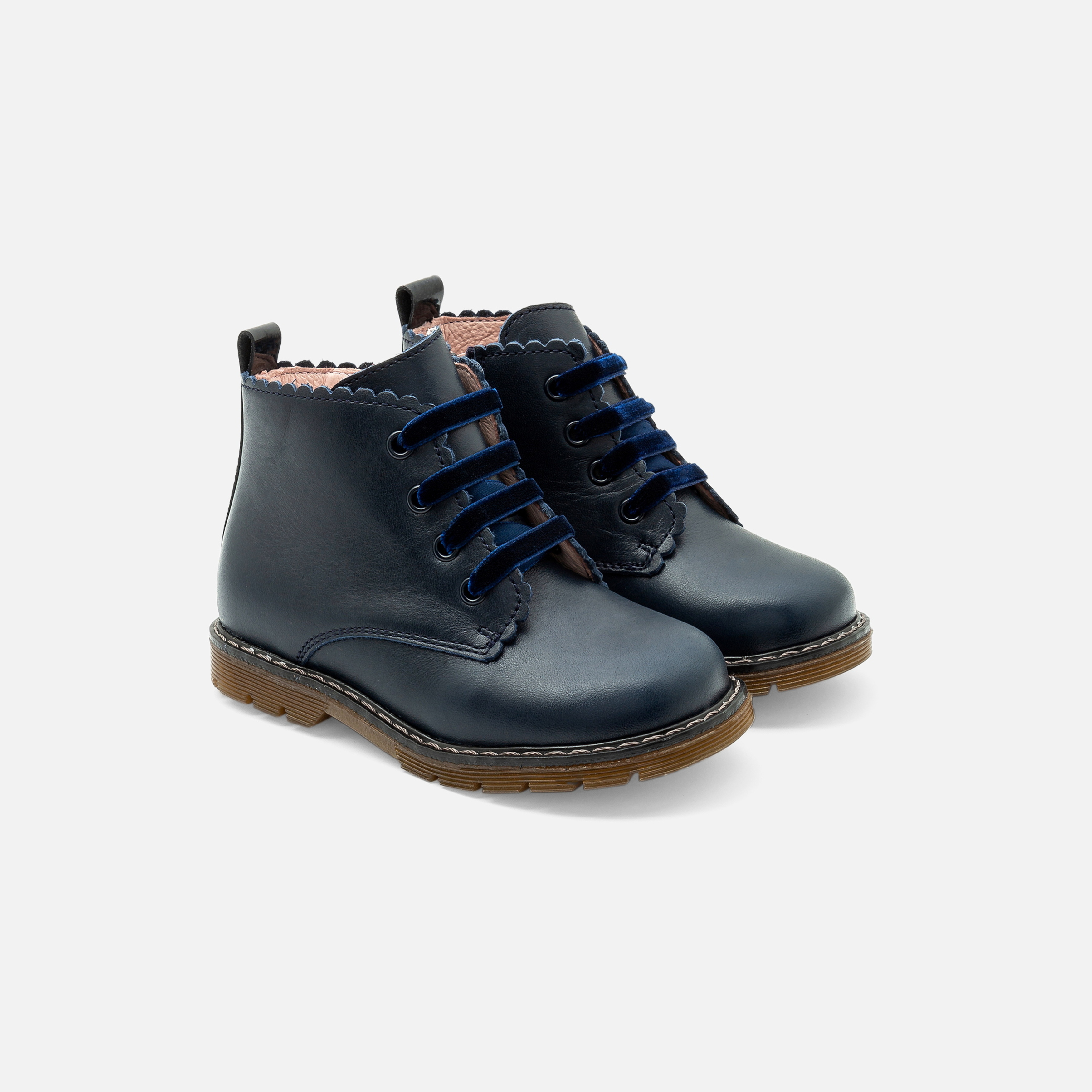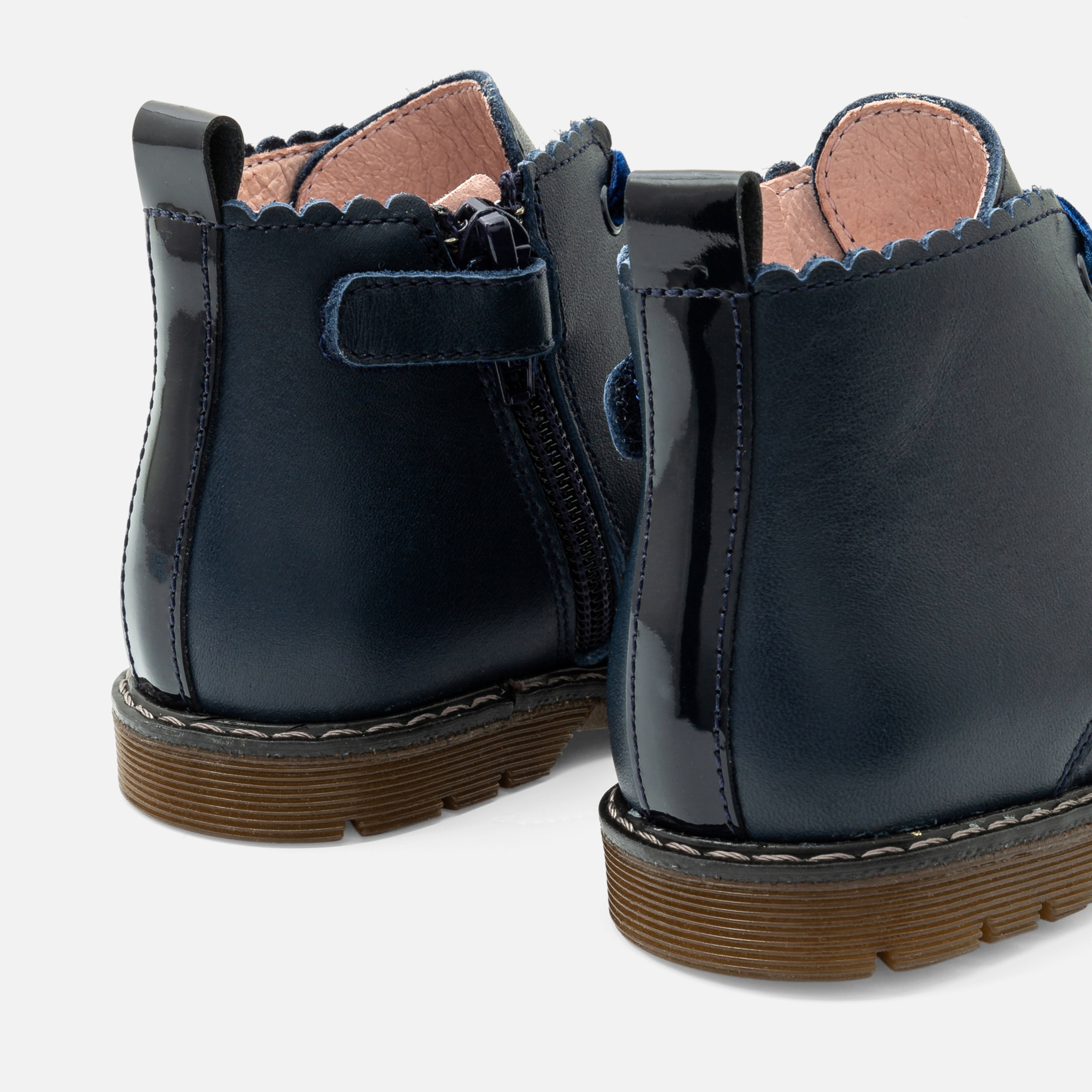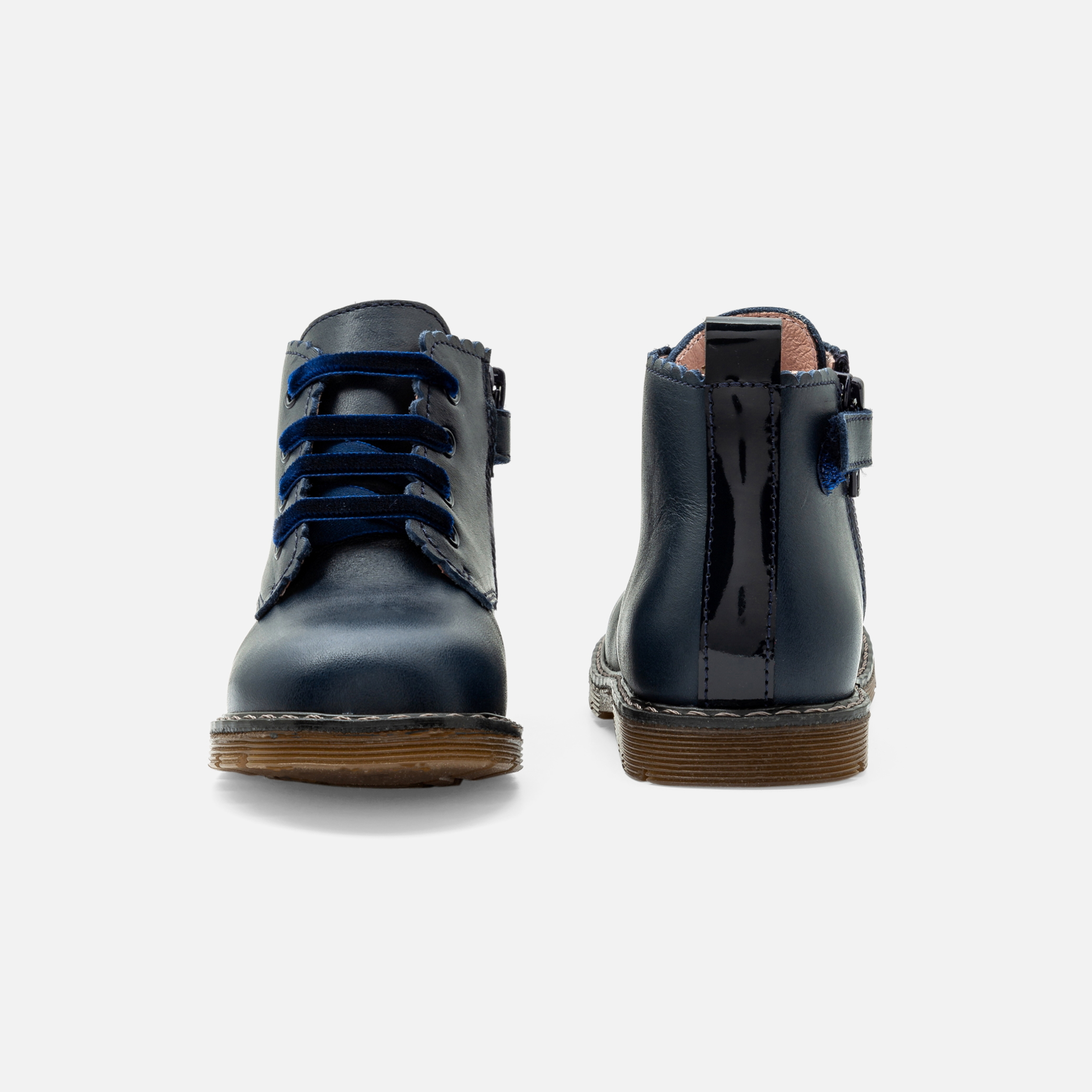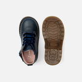 Ispirati al guardaroba inglese, gli scarponcini bimba puntano su un look grintoso per il ritorno al nido. In pelle liscia e facili da infilare grazie all'ampia apertura, bordo smerlato e suola dentellata dinamizzano questo modello da indossare per il nido con una blusa a righe e un paio di shorts in denim.