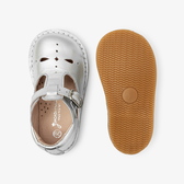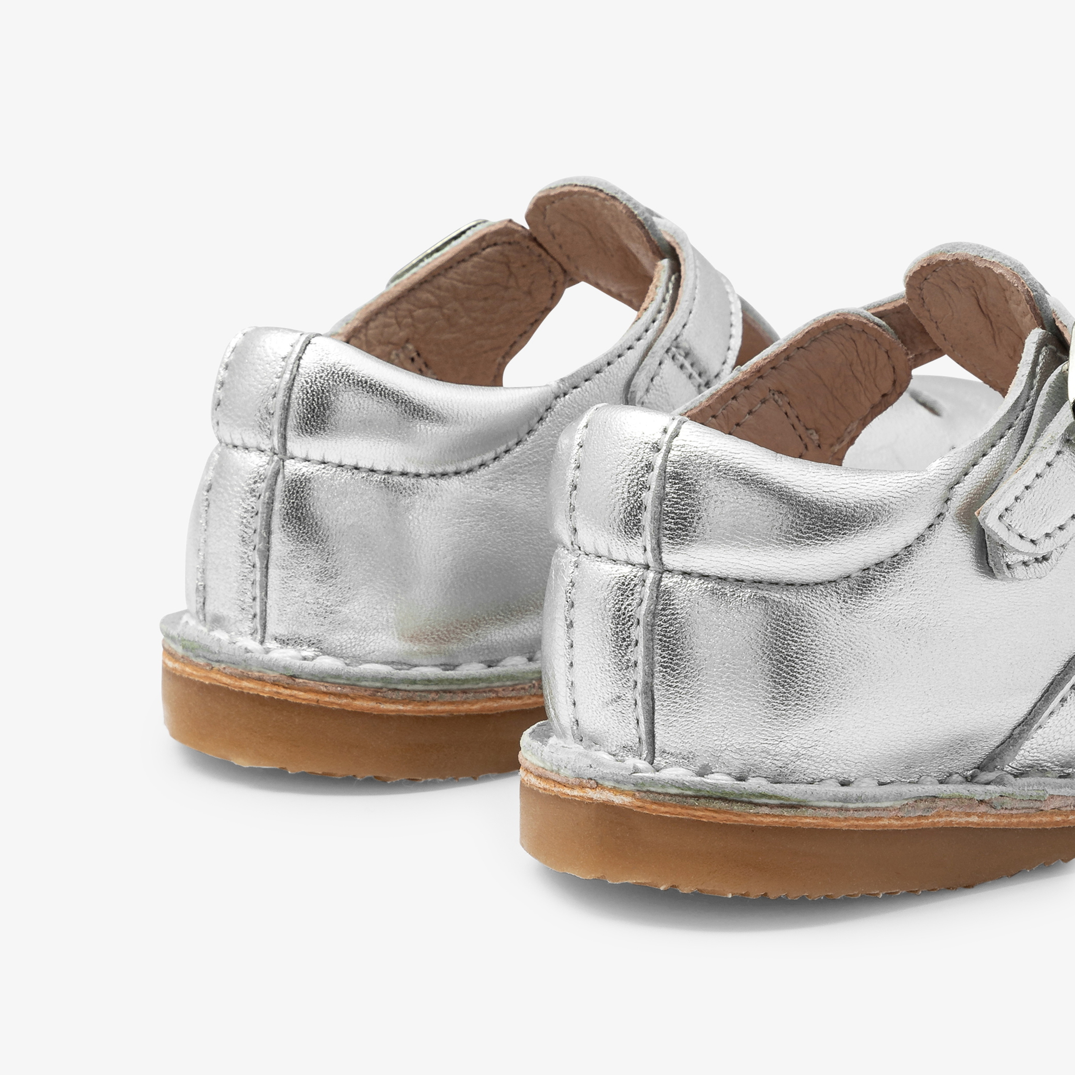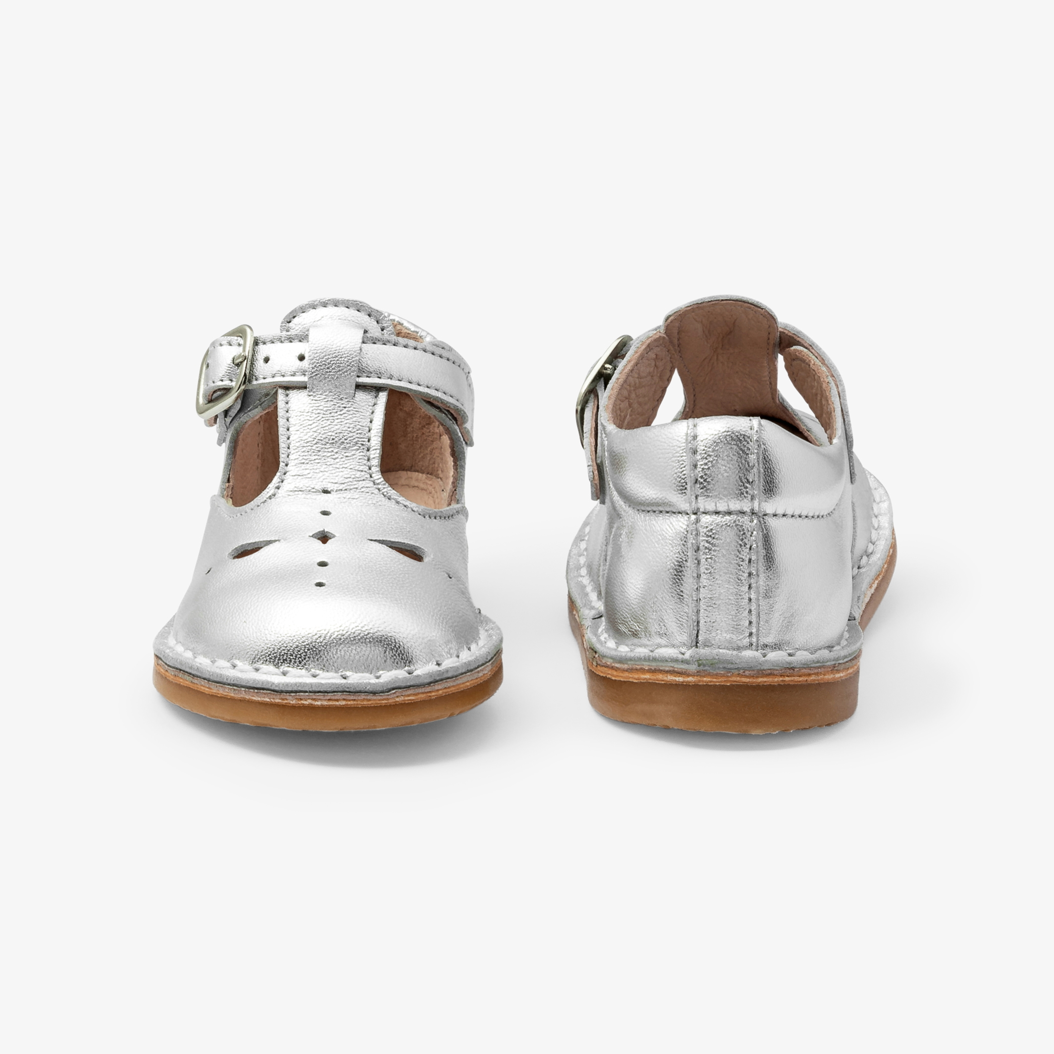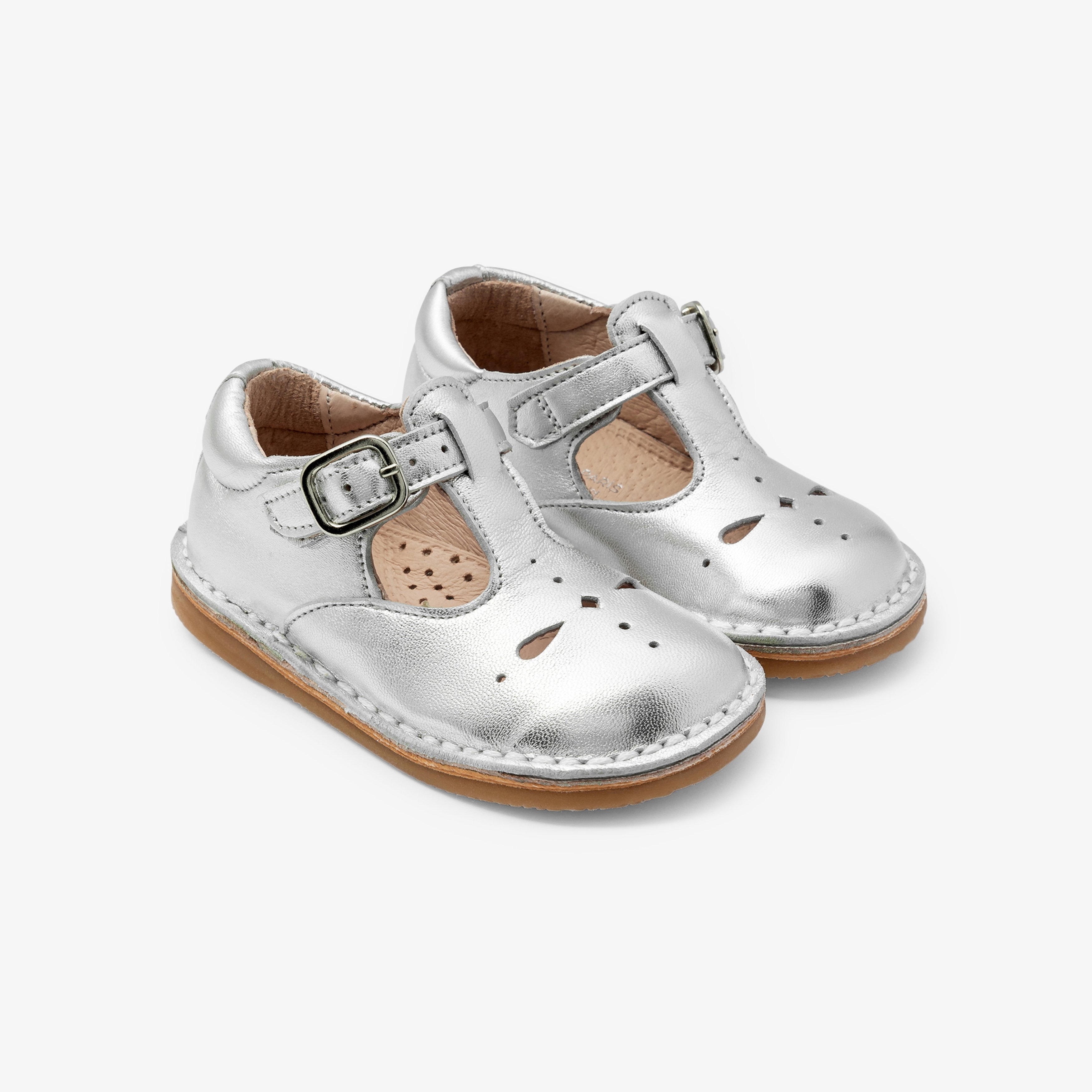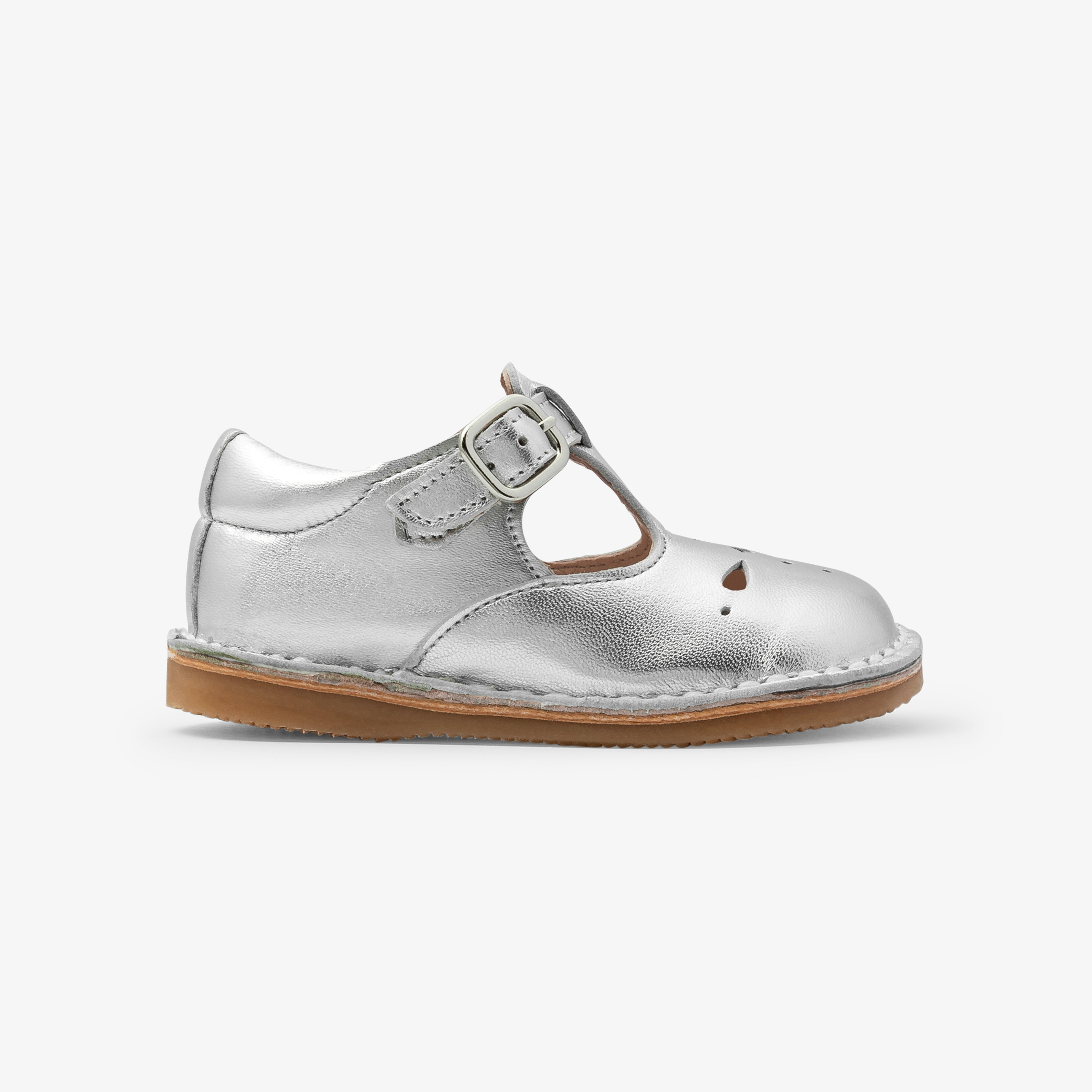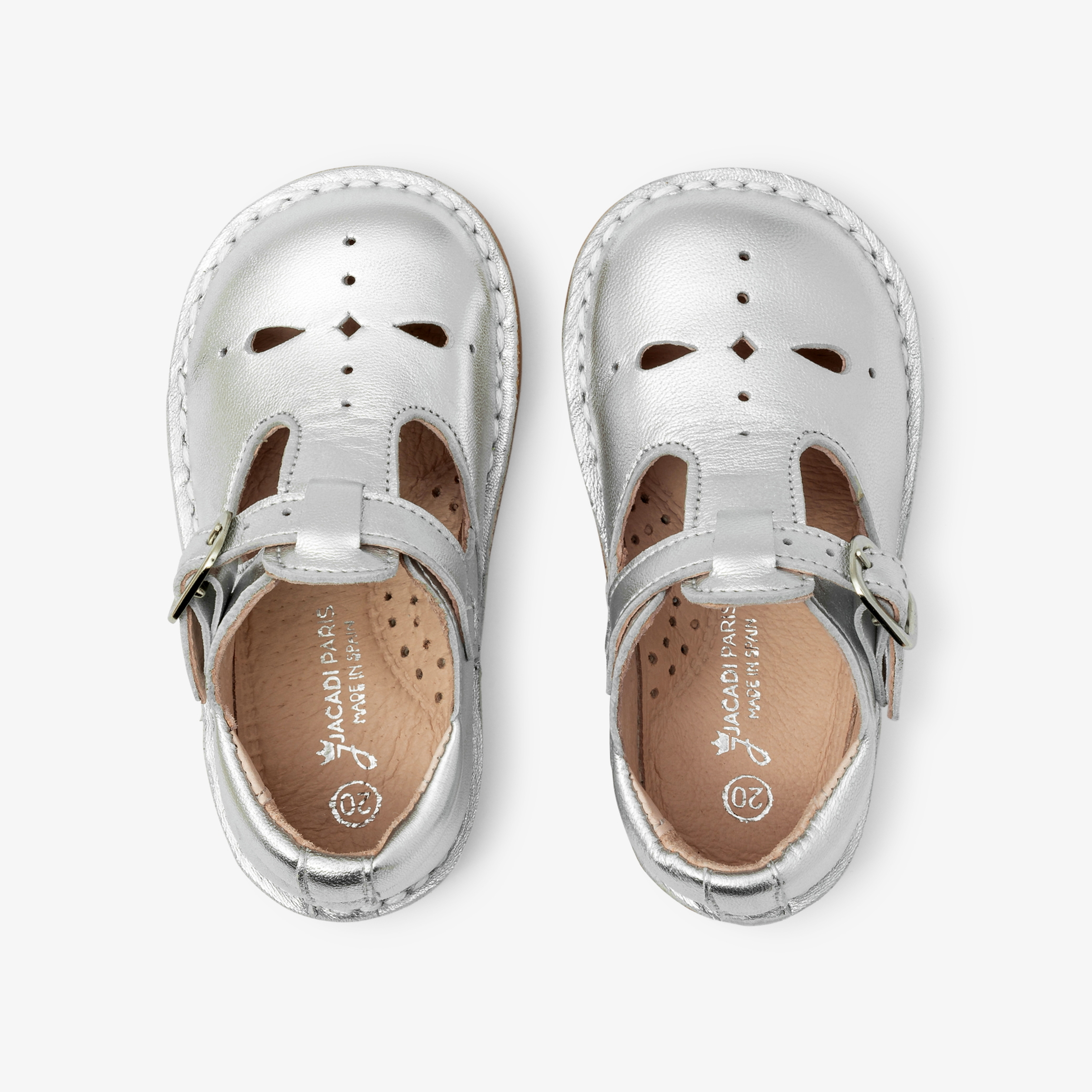 I nostri stilisti hanno rielaborato le linee delle scarpe con cinturino a T per creare un modello fresco e moderno. In pelle argentata e impreziosite da graziosi trafori sulla punta del piede, accompagneranno i primi passi delle bimbe. Indossato all'inizio di stagione con un abito o una tutina per un look dal fascino parigino, questo modello è una bella idea regalo per i suoi primi passi.